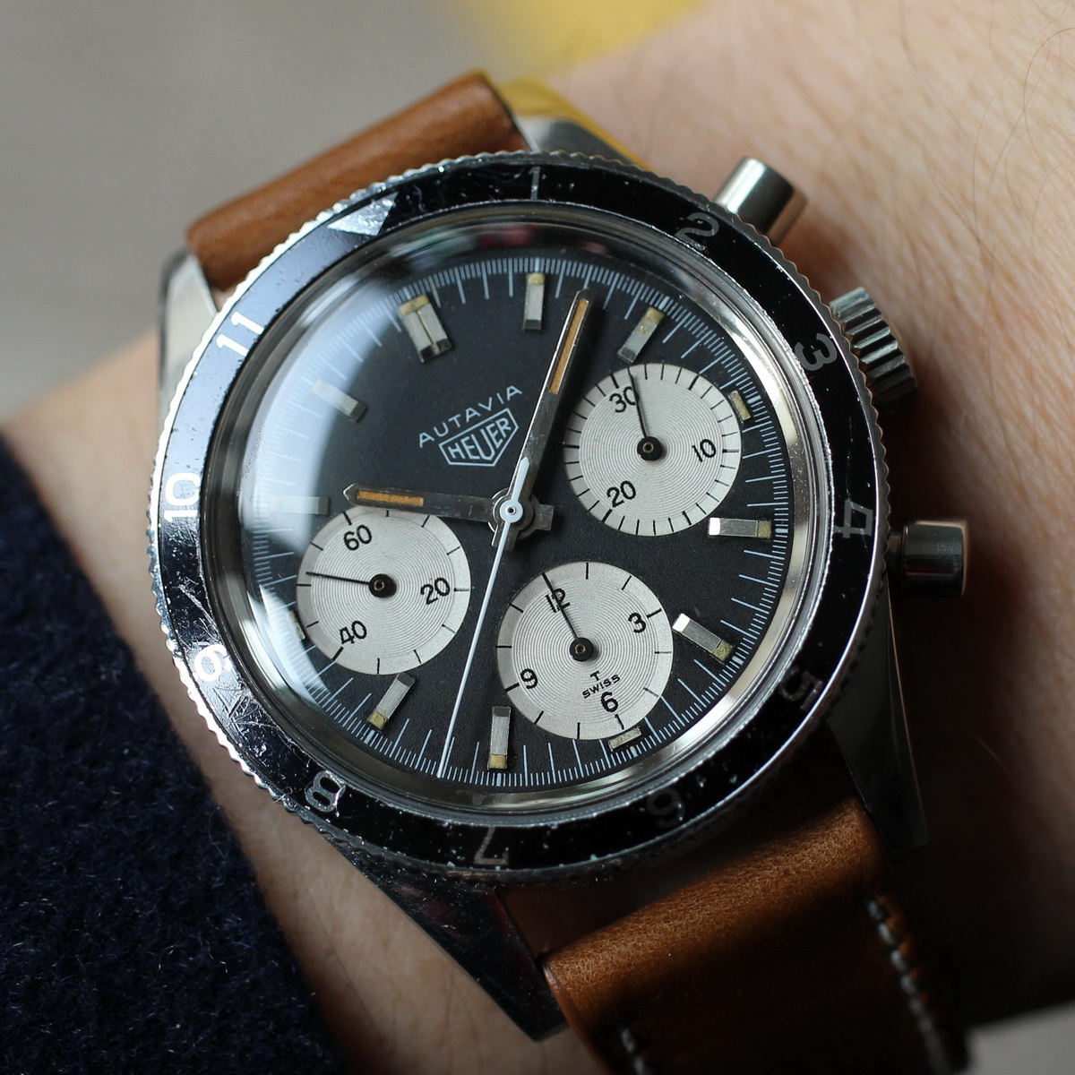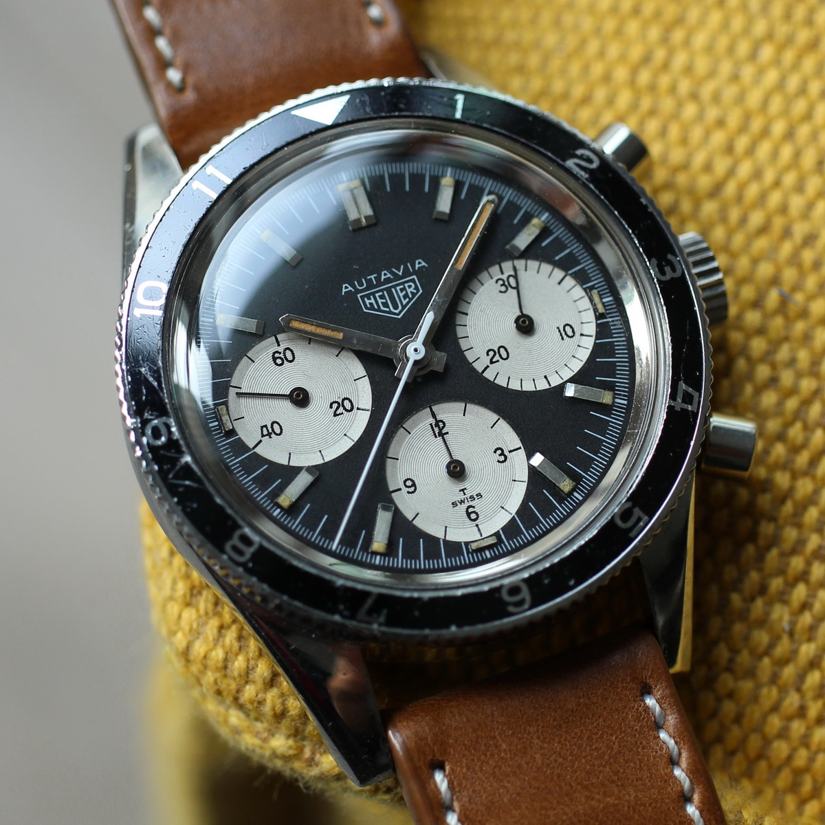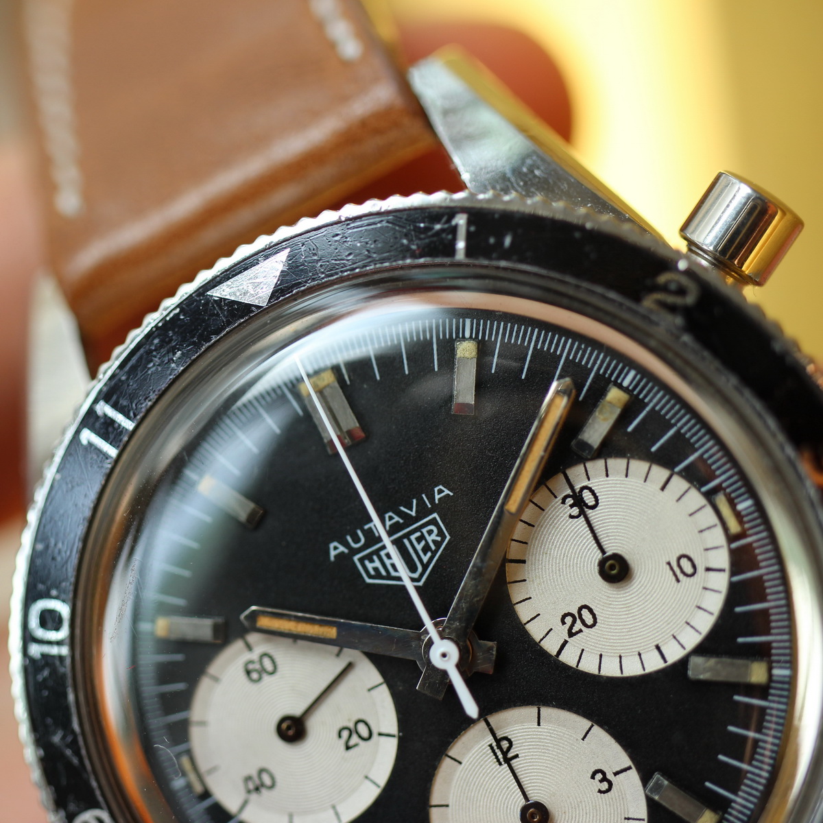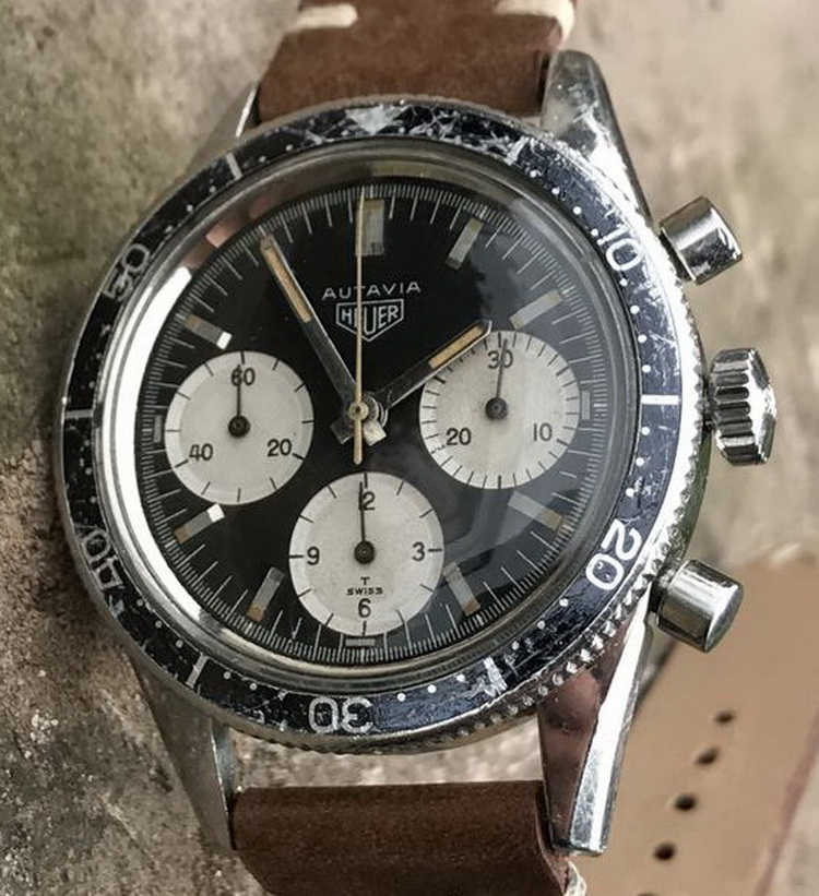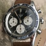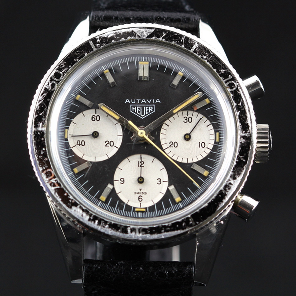 This model is identical to other second execution screw-back Autavias, with third execution dials, except that the numerals on the registers are rounded (derived from Helvetica)