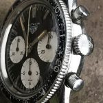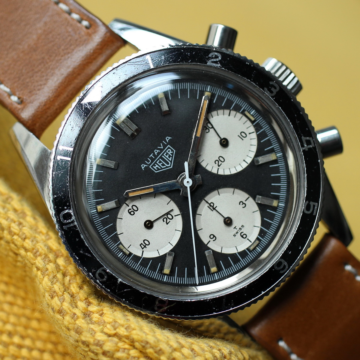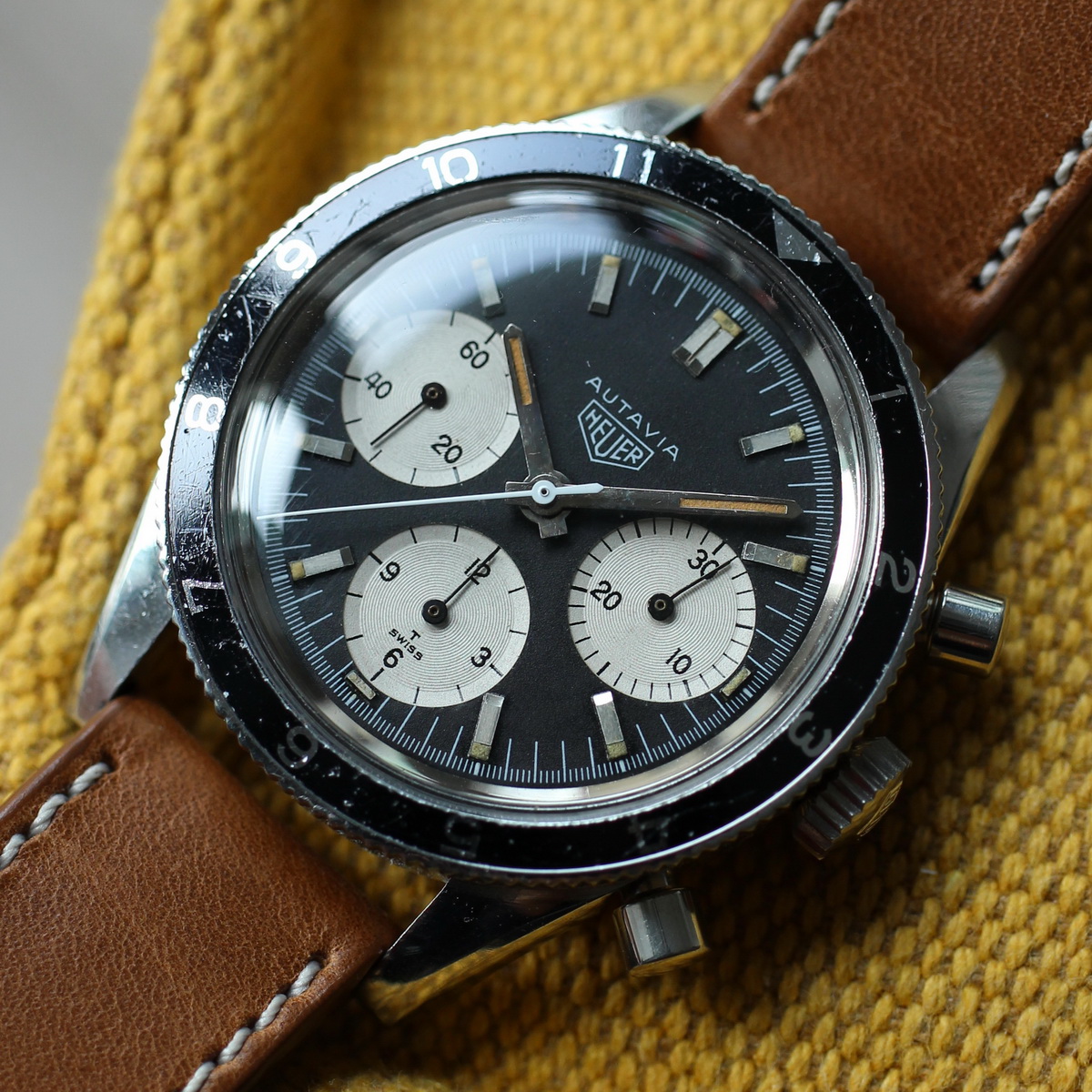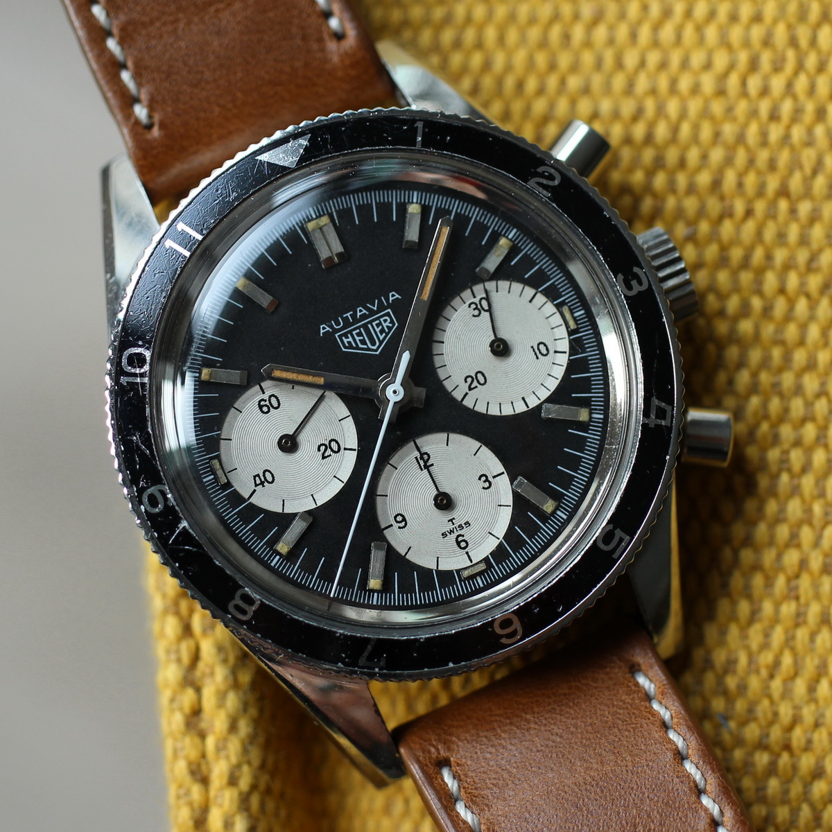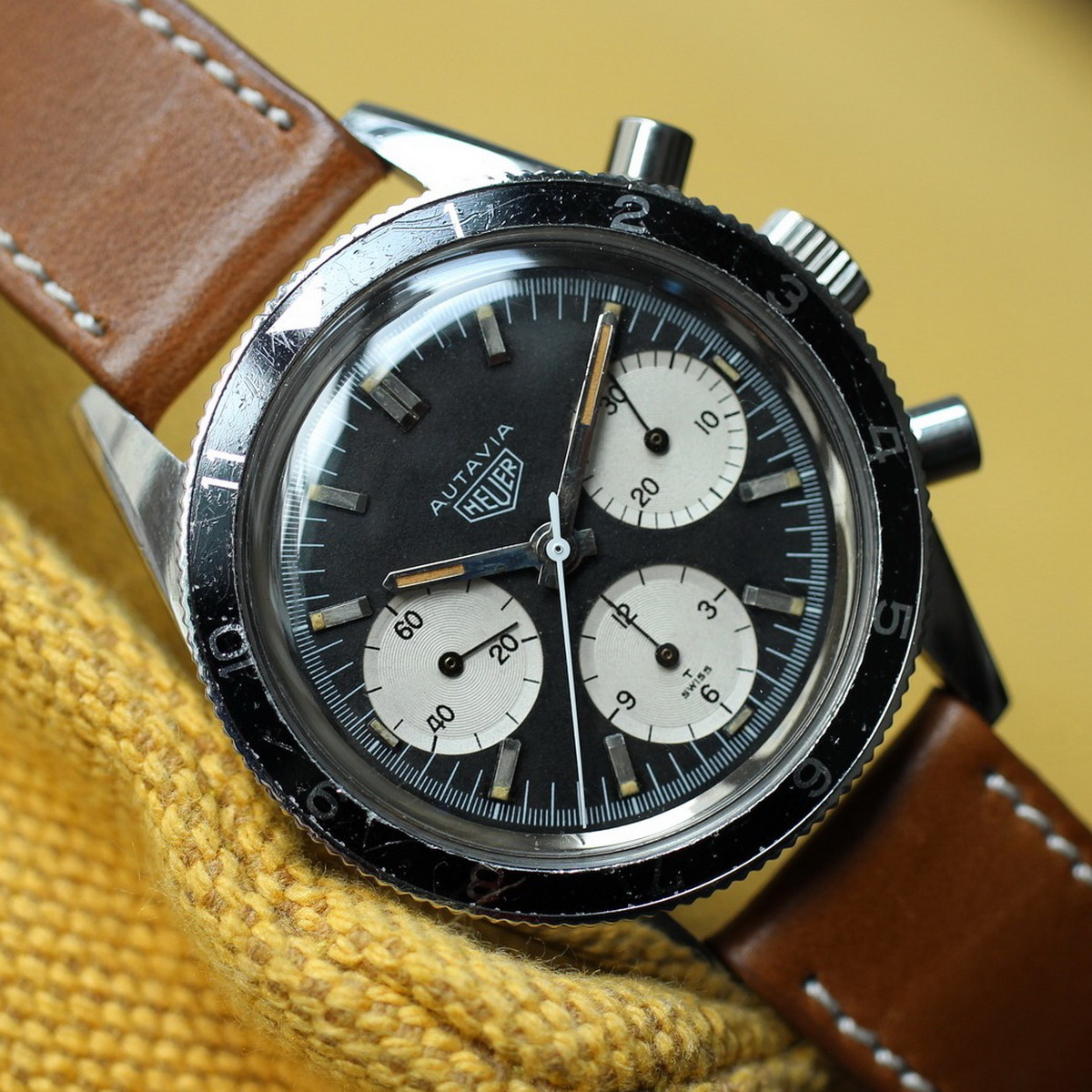This model is identical to other second execution screw-back Autavias, with third execution dials, except that the numerals on the registers are rounded (derived from Helvetica)