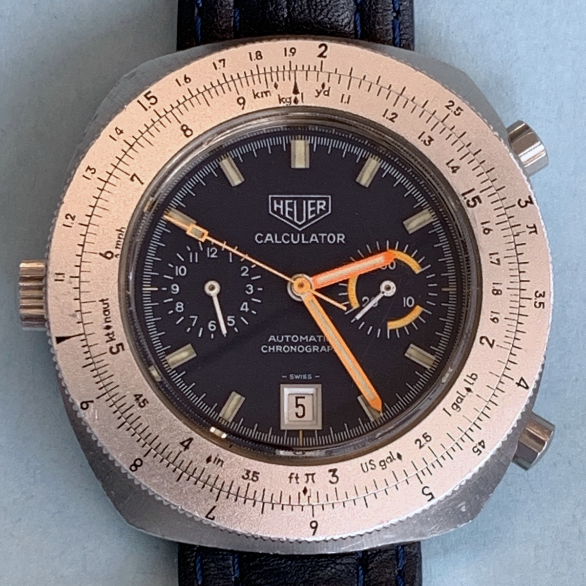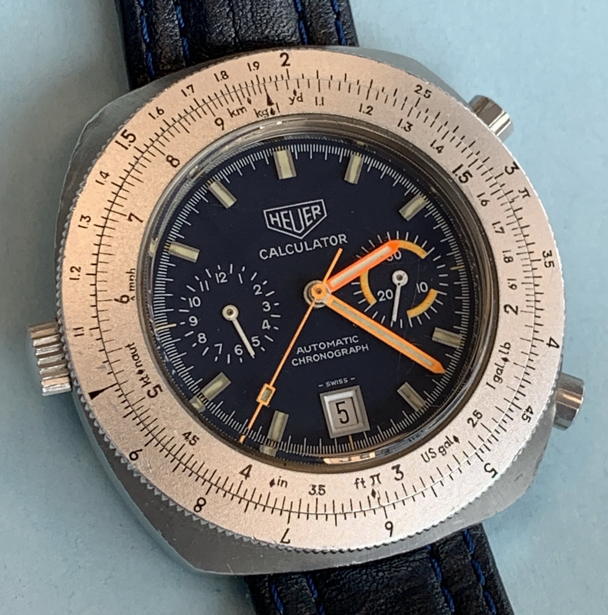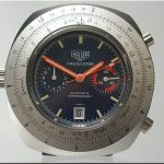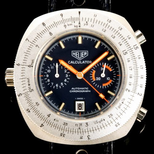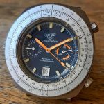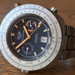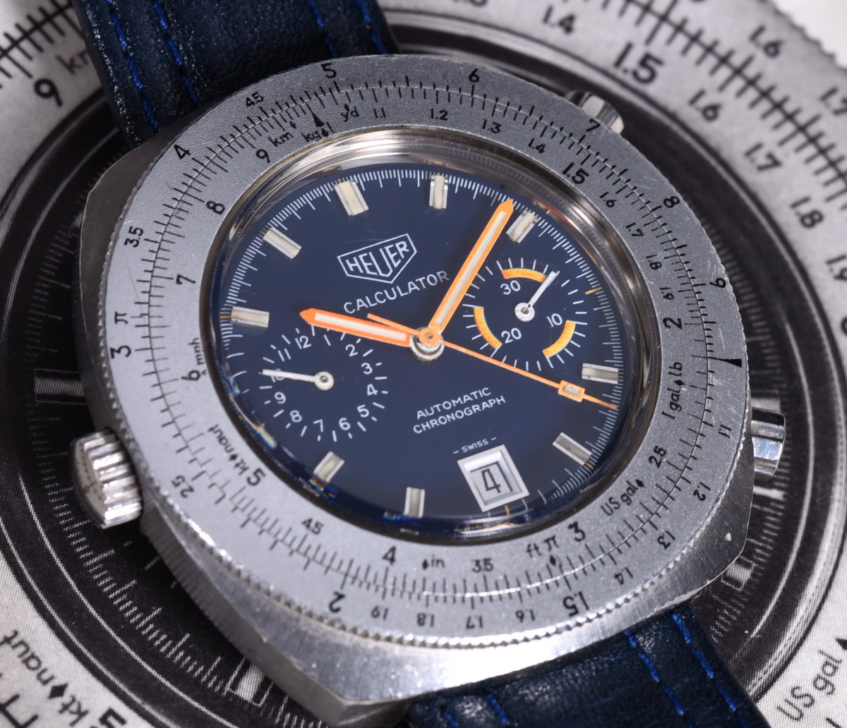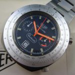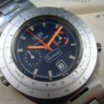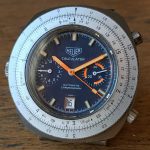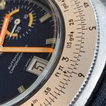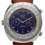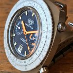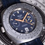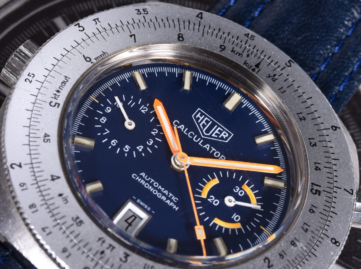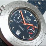 Reference 110.633 is a two-register, automatic chronograph (12 hour capacity) with a deep blue dial and orange hands and accents