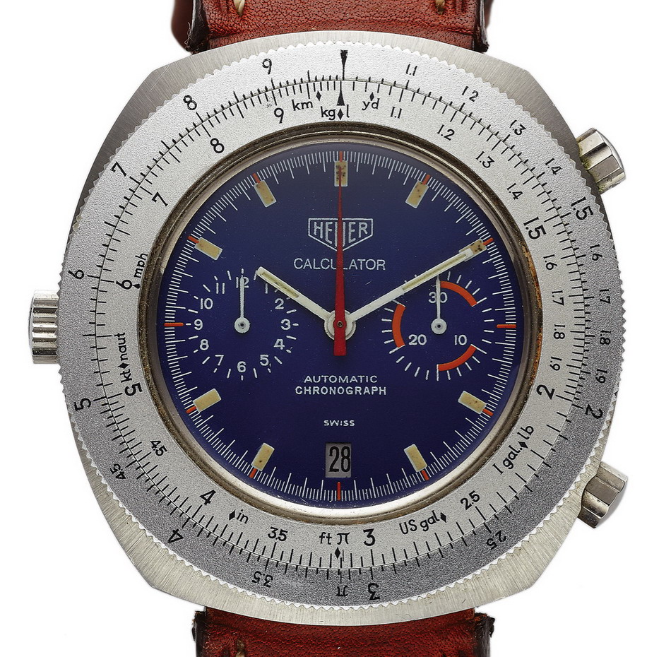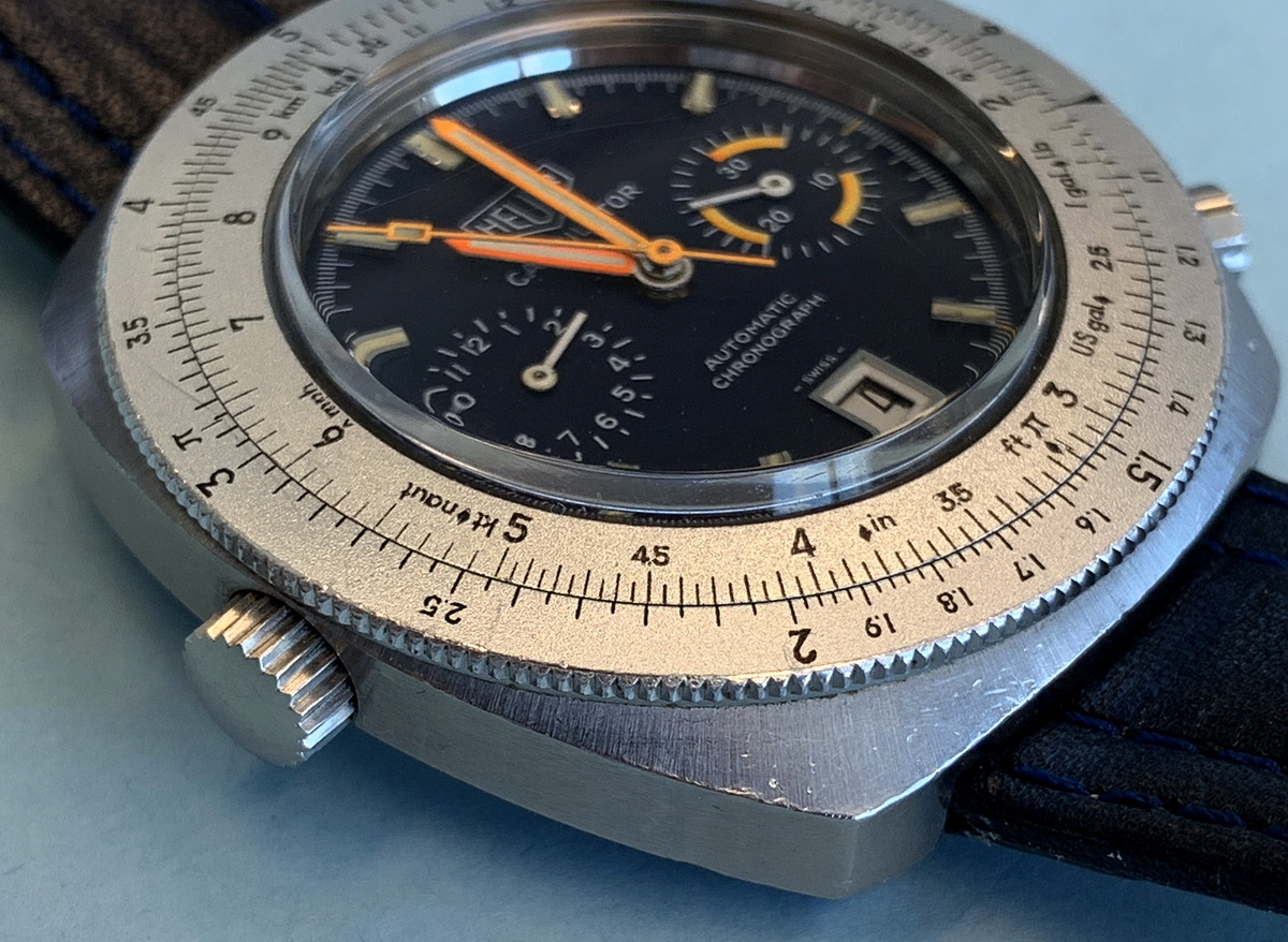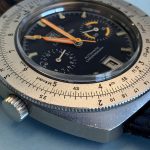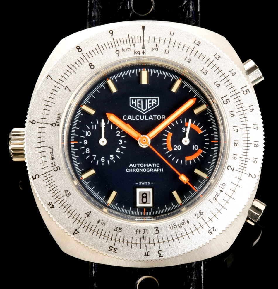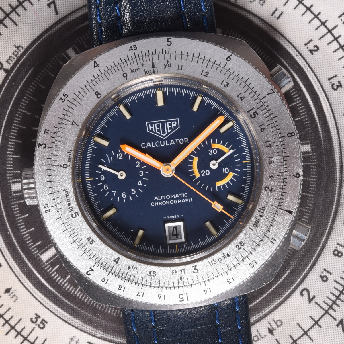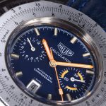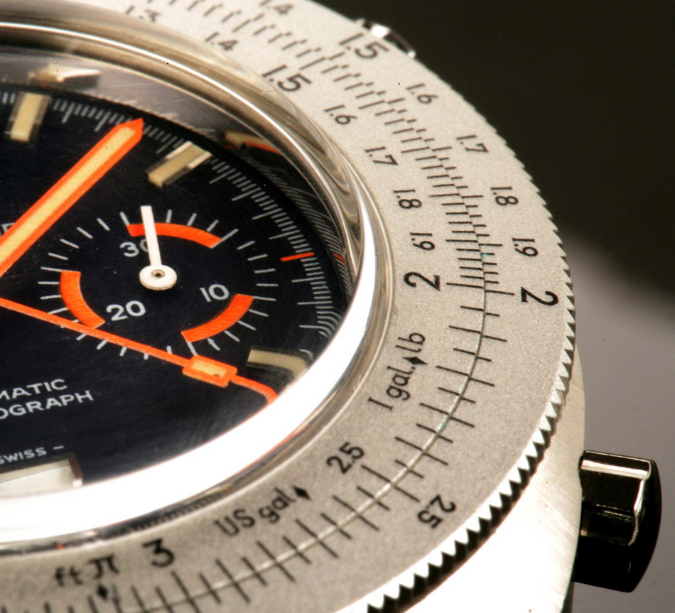 Reference 110.633 is a two-register, automatic chronograph (12 hour capacity) with a deep blue dial and orange hands and accents