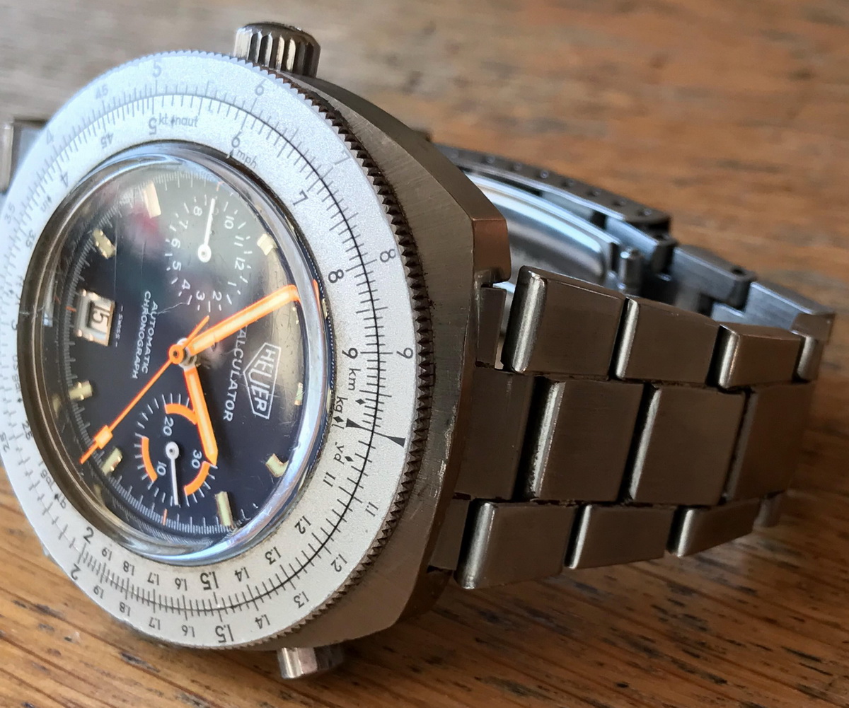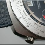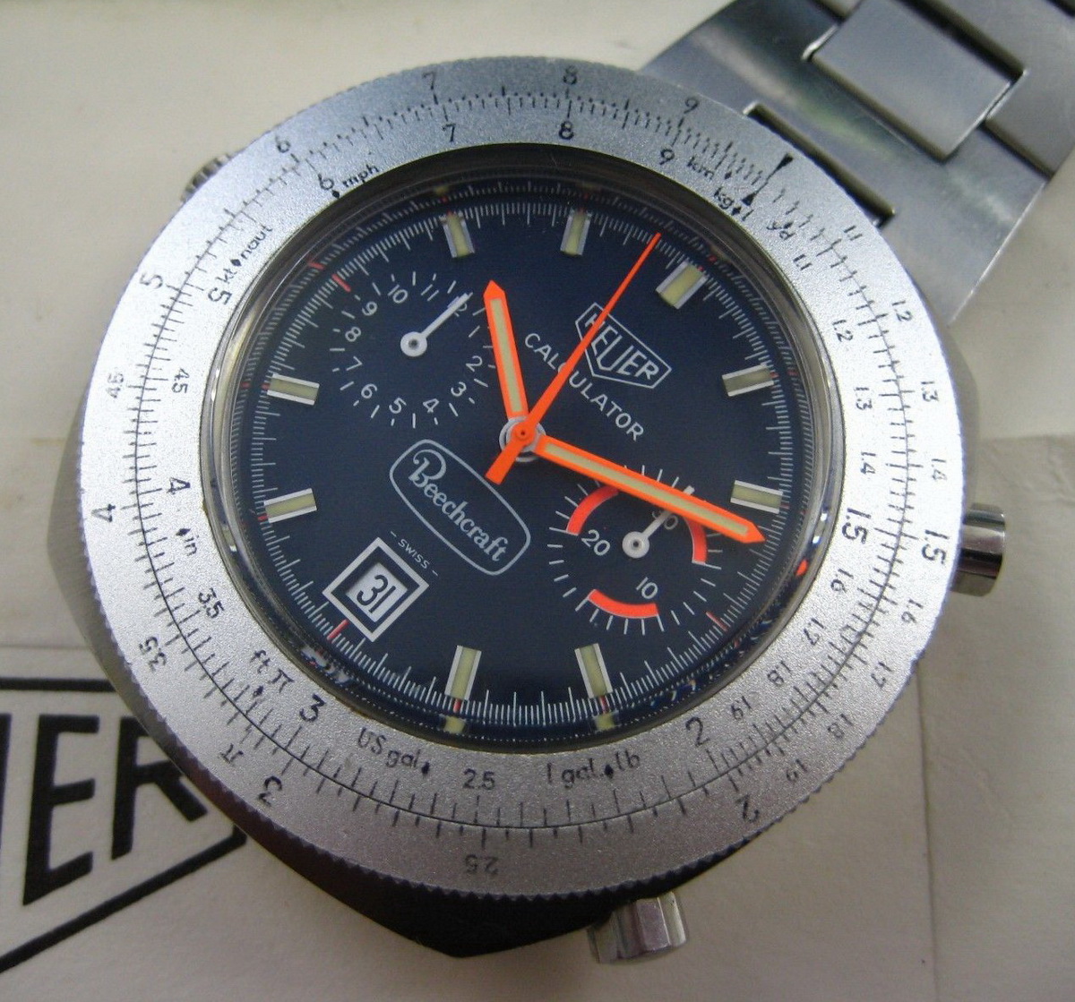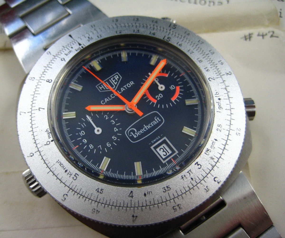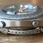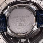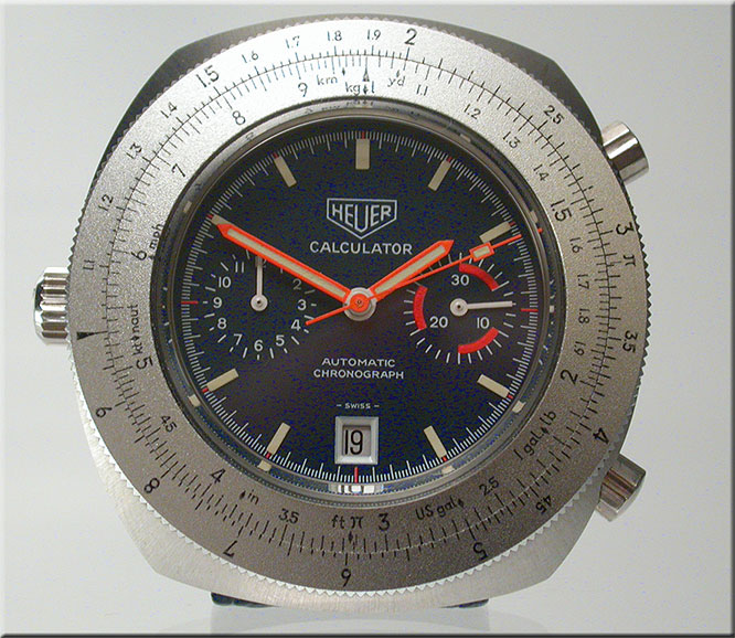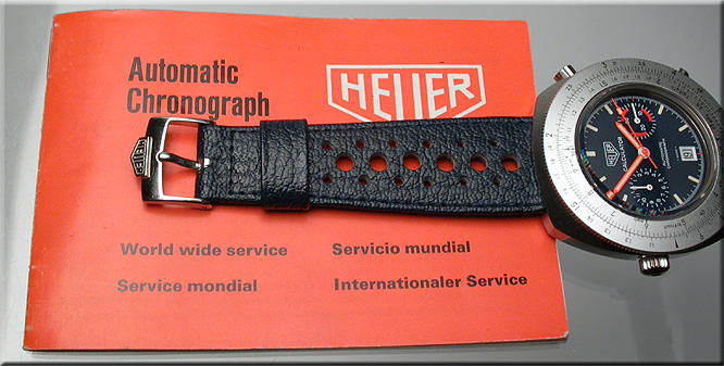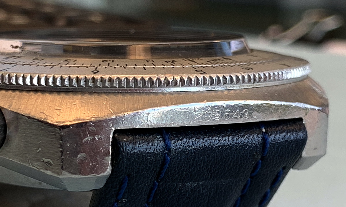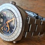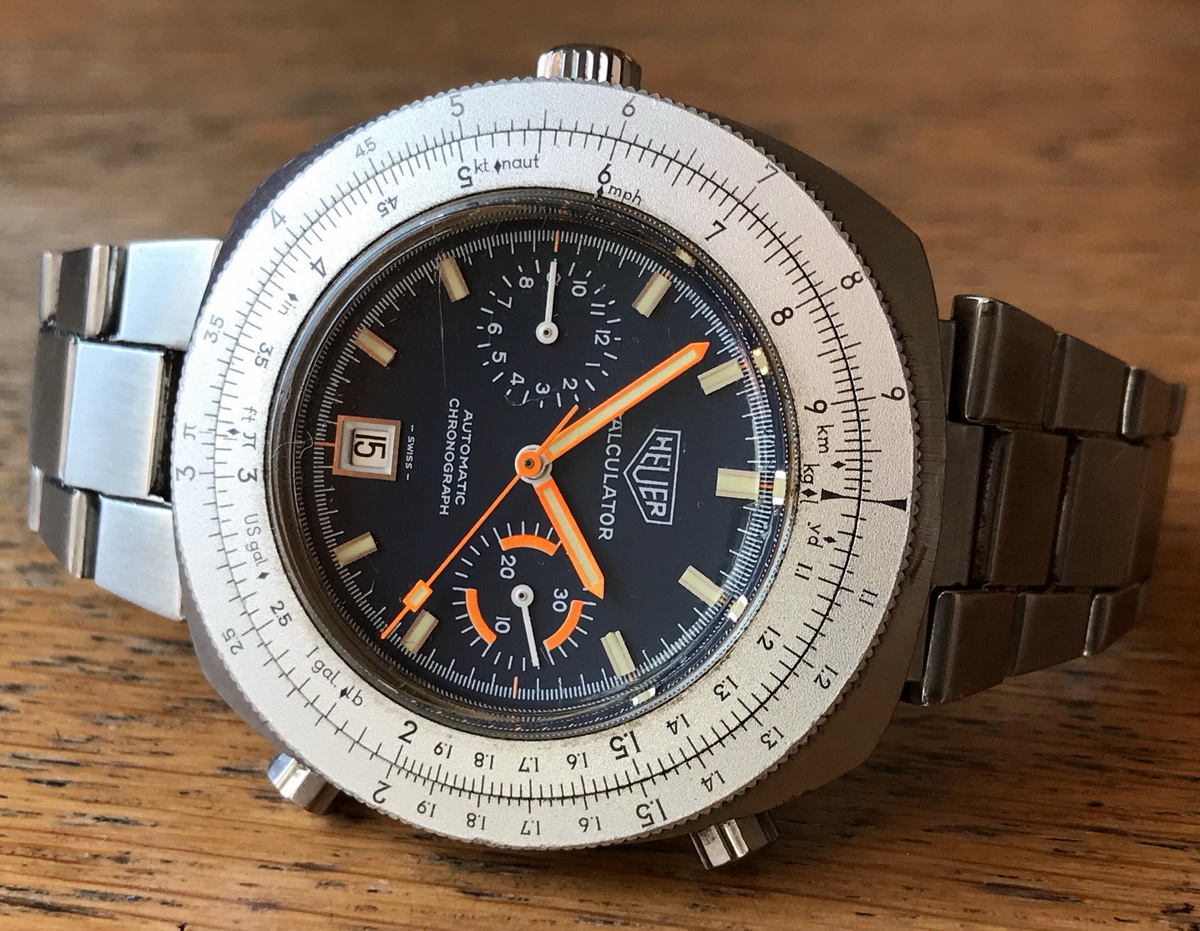 Reference 110.633 is a two-register, automatic chronograph (12 hour capacity) with a deep blue dial and orange hands and accents