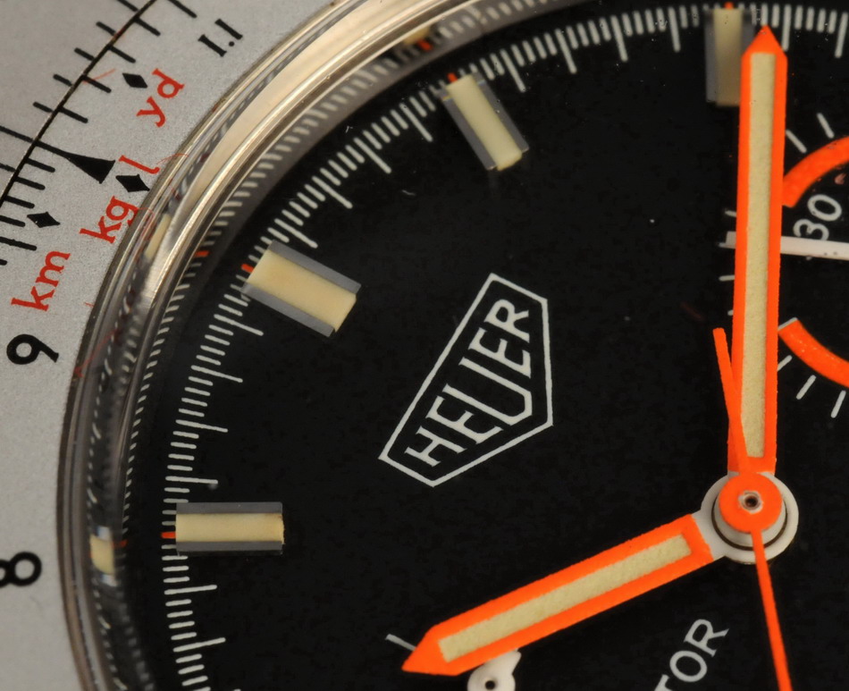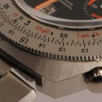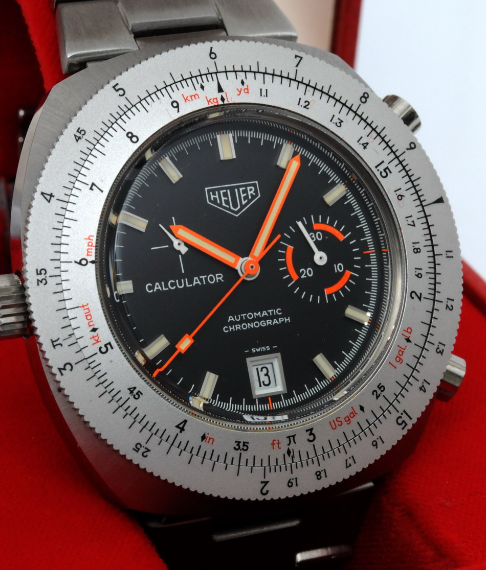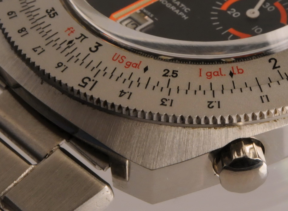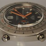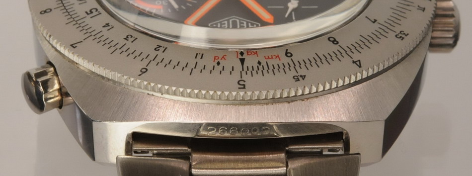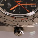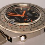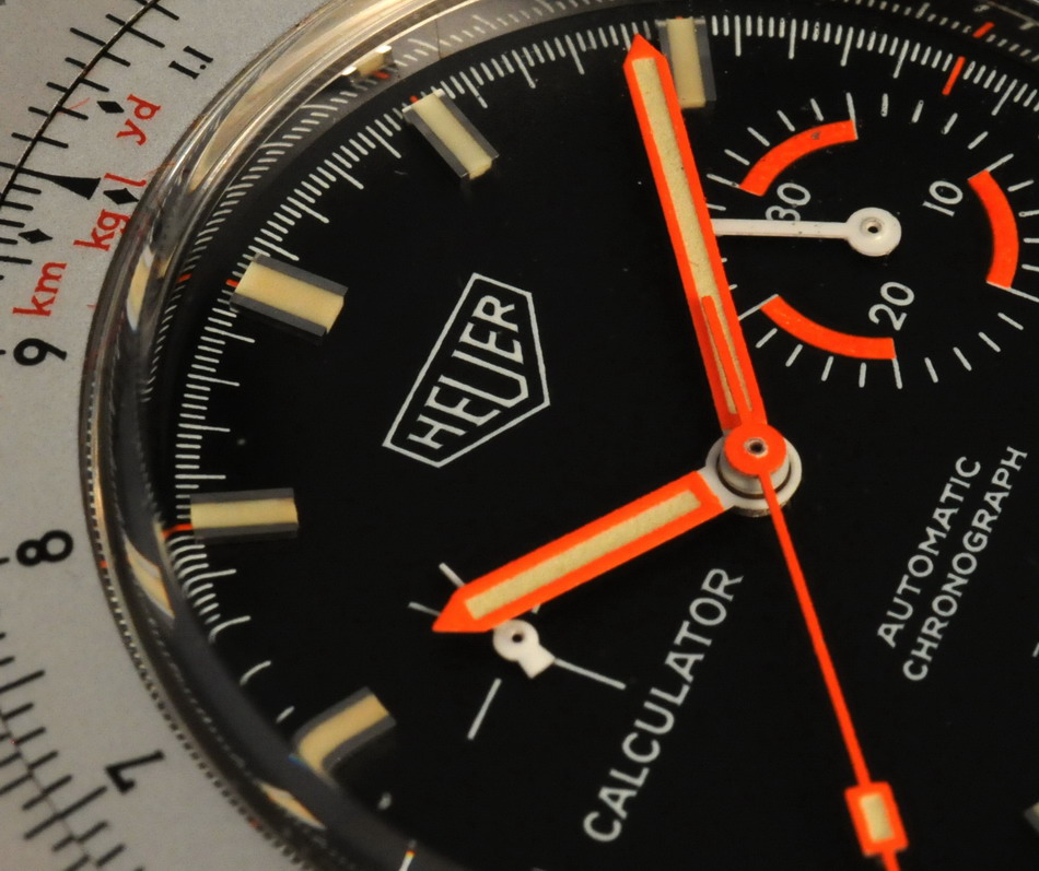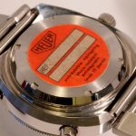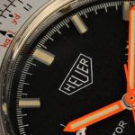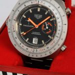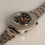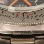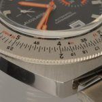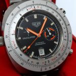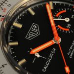 Reference 150.633N is a two-register, automatic chronograph (30 minute capacity) with a black dial and orange hands and accents