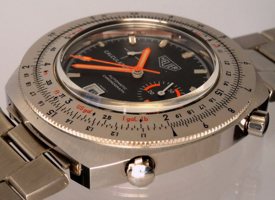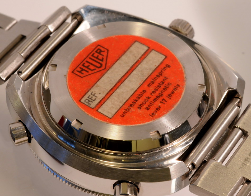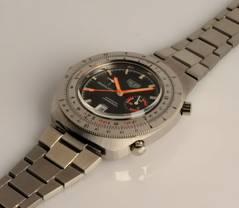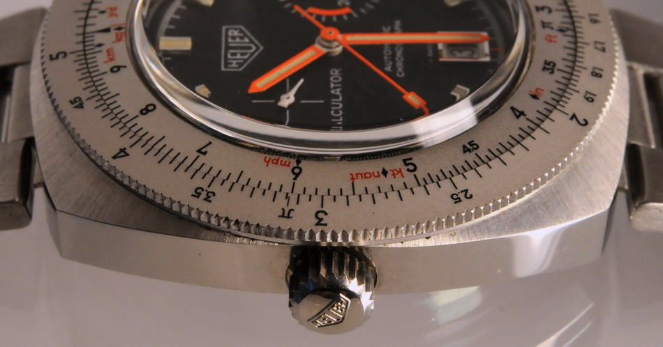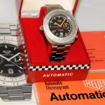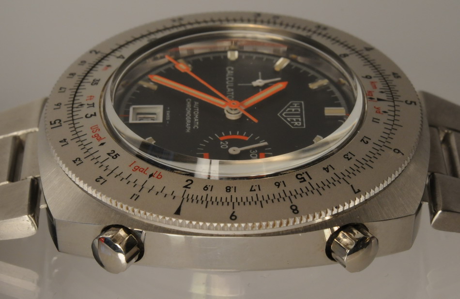 Reference 150.633N is a two-register, automatic chronograph (30 minute capacity) with a black dial and orange hands and accents