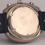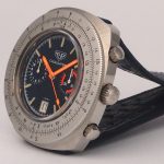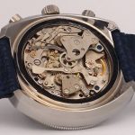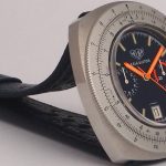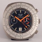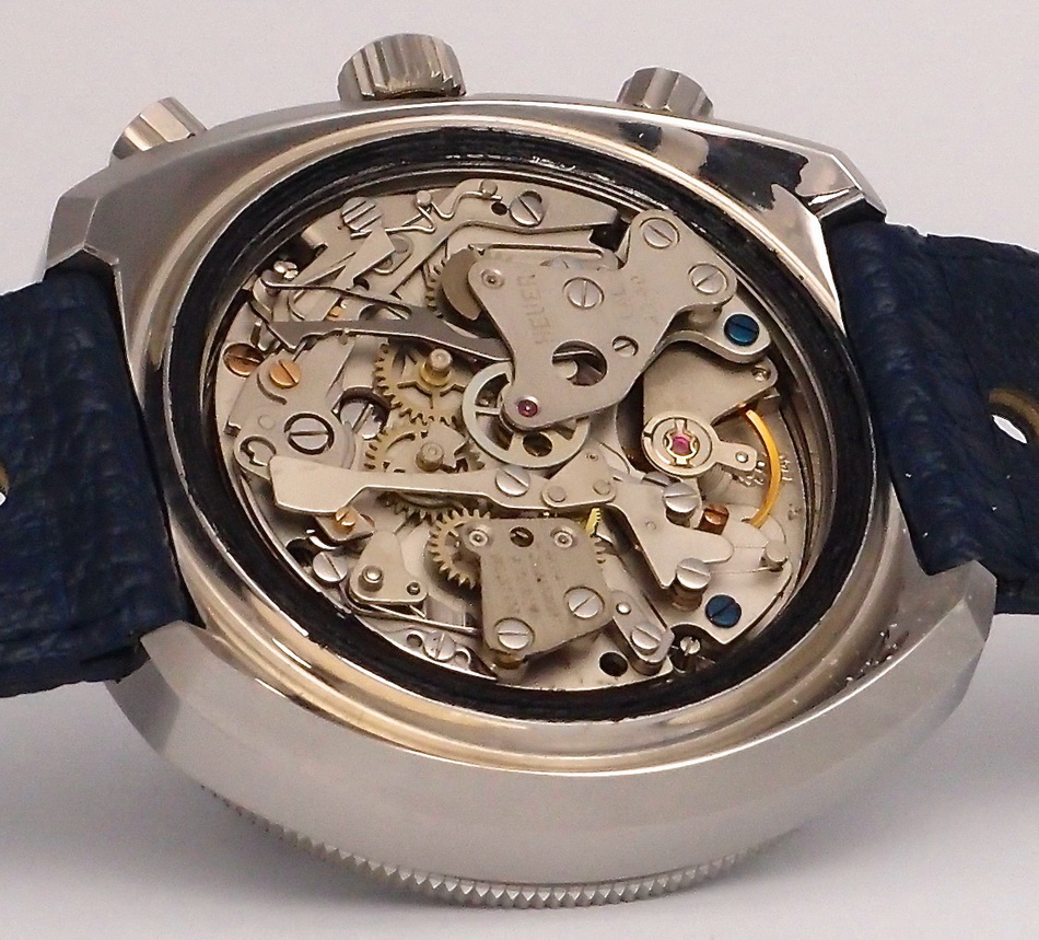 Reference 740.633 is a two-register, manual-wind chronograph (12 hour capacity) with a deep blue dial and orange hands and accents