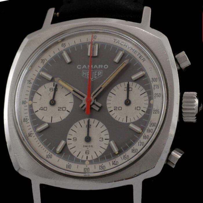 Camaro Reference 7220 NS has charcoal dial and white registers, with Tachymeter scale on dial; hands have black inserts and markers have white inserts