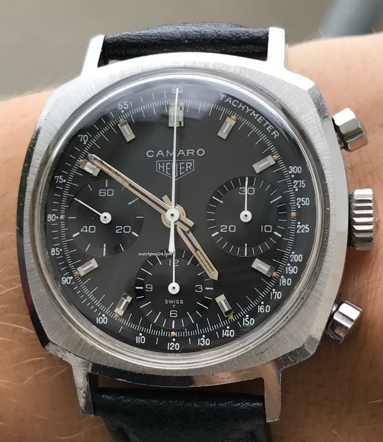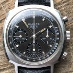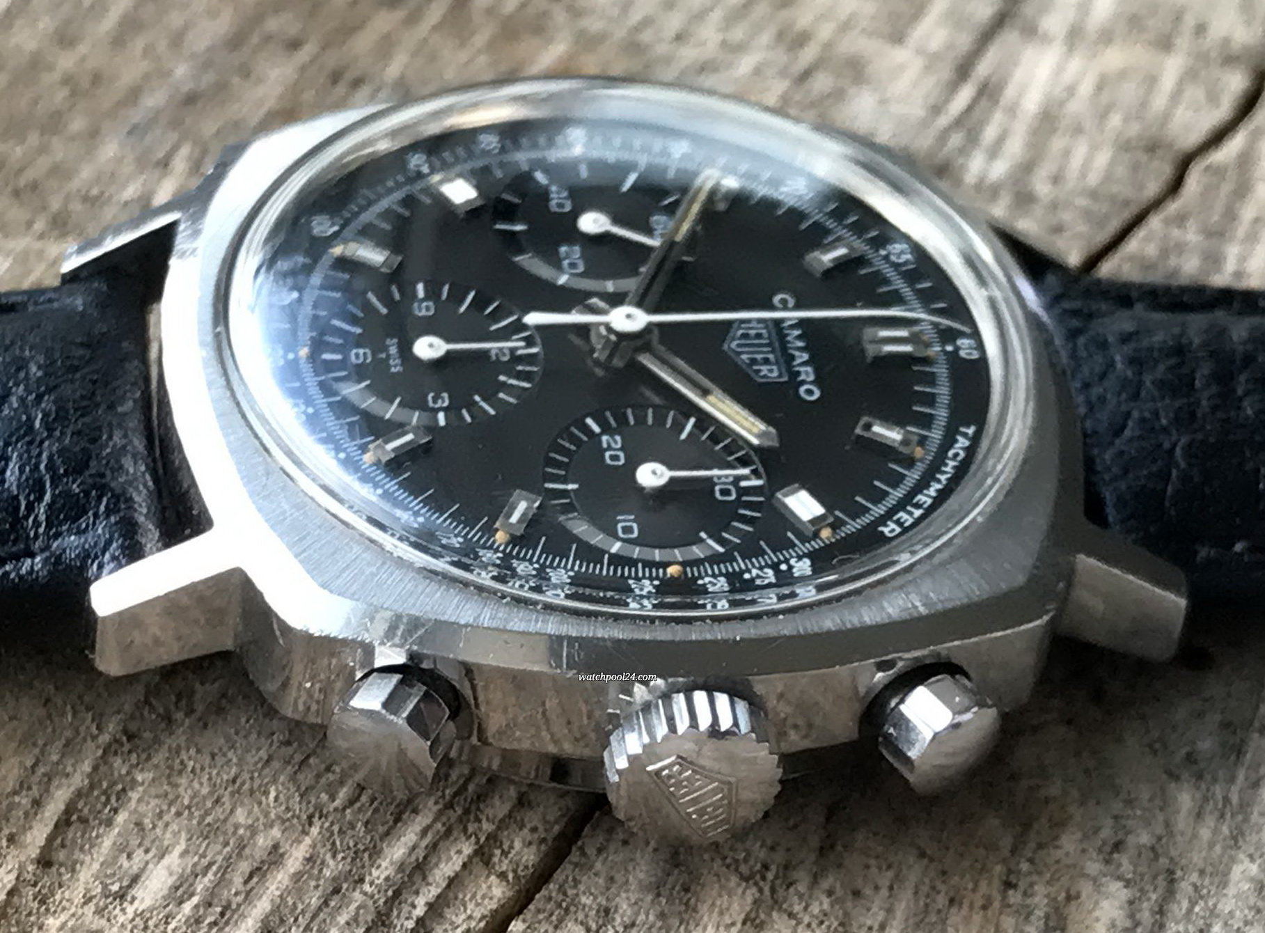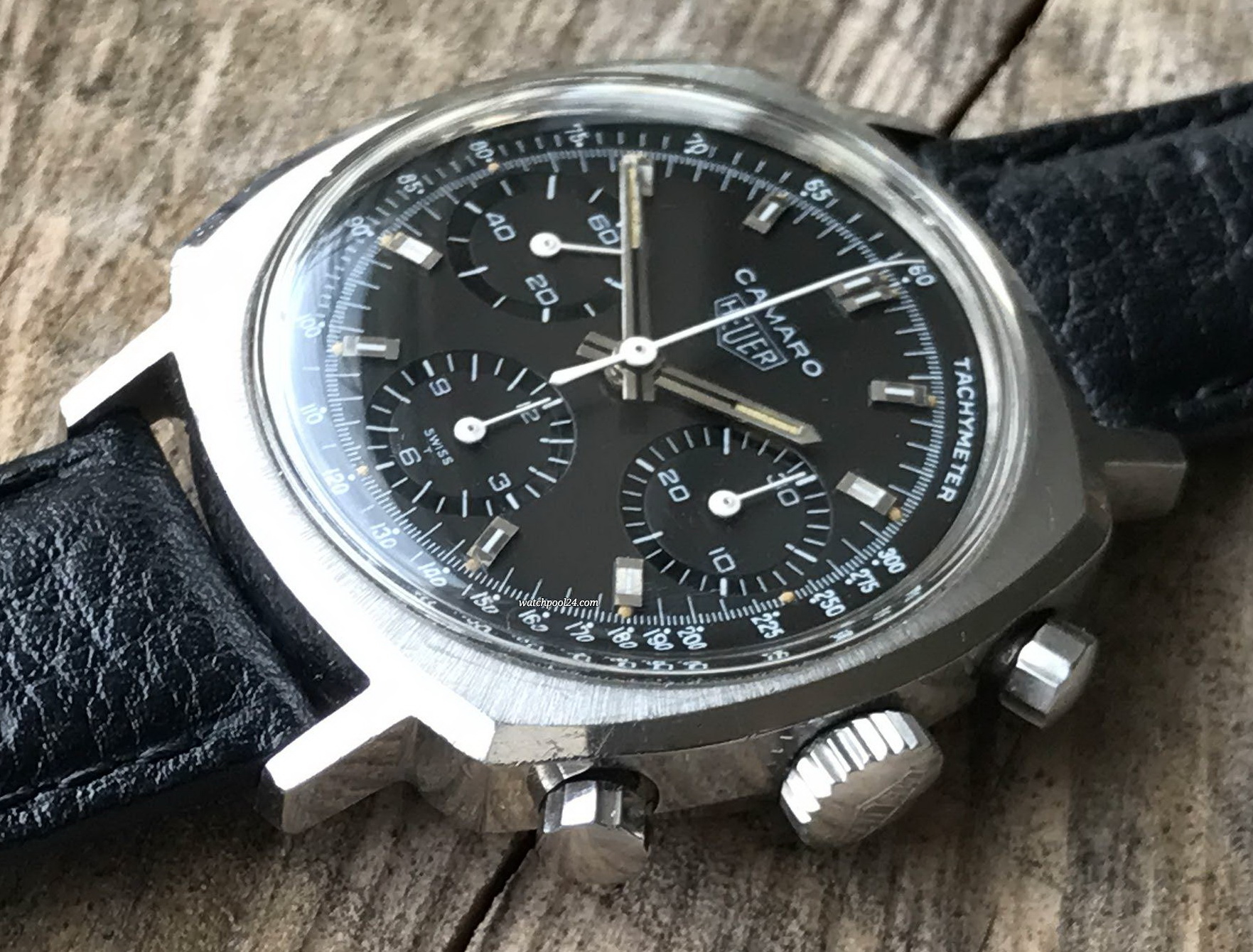 Camaro Reference 7220 NT (Second Execution) has charcoal dial and charcoal registers, with Tachymeter scale on dial; hands have black inserts and markers are short with white inserts