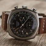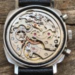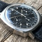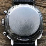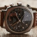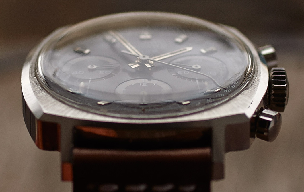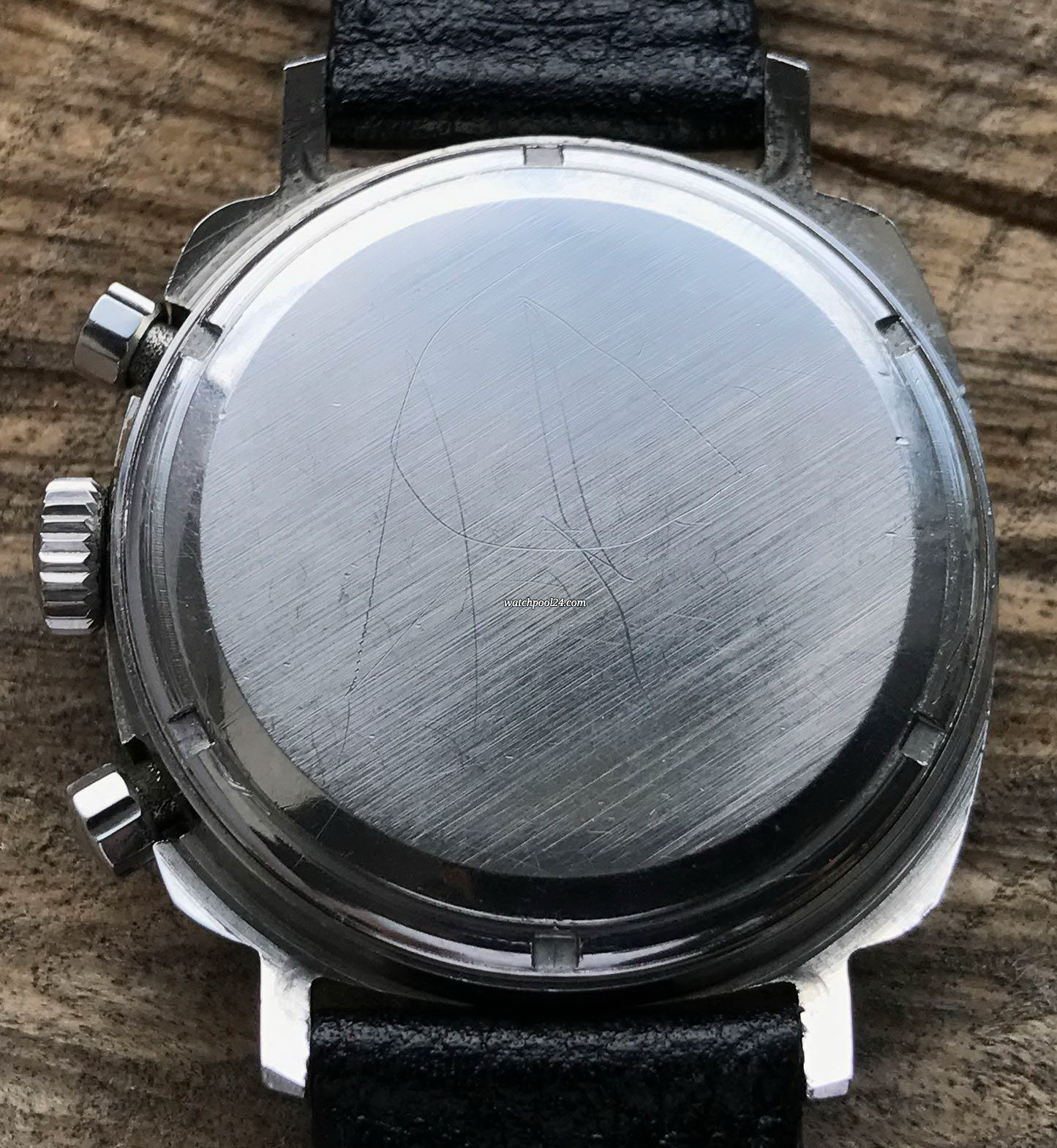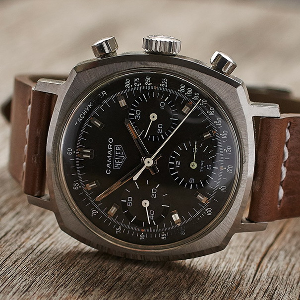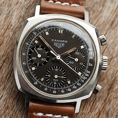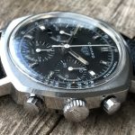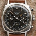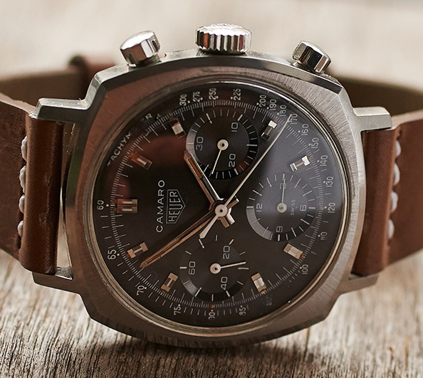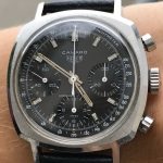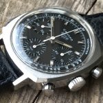 Camaro Reference 7220 NT (Second Execution) has charcoal dial and charcoal registers, with Tachymeter scale on dial; hands have black inserts and markers are short with white inserts