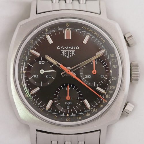 Camaro Reference 7220 NT has charcoal dial and charcoal registers, with Tachymeter scale on dial; hands have black inserts and markers have white inserts