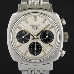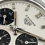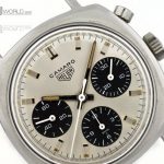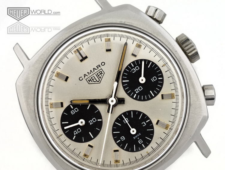 Camaro Reference 7220 SN has silver dial with charcoal registers; first execution has plain polished steel hands and markers
