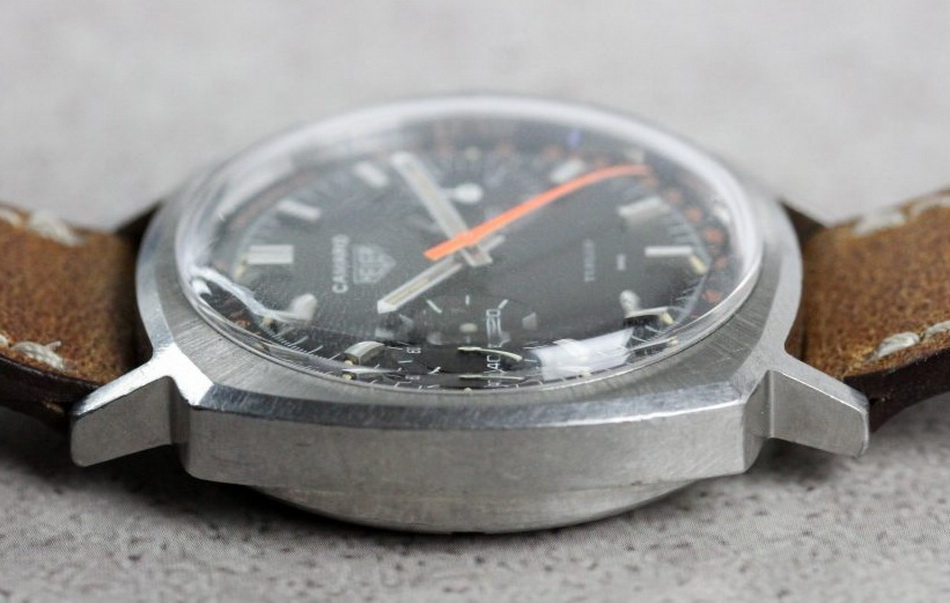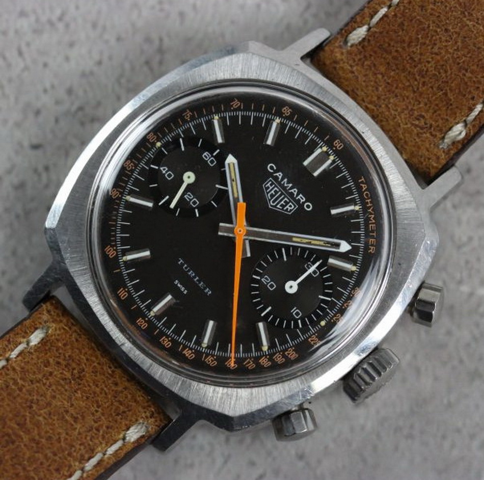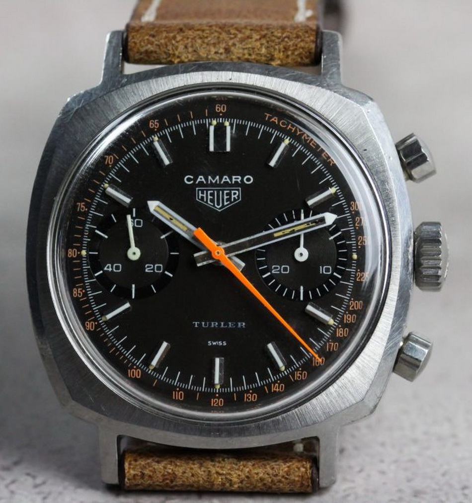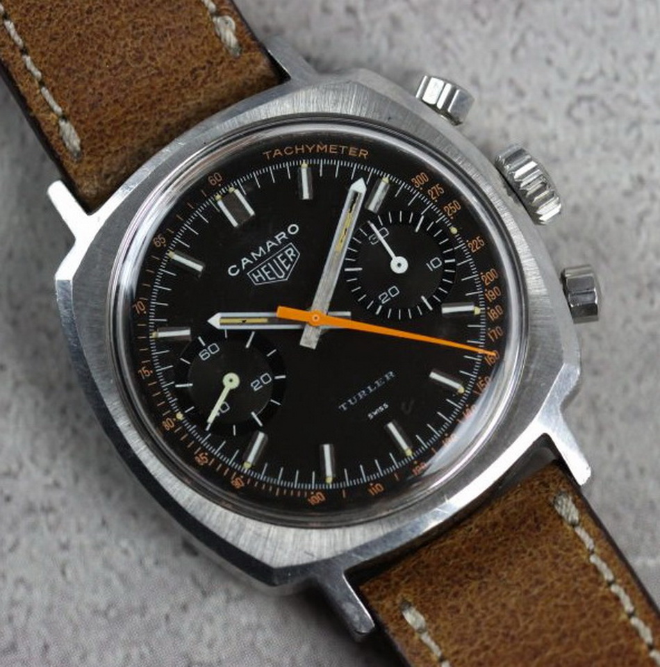 Camaro Reference 73343 NT (fourth execution) has black dial and black registers, with Tachymeter scale; brushed steel hands have gray edges and tips; long markers have white inserts