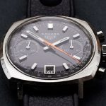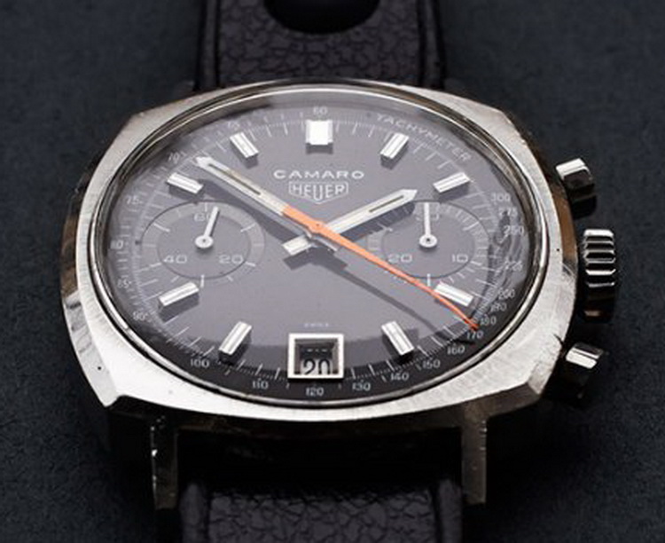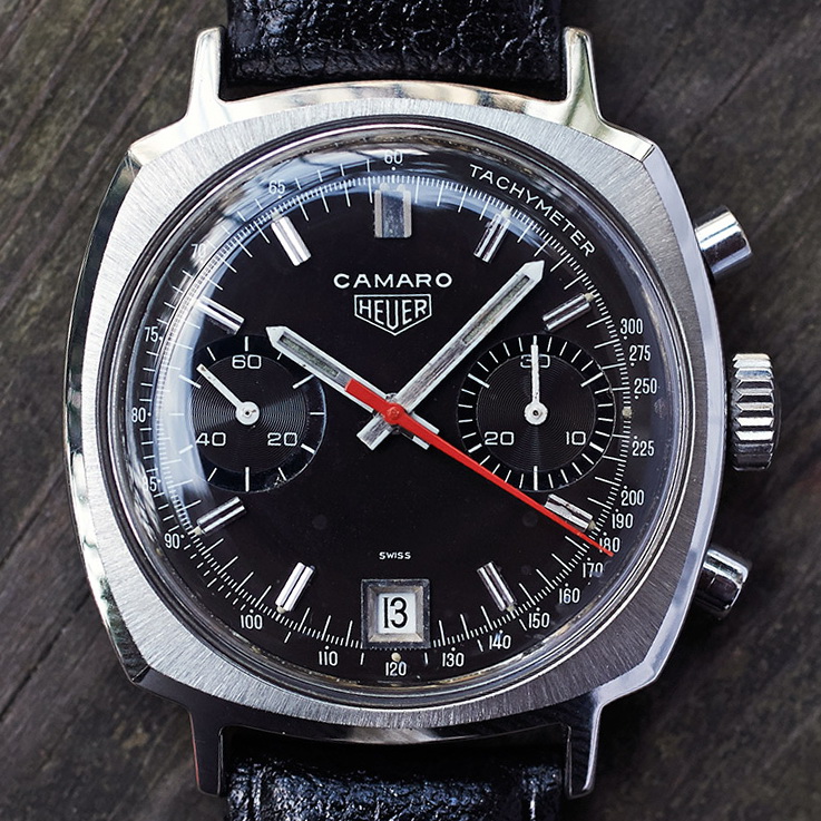 Camaro Reference 73443 NT (Second Execution) has black dial and registers, with Tachymeter scale, and long markers; hands have white edges and tips