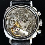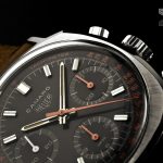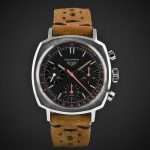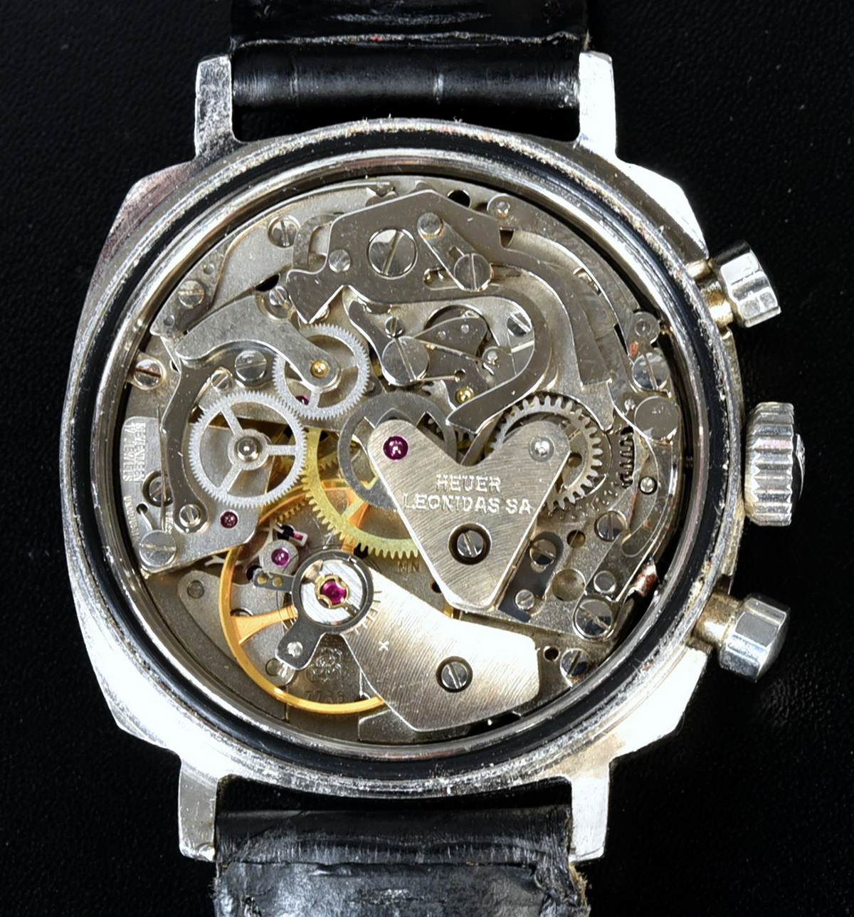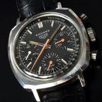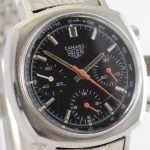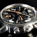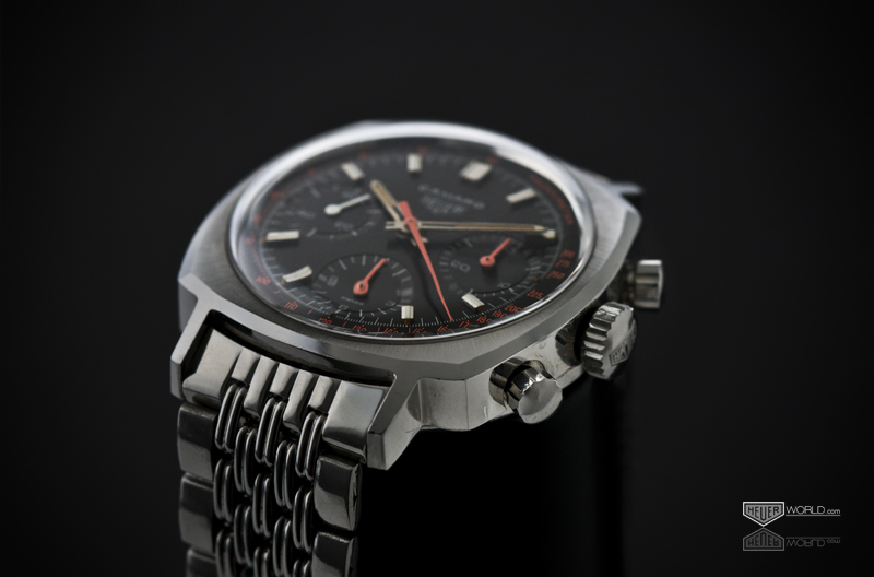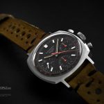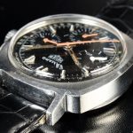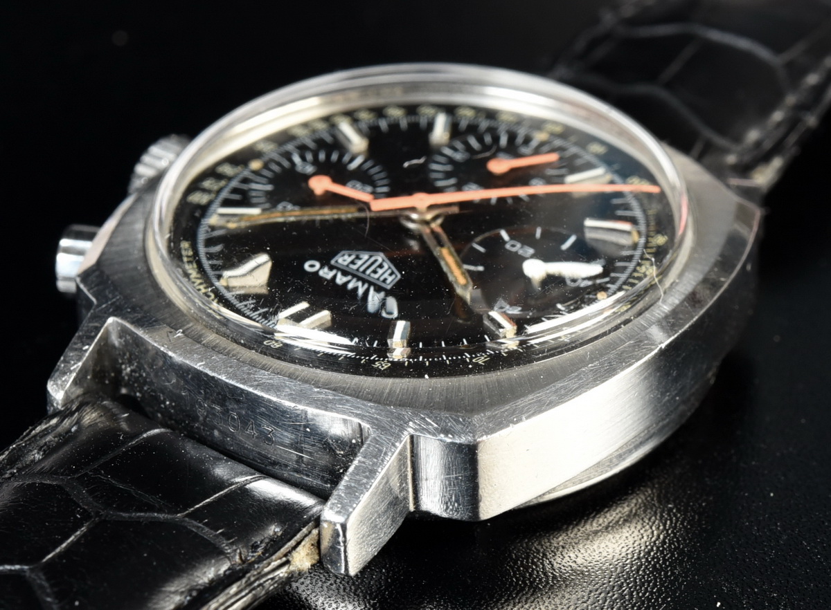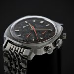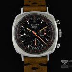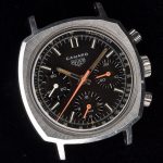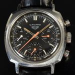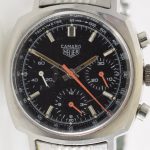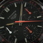 Camaro Reference73643 NT has black dial and black registers, with Tachymeter scale on dial; hands have black inserts and markers have white inserts