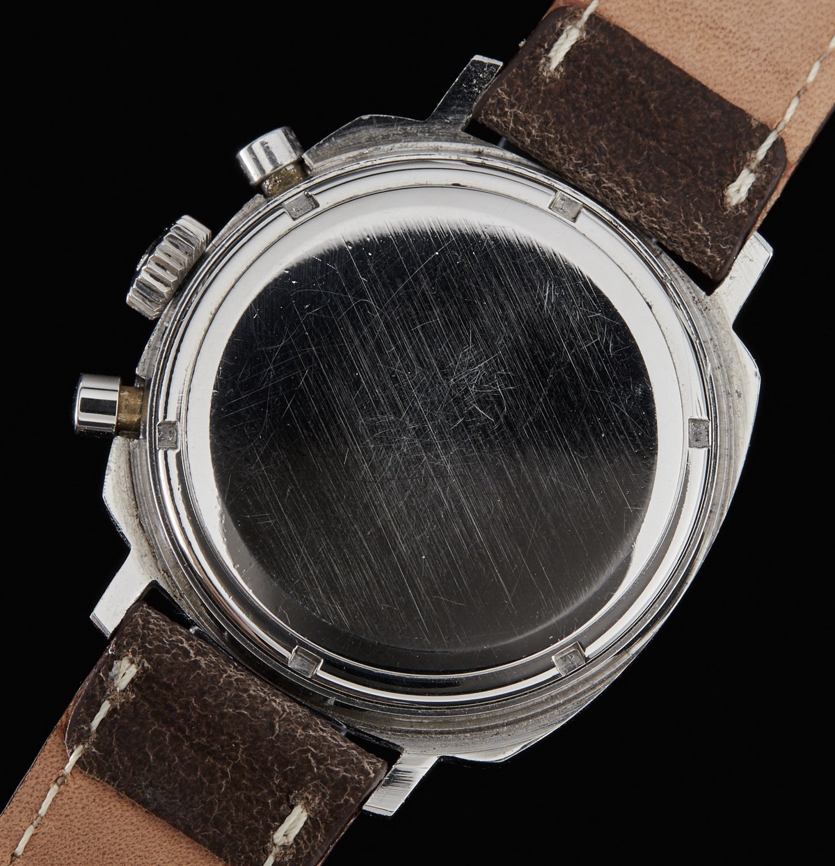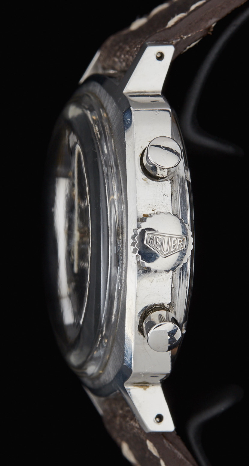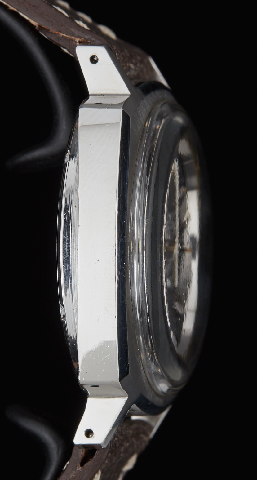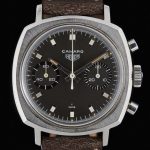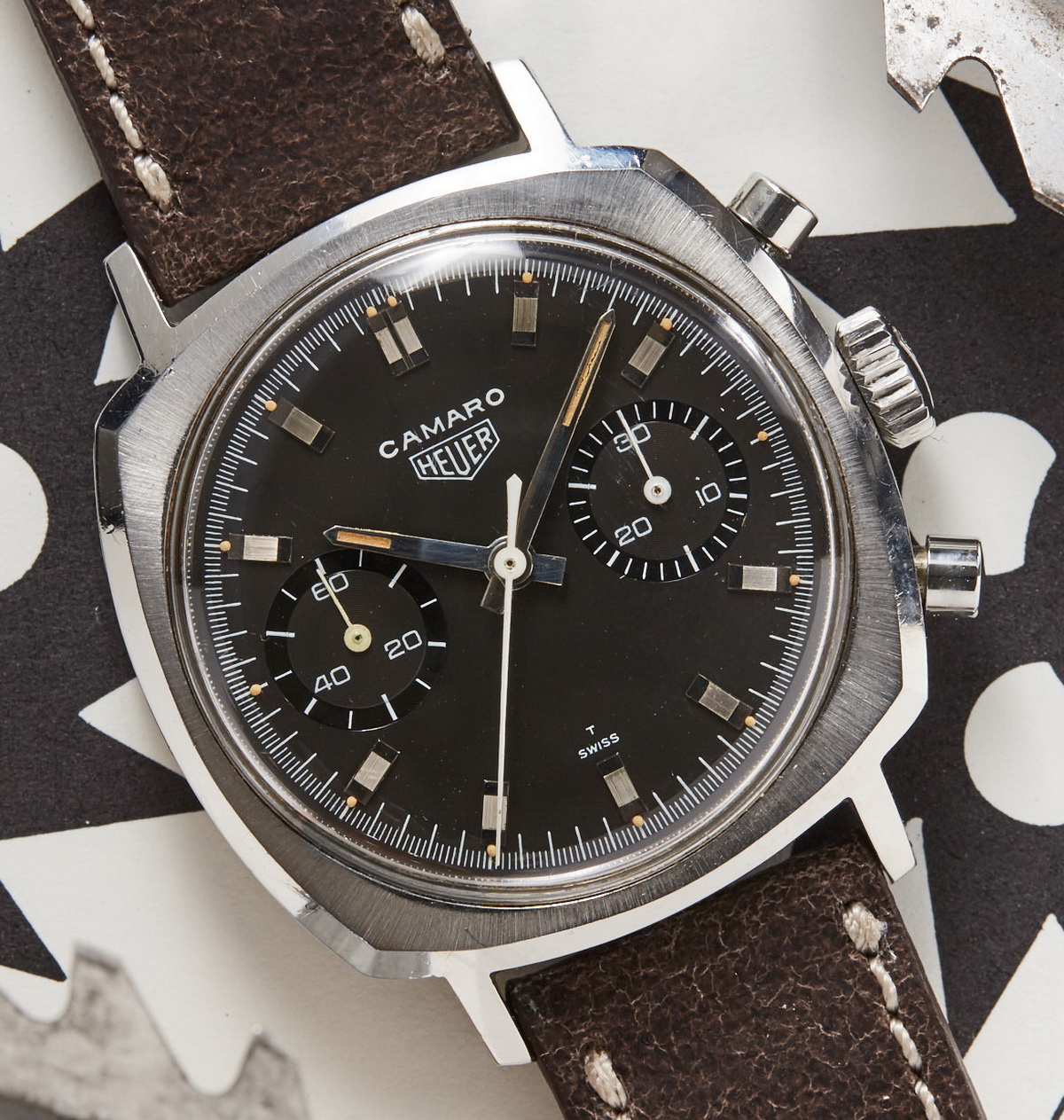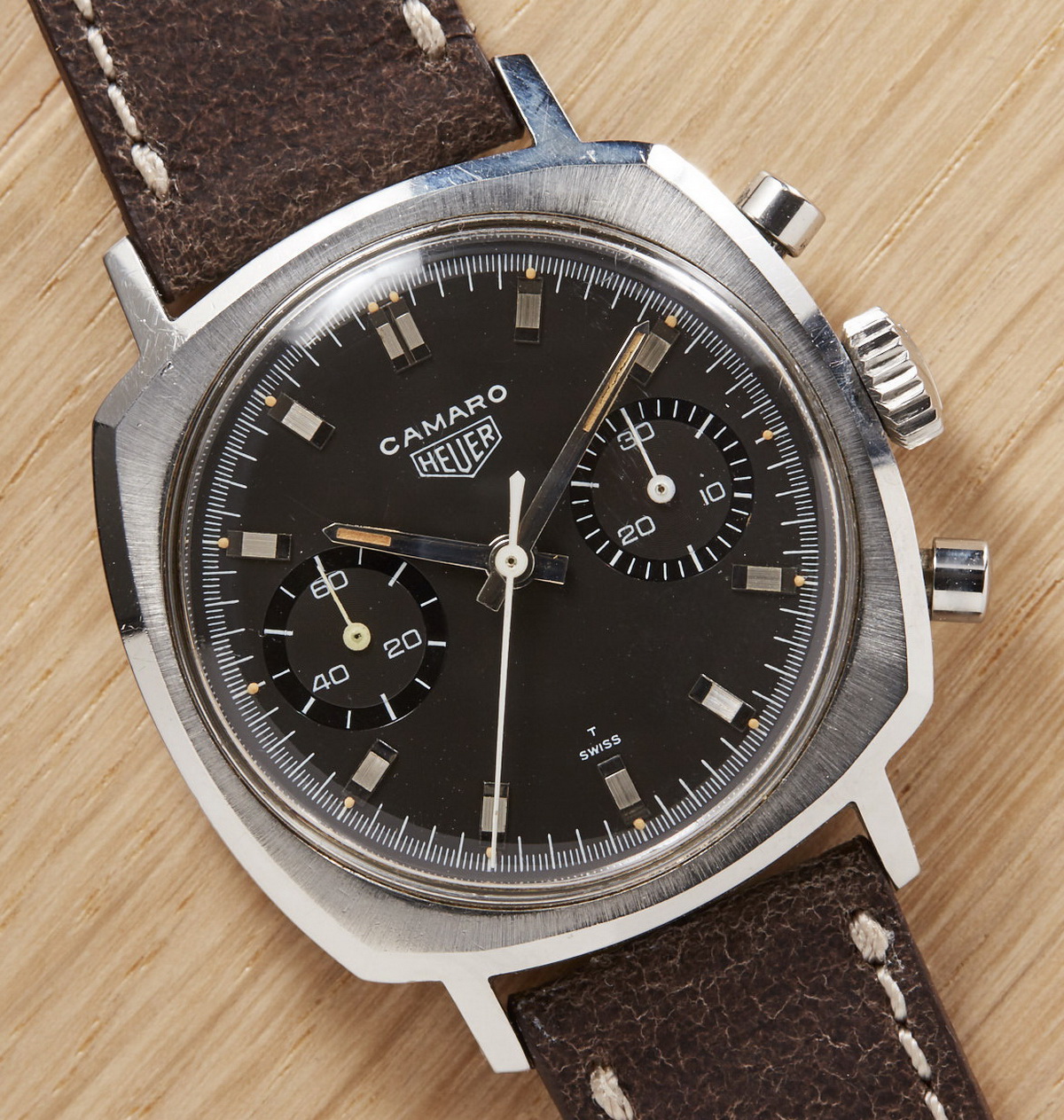 Camaro Reference 7743 N has charcoal dial with charcoal registers; first execution has plain polished steel hands and markers