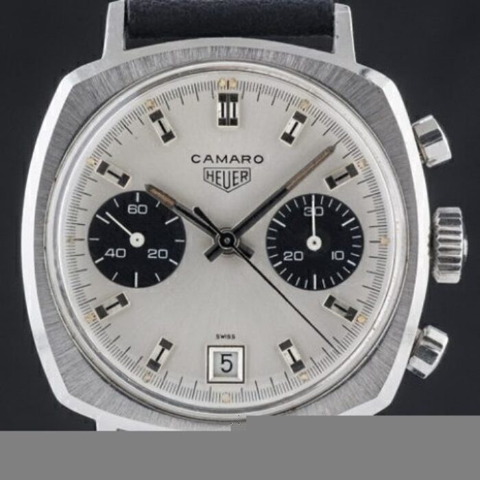 Camaro Reference 7843 S has white dial with black registers; hands and markers have black inserts