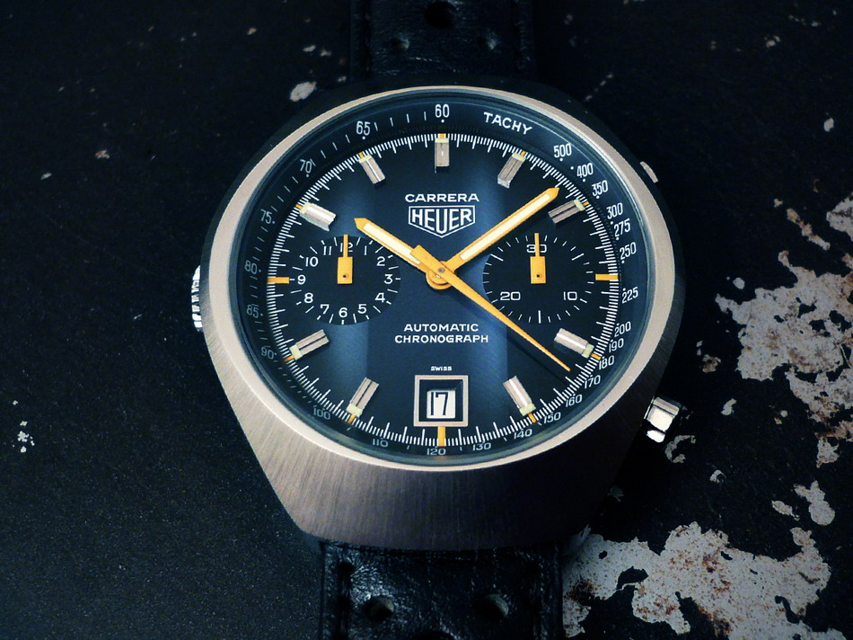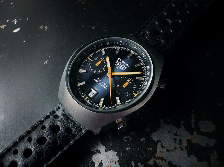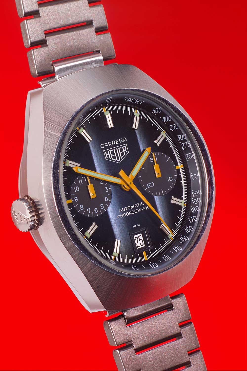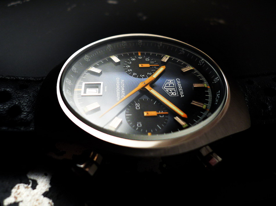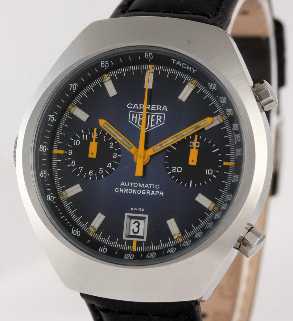 Reference 110.573B Carrera has blue dial with luminous metallic finish (Cotes de Geneve), orange edged hands and orange chronograph needles, 12 hour capacity