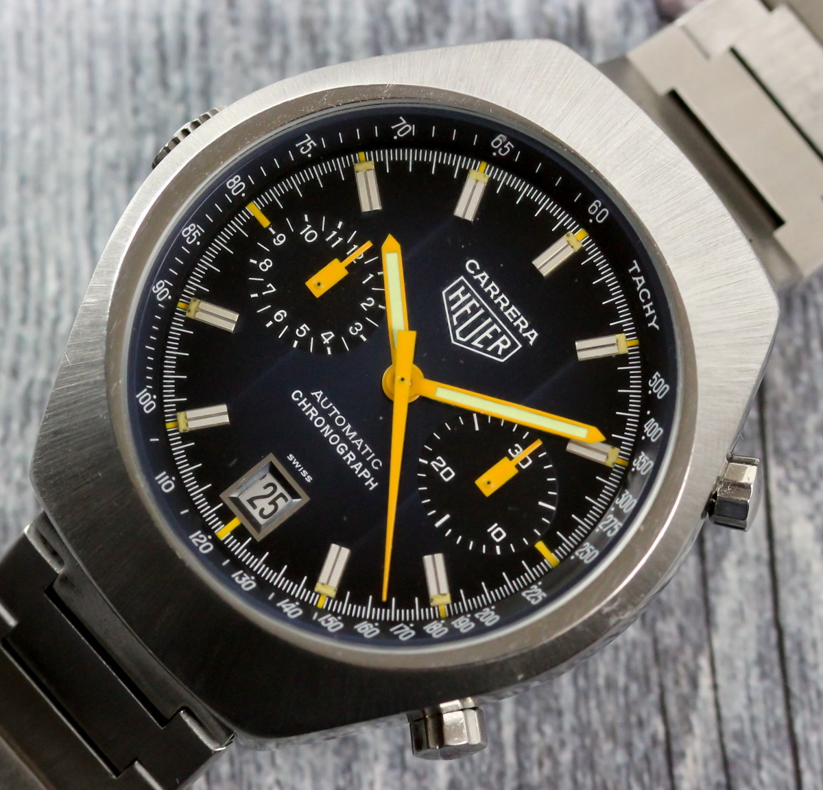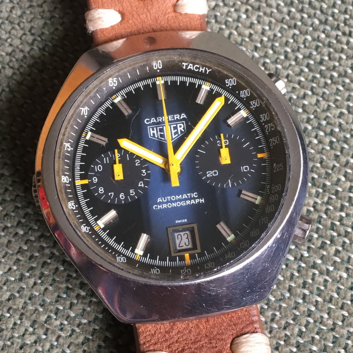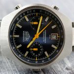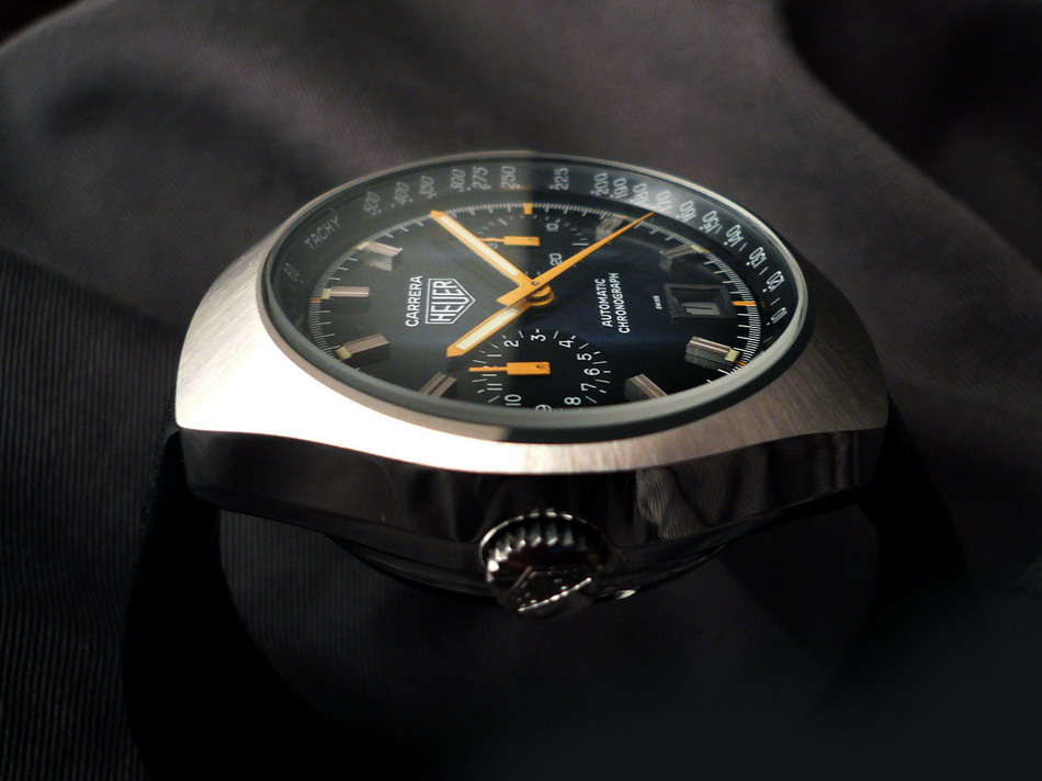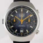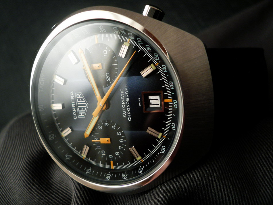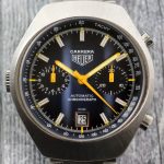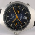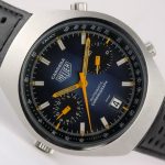 Reference 110.573B Carrera has blue dial with luminous metallic finish (Cotes de Geneve), orange edged hands and orange chronograph needles, 12 hour capacity