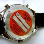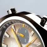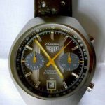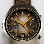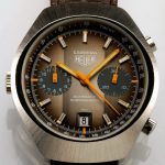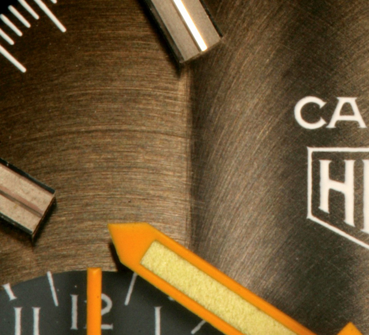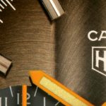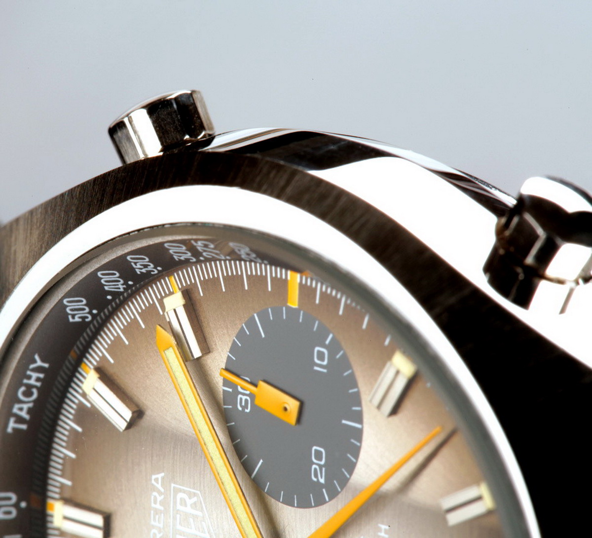 Reference 110.573F Carrera has fume (smoke) dial with luminous metallic finish (Cotes de Geneve), orange edged hands and orange chronograph needles, 12 hour capacity