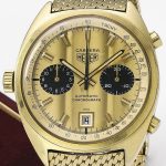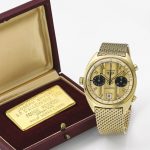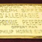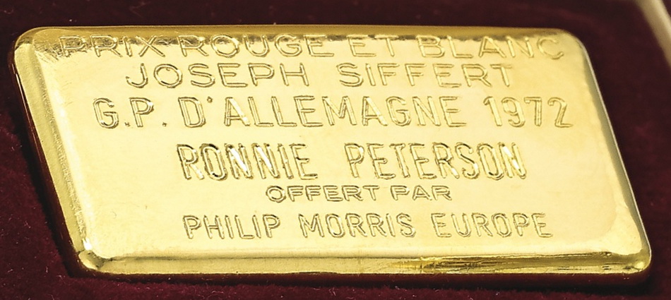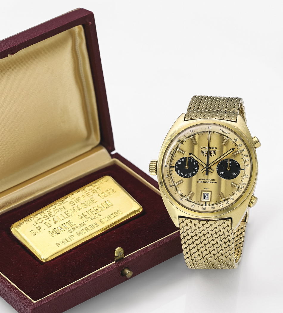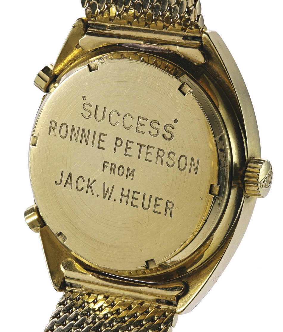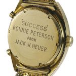 This watch was sold by Sotheby’s in May 2016 and purchased by the TAG Heuer Museum, for 225,000 CHF. Included in this lot is a Société de Banque Suisse 100g 999,9 fine gold bar, the “Prix Rouge et Blanc Joseph Siffert”, which was an award created for outstanding bravery. The present lot is one which was awarded to Ronnie Peterson for his performance at the Nürburgring, Germany G.P. in 1972. Here is the auction catalog listing.