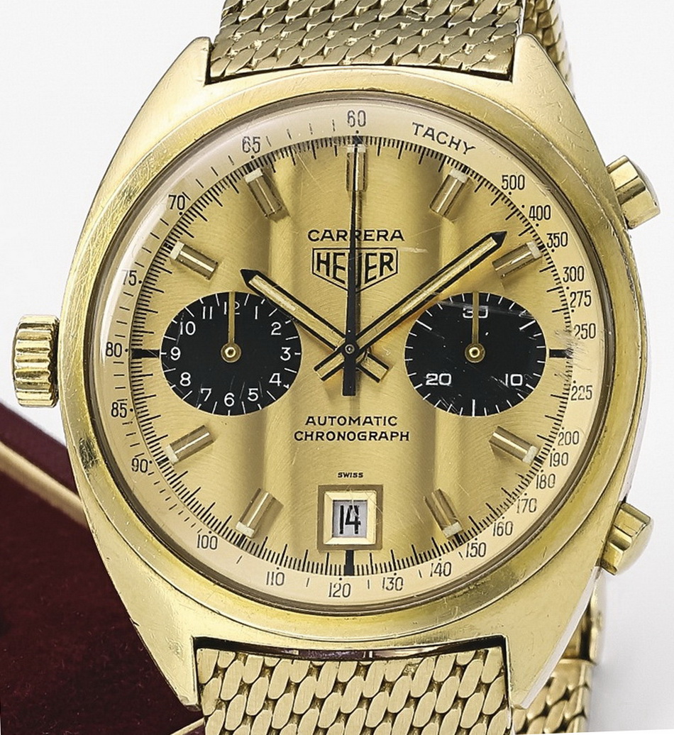 This is a unique watch, made for Ronnie Peterson. Reference 1158 case and hands, with dial from gold-plated, barrel-shaped Carrera (Ref 110.515 CHN). Dial has oval registers and Cotes de Geneve finish.