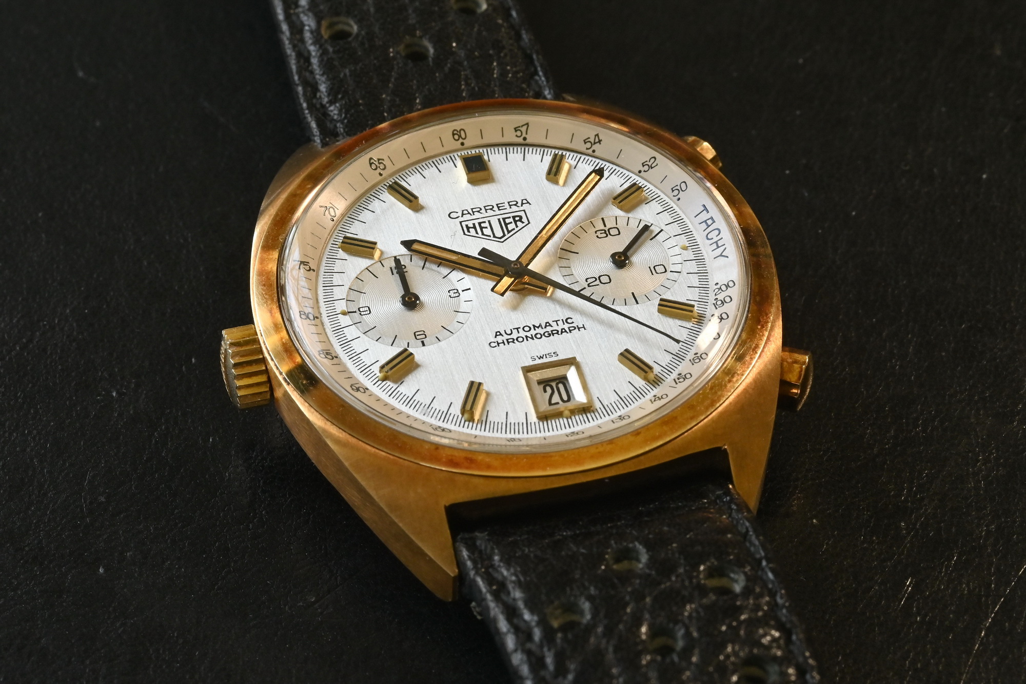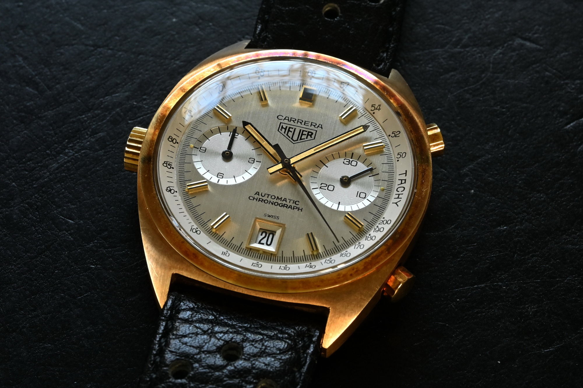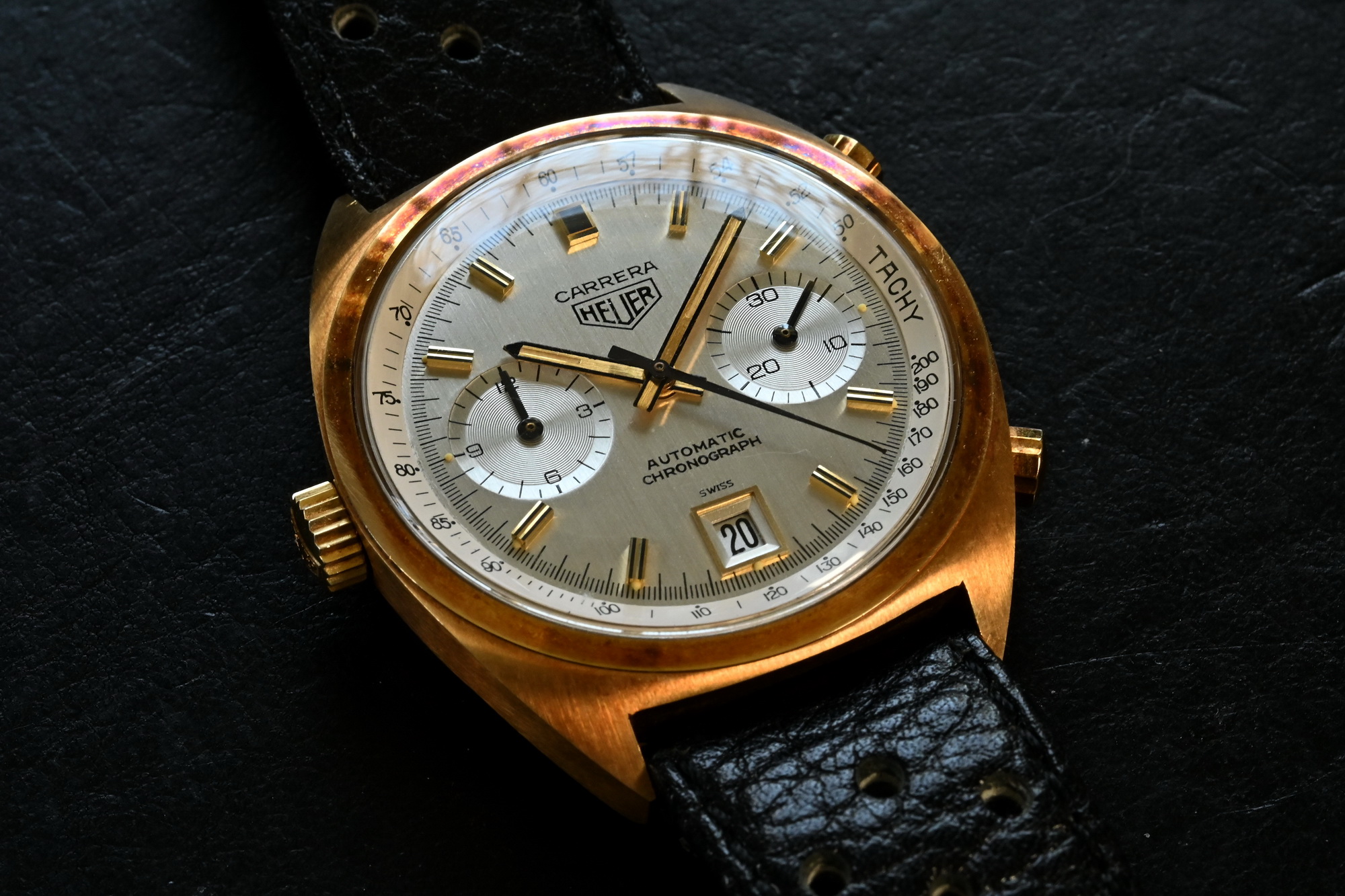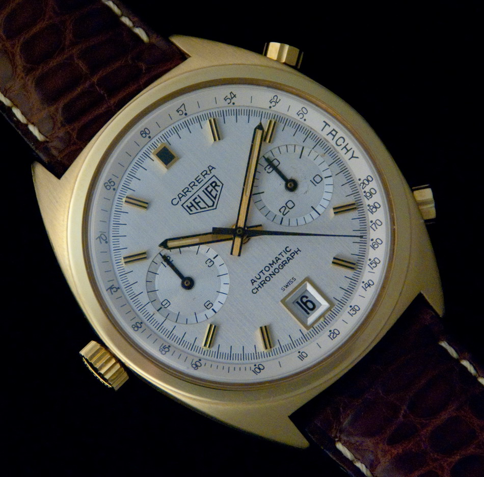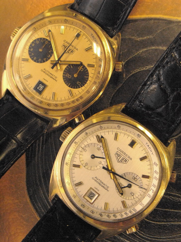 Mark 3 Carrera 1158 S has second execution dial (brushed gold applied markers and numerals 3-6-9-12 on the hour recorder) and brushed gold hands with black edges and luminous inserts