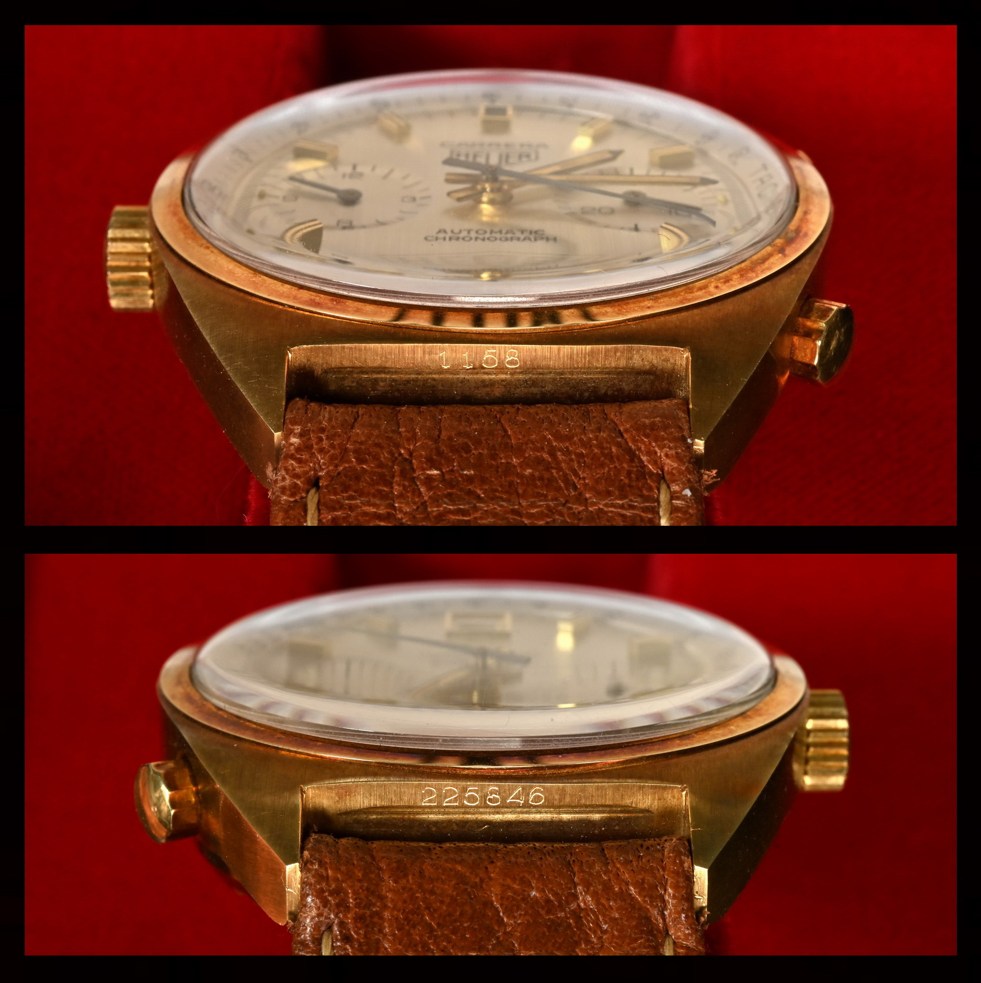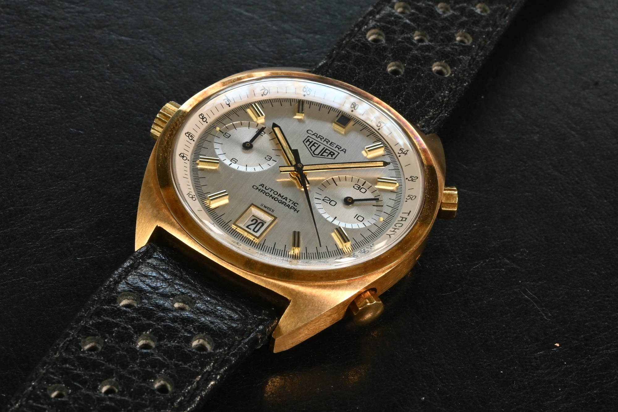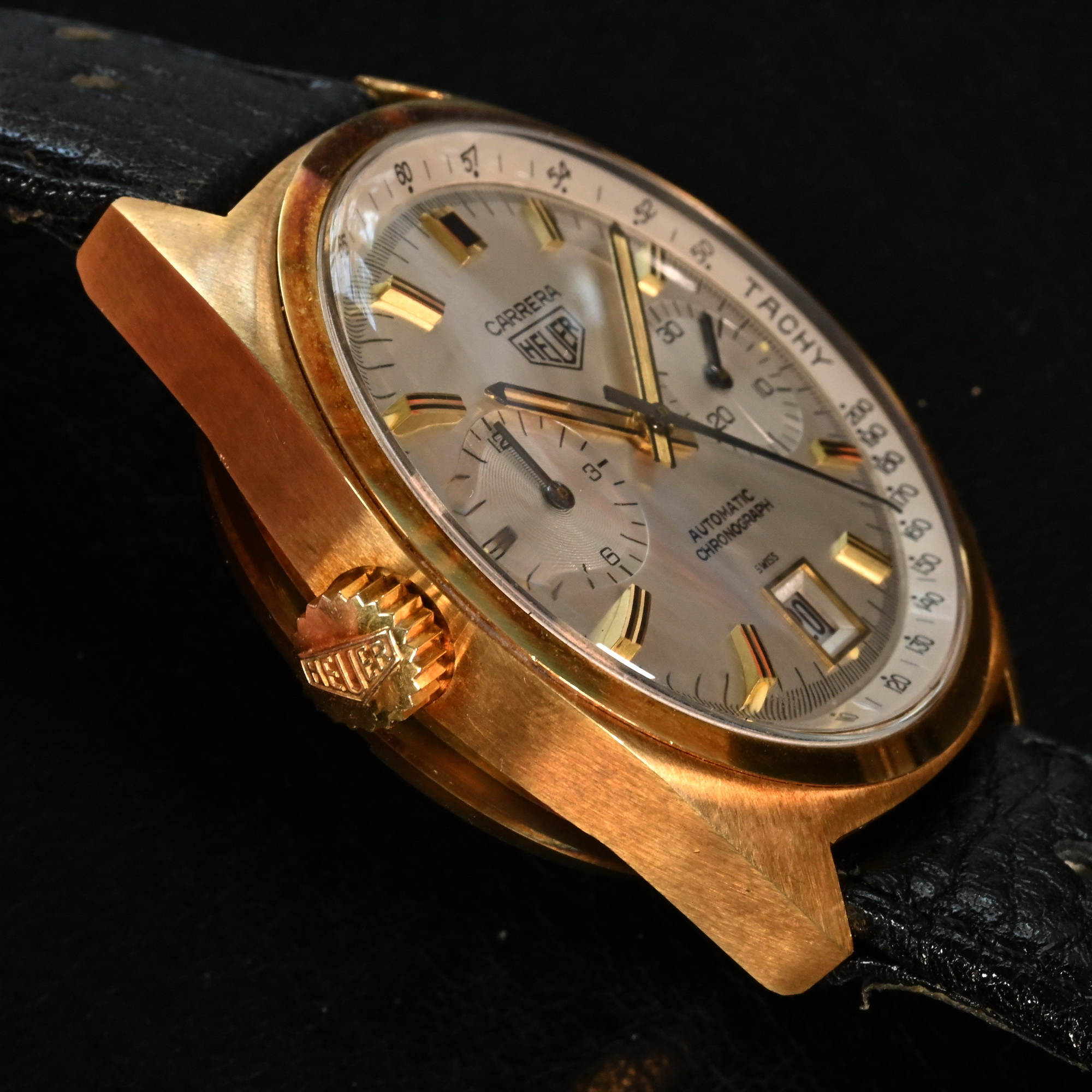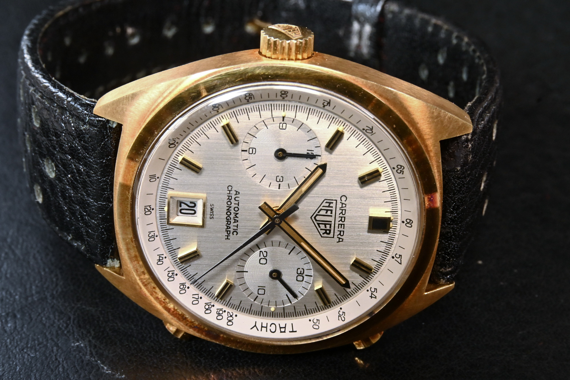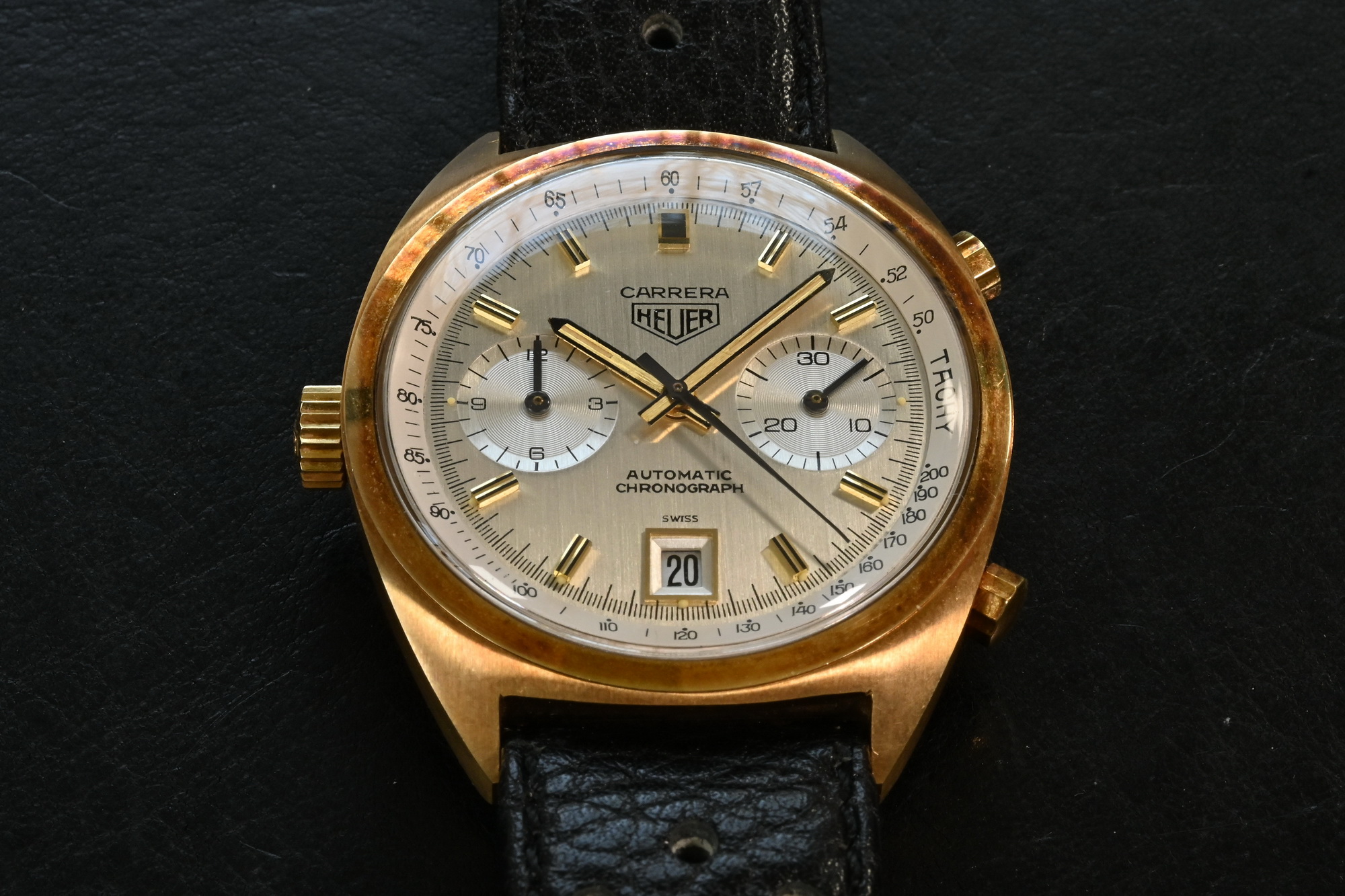 Mark 3 Carrera 1158 S has second execution dial (brushed gold applied markers and numerals 3-6-9-12 on the hour recorder) and brushed gold hands with black edges and luminous inserts