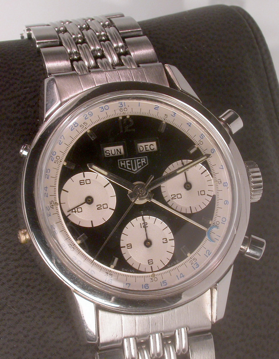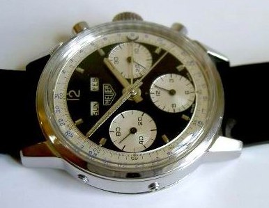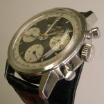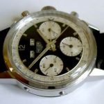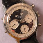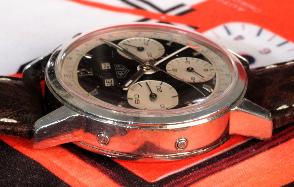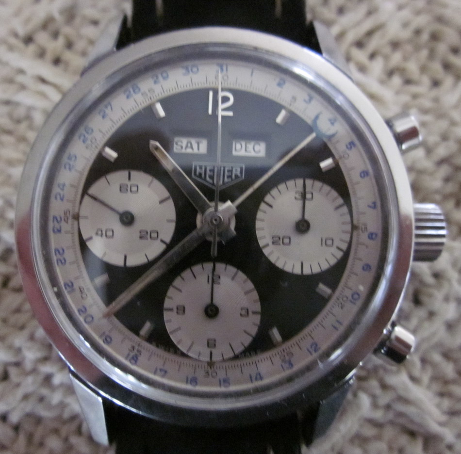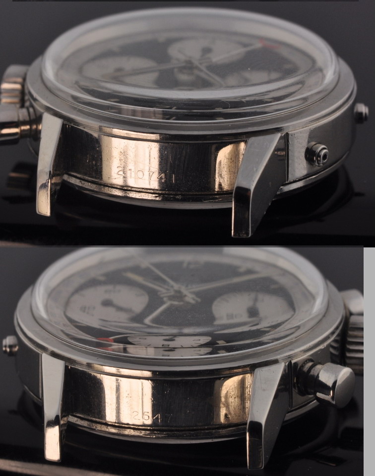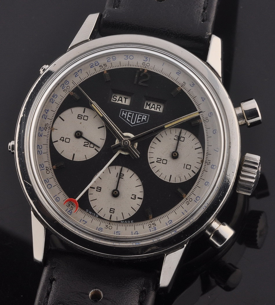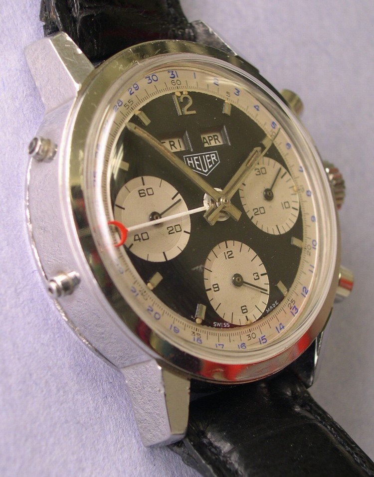 Carrera 12 Dato (Reference 2547) N has narrow lugs; black dial with white registers; monocoque case