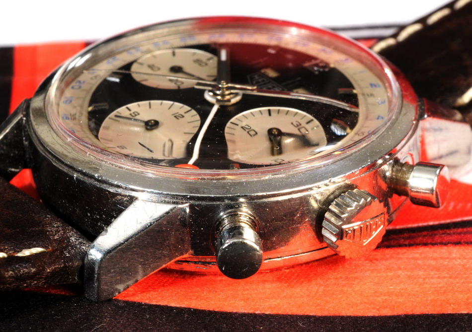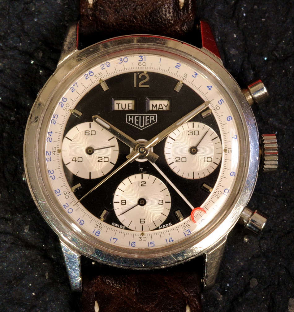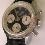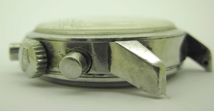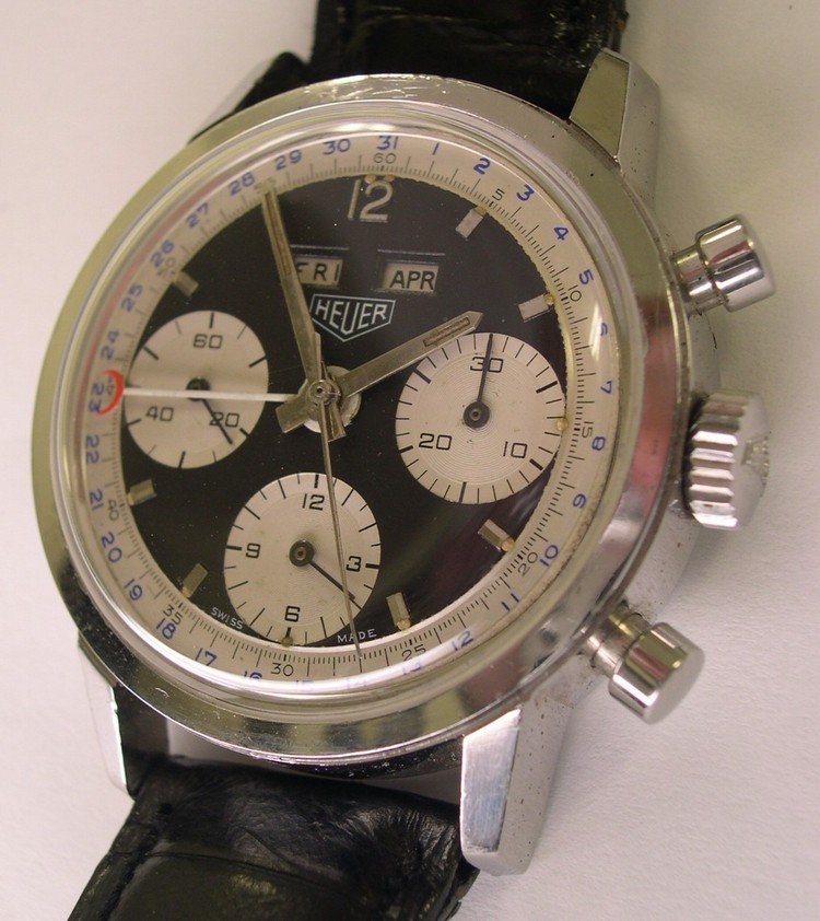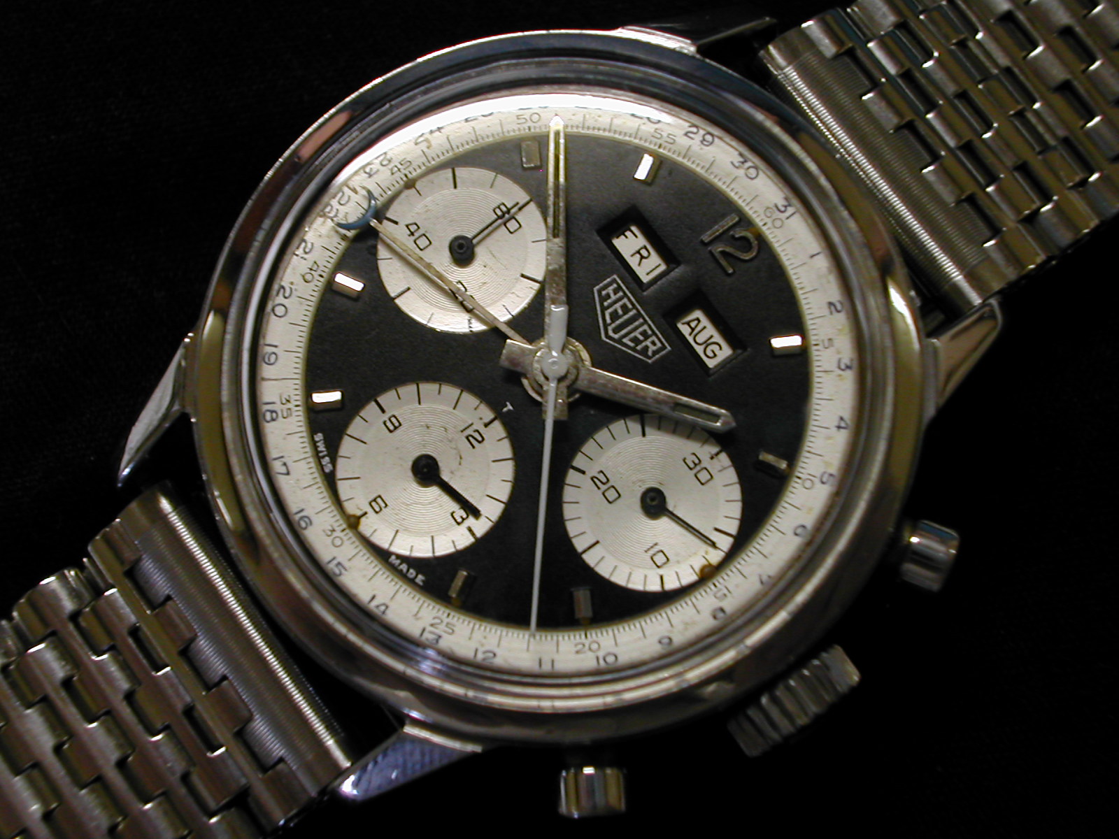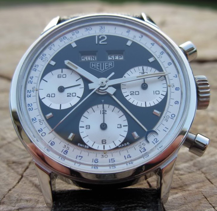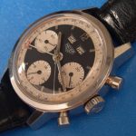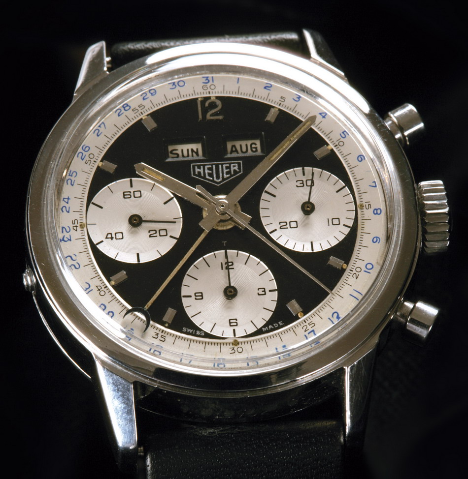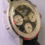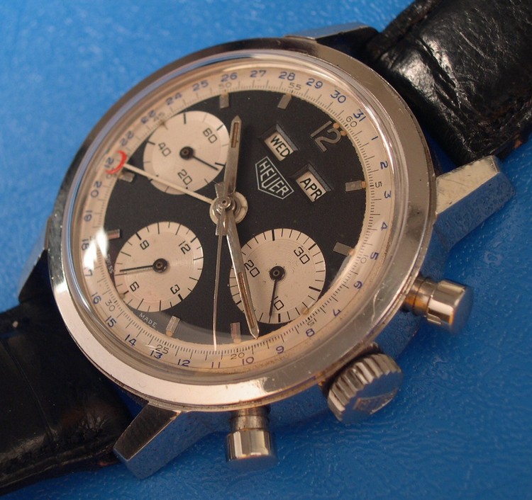 Carrera 12 Dato (Reference 2547) N has narrow lugs; black dial with white registers; monocoque case