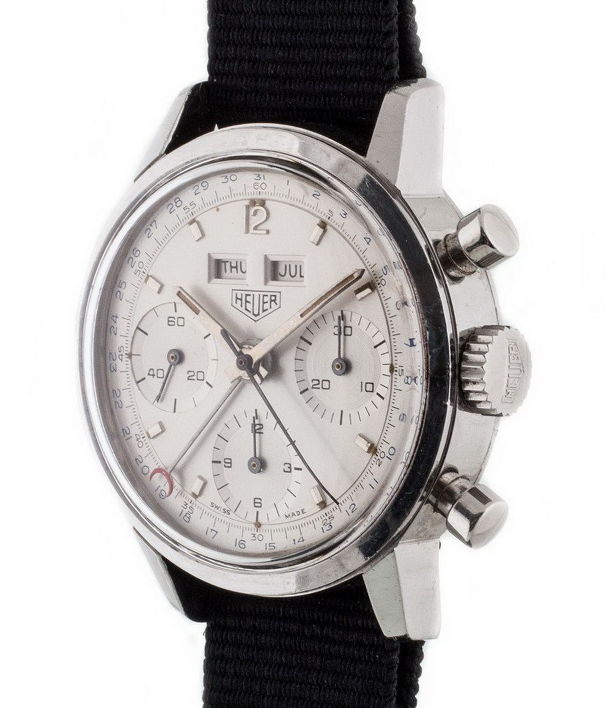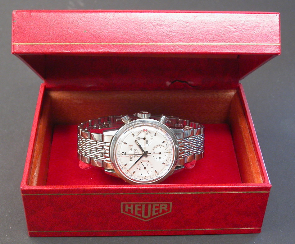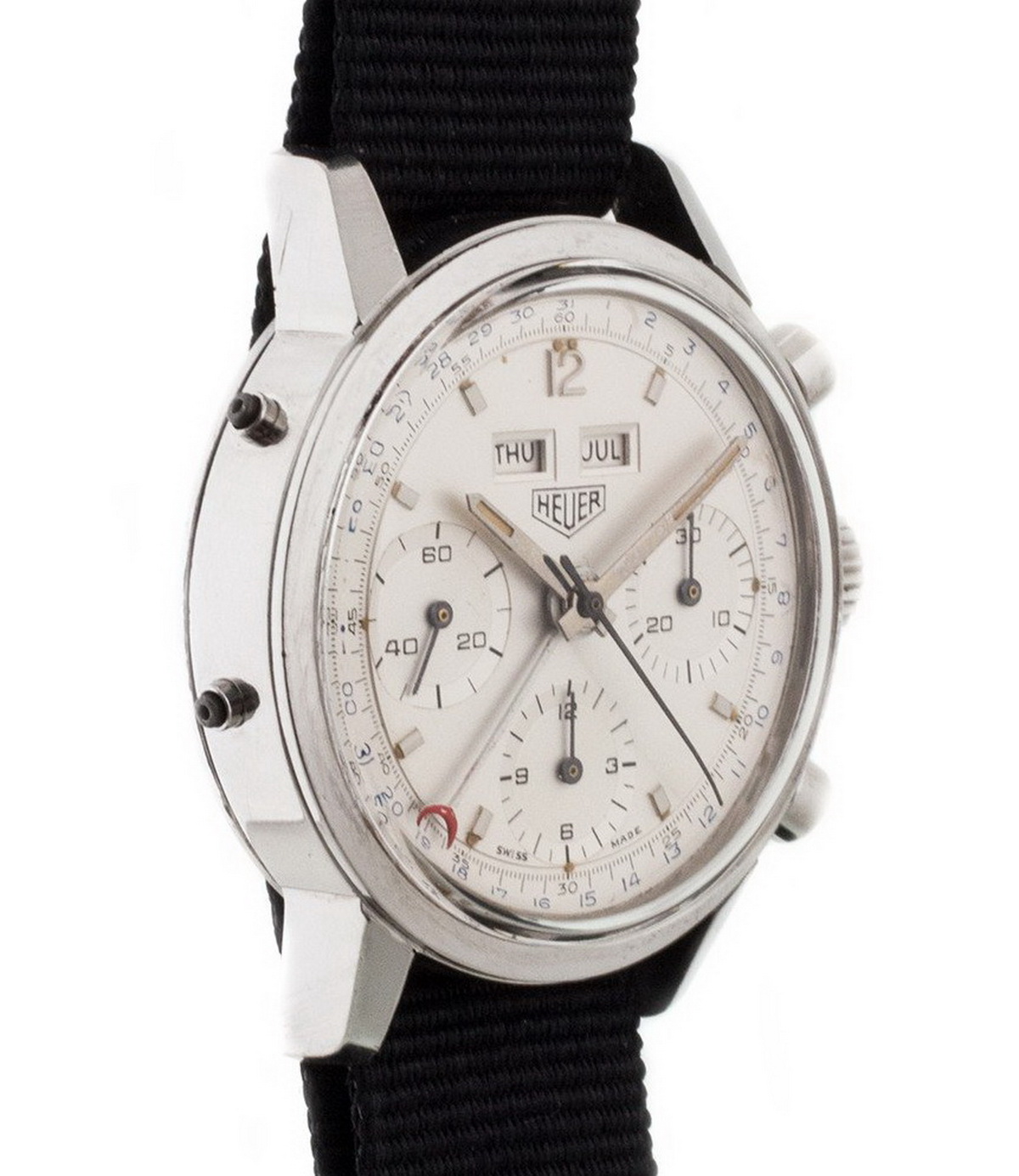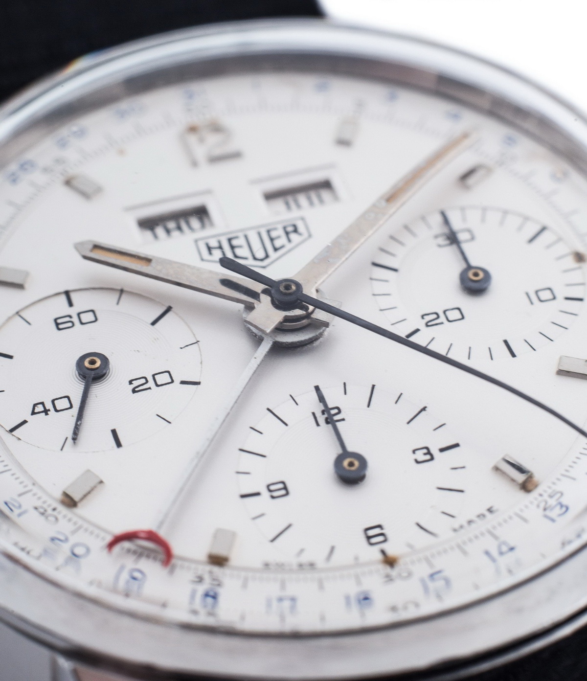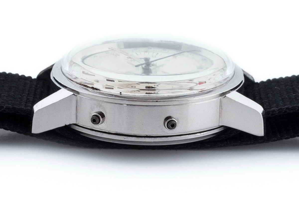 Second execution Carrera 12 Dato (Reference 2547) S has narrow lugs; white dial and registers; monocoque case