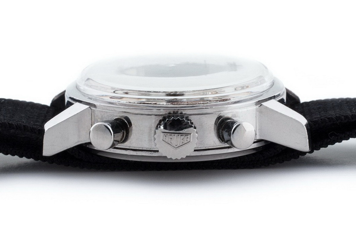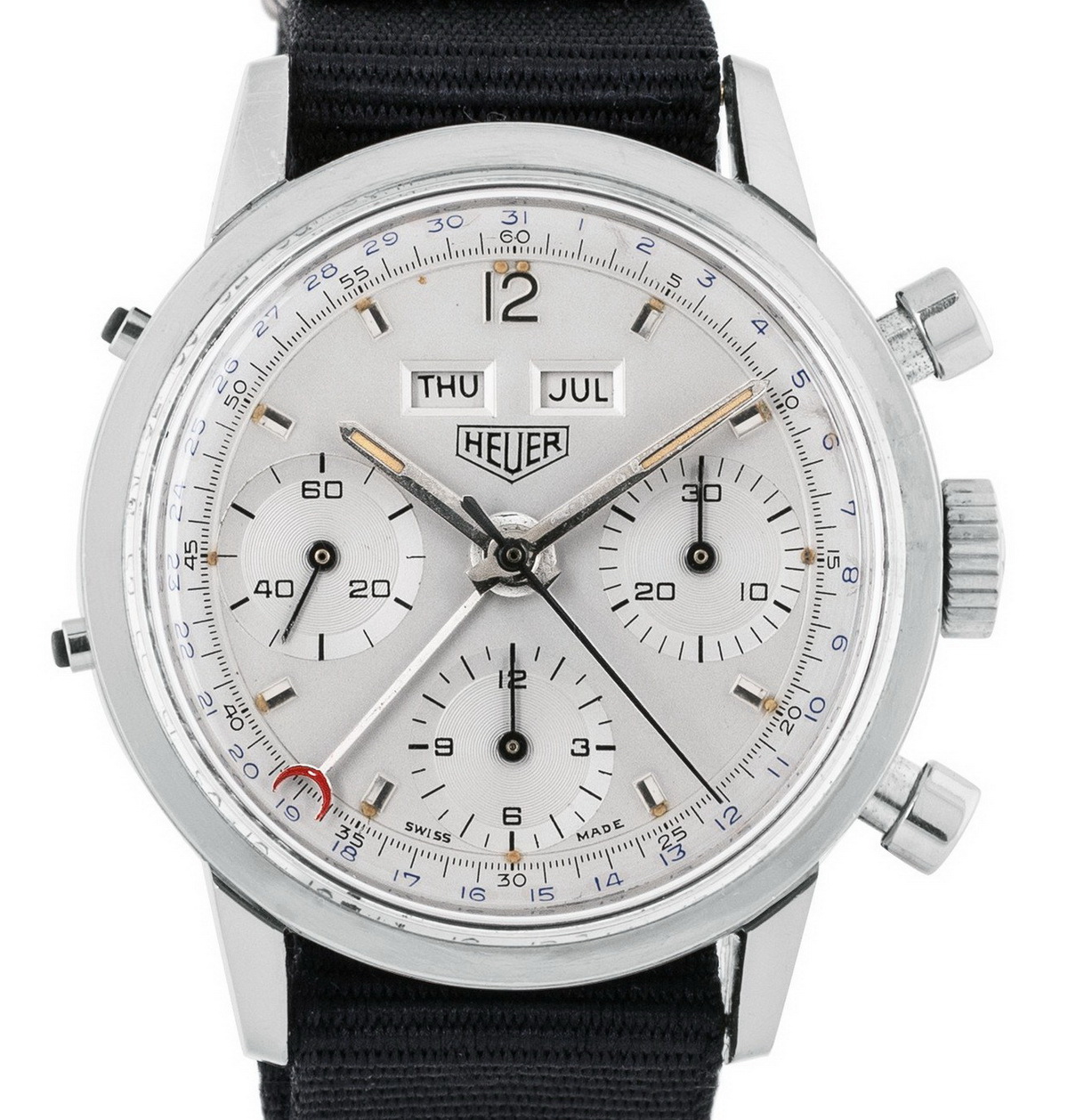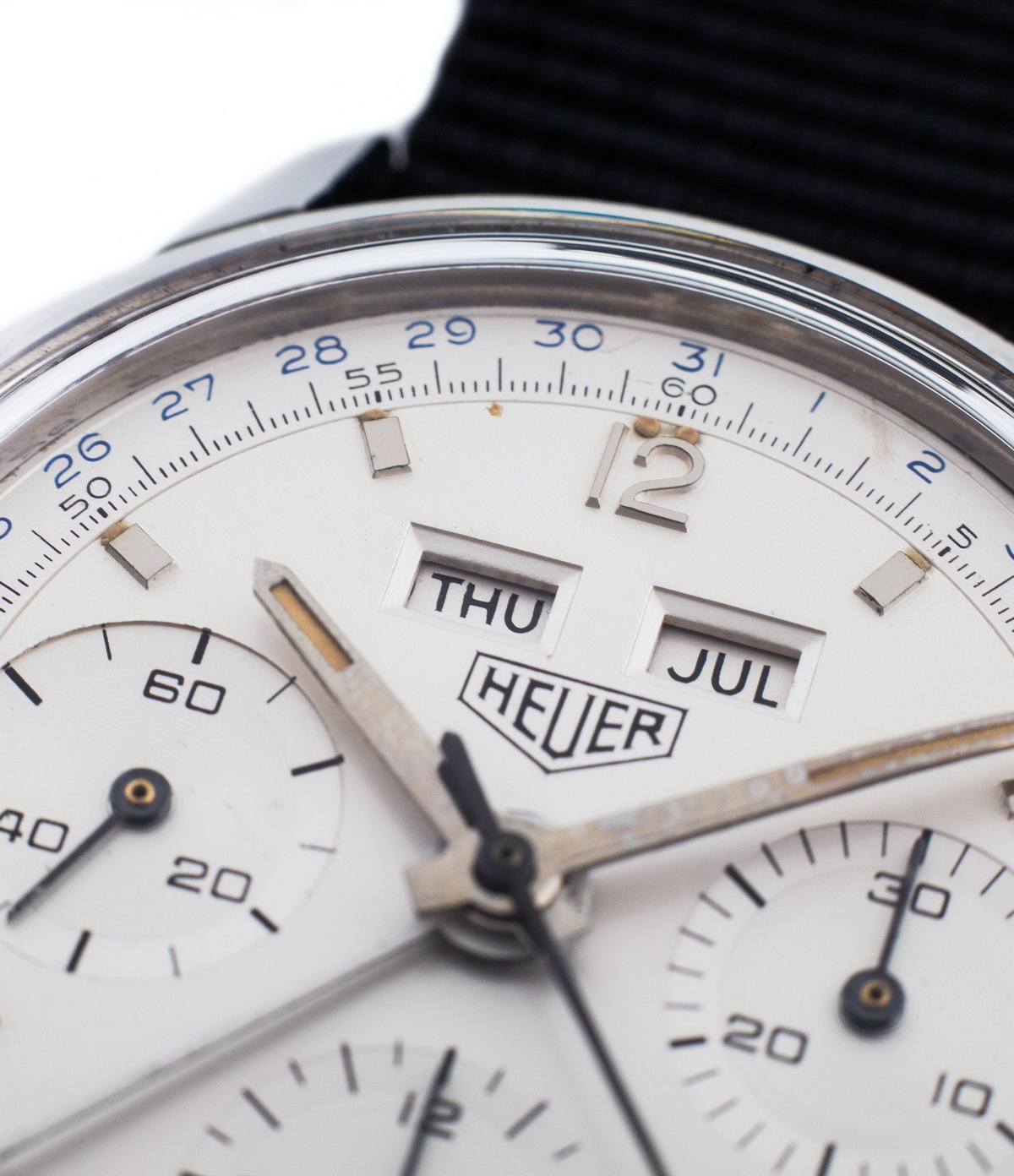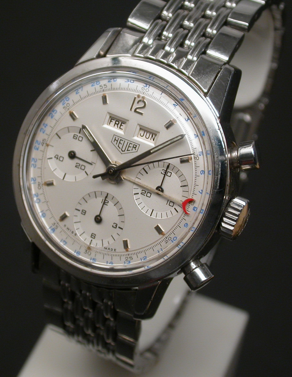 Second execution Carrera 12 Dato (Reference 2547) S has narrow lugs; white dial and registers; monocoque case
