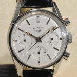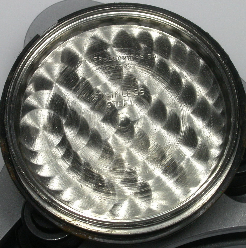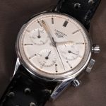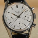 White dial with white registers (eggshell); case and movement marked Heuer-Leonidas