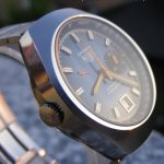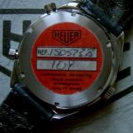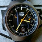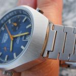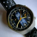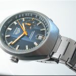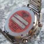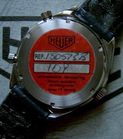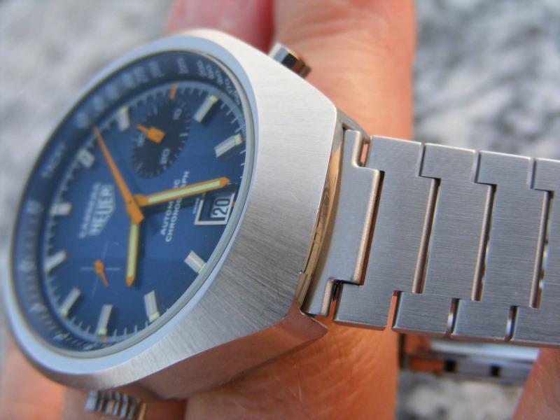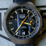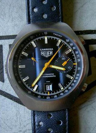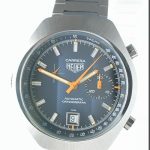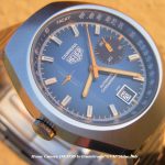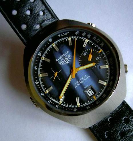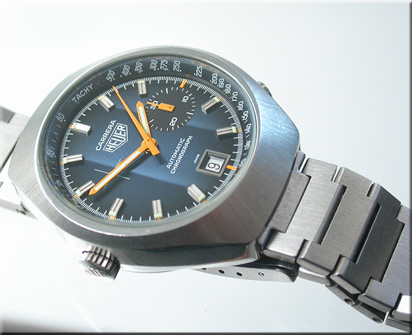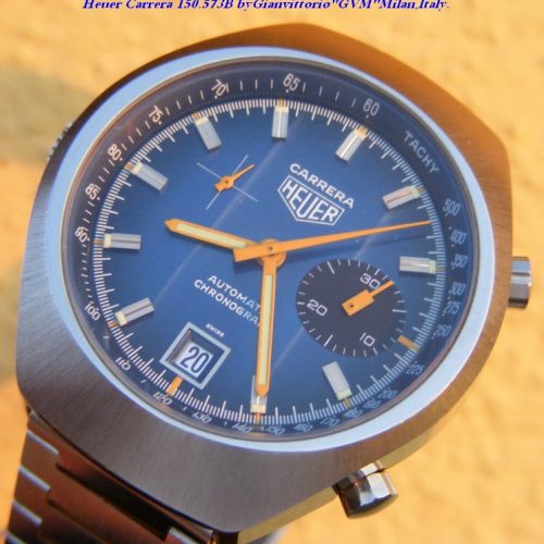 Reference 150.573 B Carrera has blue dial with luminous metallic finish (Cotes de Geneve), orange edged hands and orange chronograph needles, 30 minute capacity