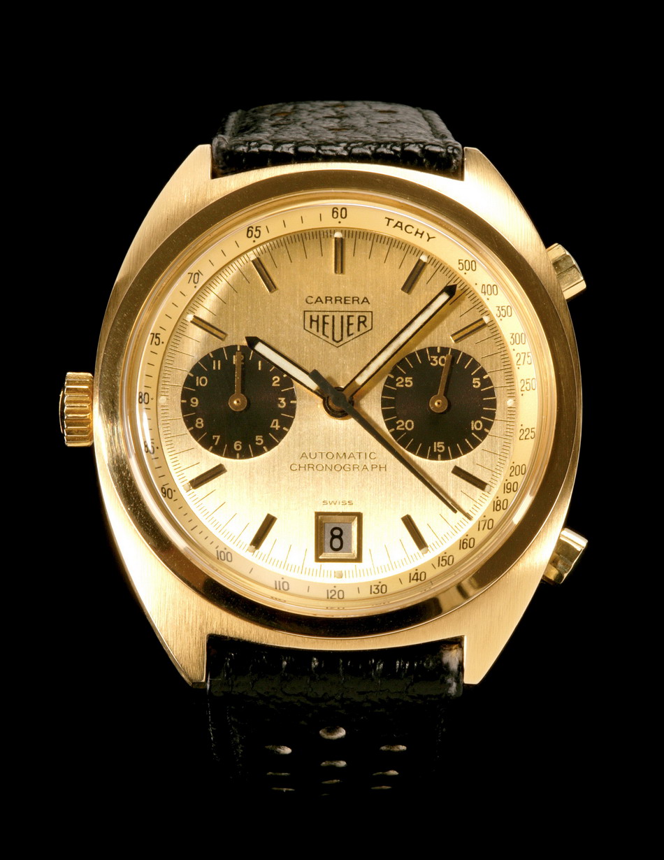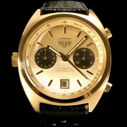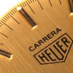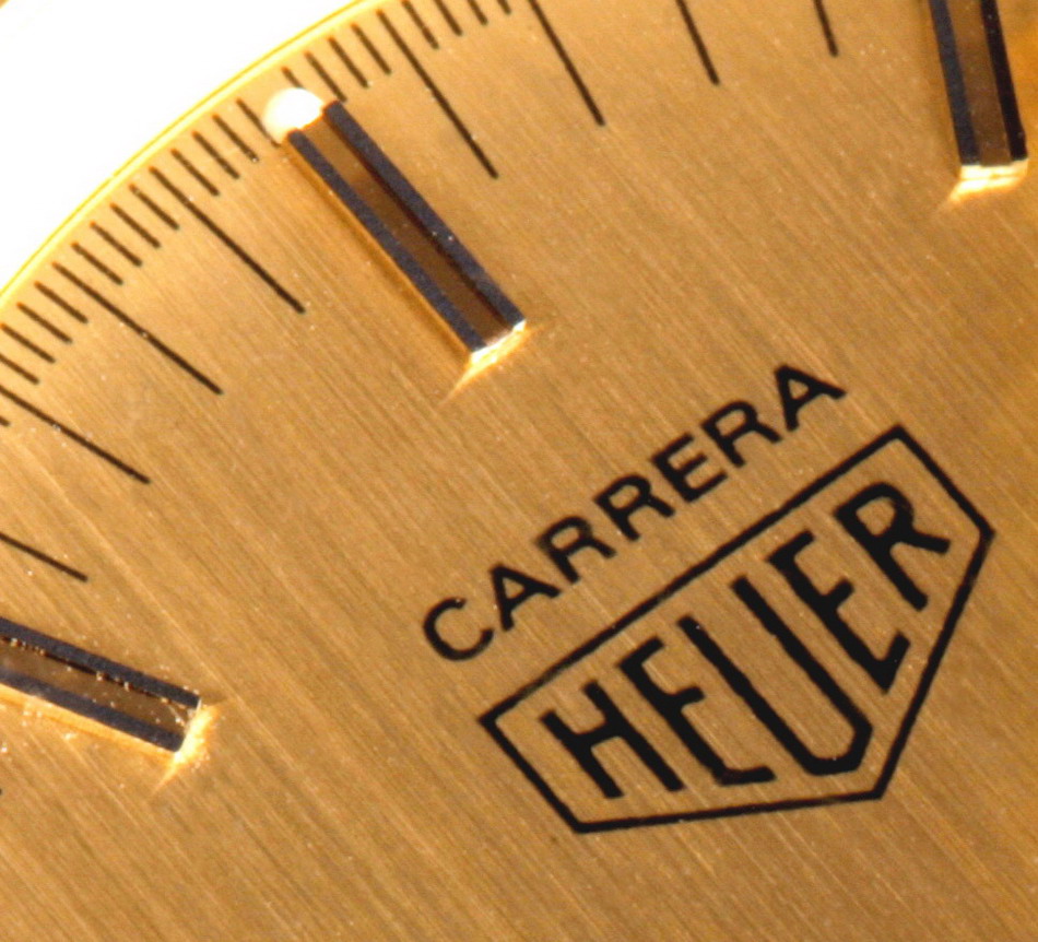 Carrera Reference 110.255 CHN has gold-plated case; luminous champagne dial with matching bezel; black registers; fourth execution hands (painted gold, with black edges and full-length lume); the word "Carrera" is narrower than on other models, and does not extend beyond the Heuer shield.