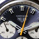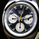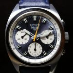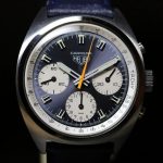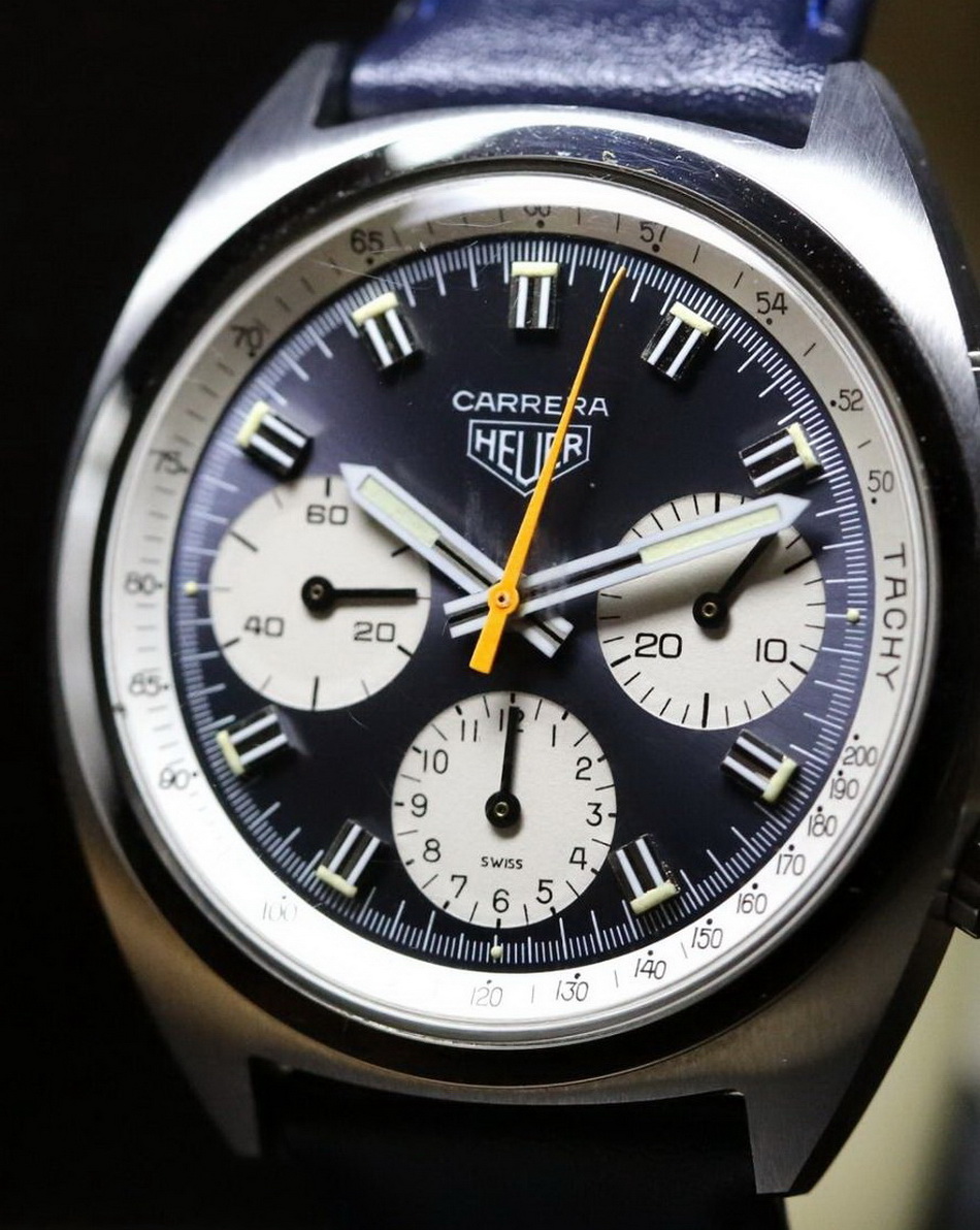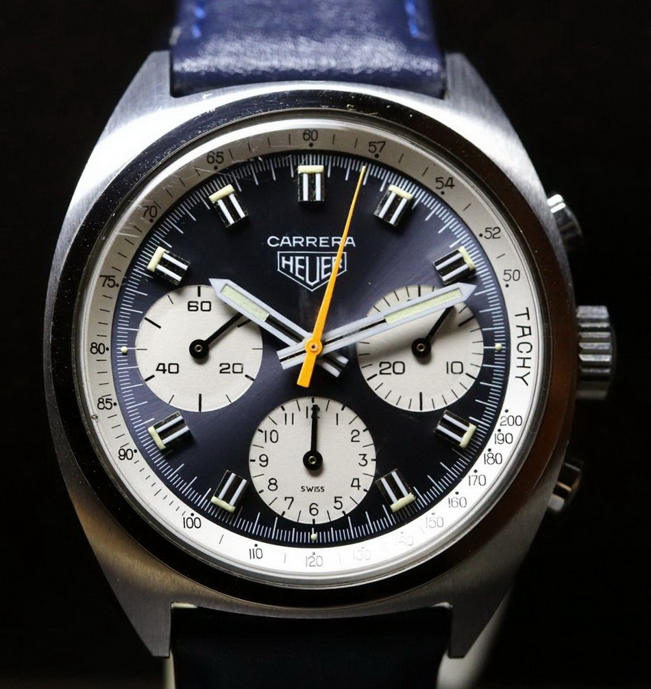 Second execution Reference 73655 N has second execution dial (wide markers and 1-through-12 on hour recorder) and third execution hands, with deep blue dial and white registers
