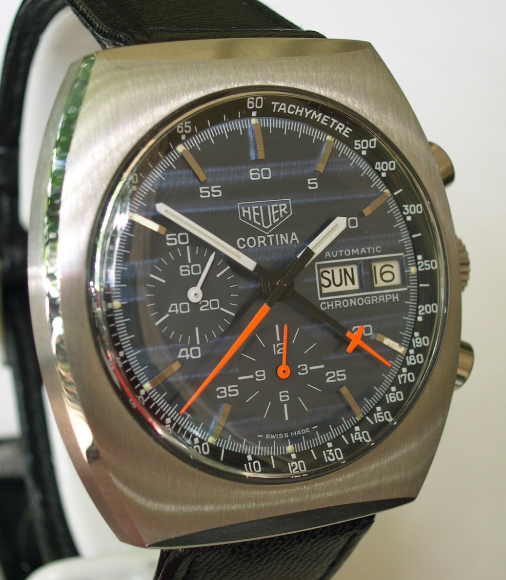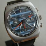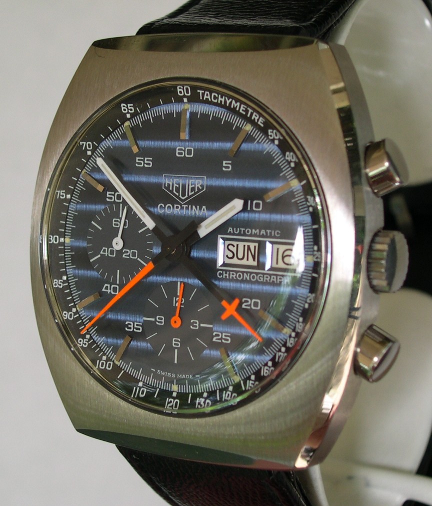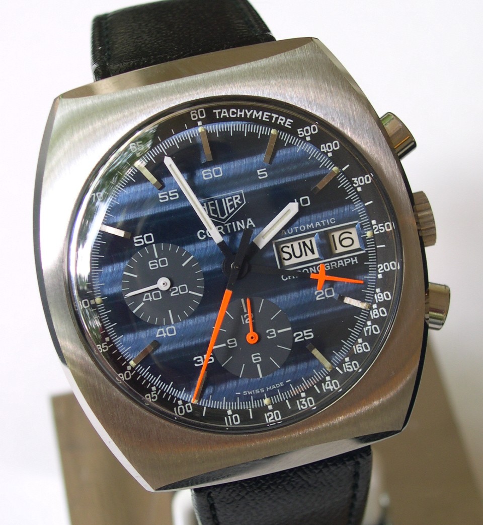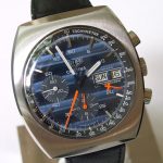 Blue dial, with applied steel markers and small numerals; inner tachymeter bezel; orange chronograph hands; cushion case