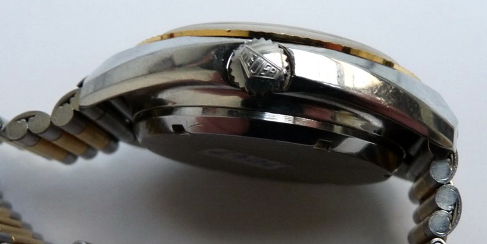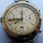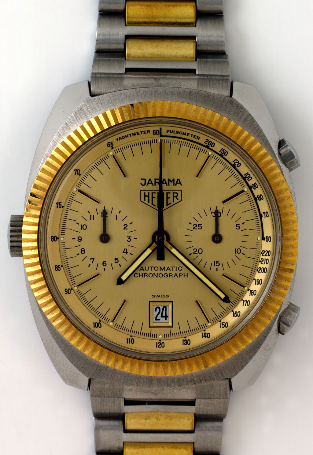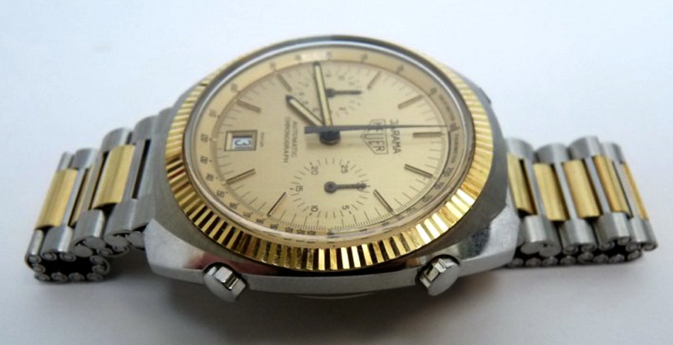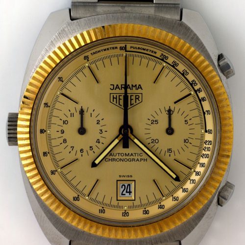The Reference 110.225 Jarama has a stainless steel case with gold fluted bezel; champagne dial