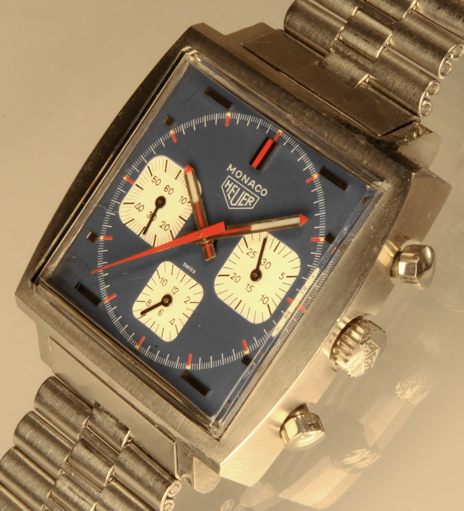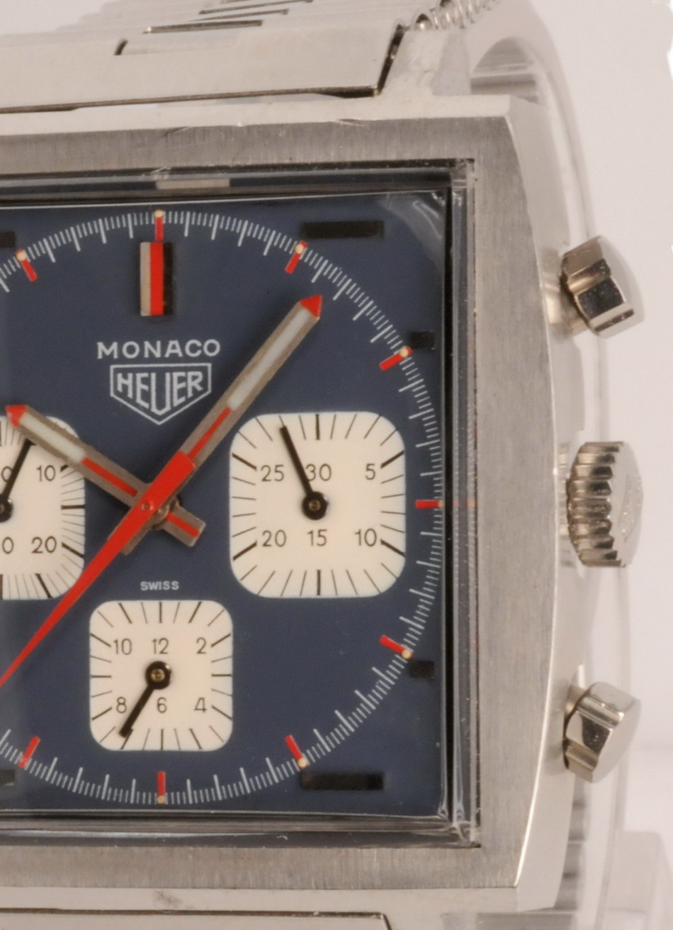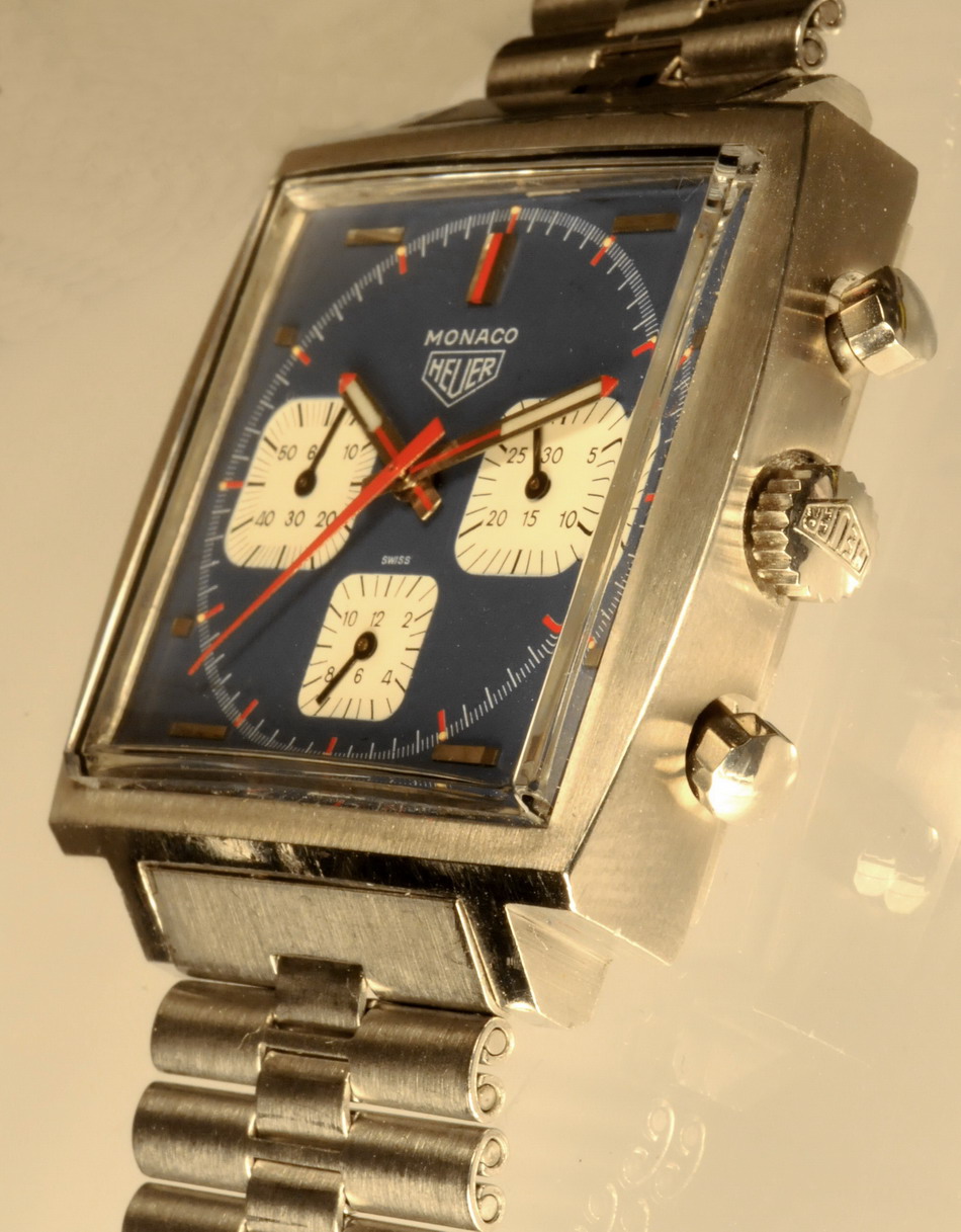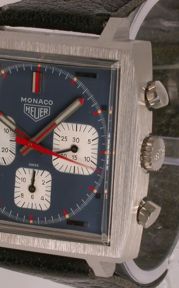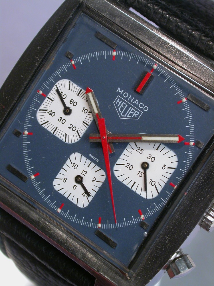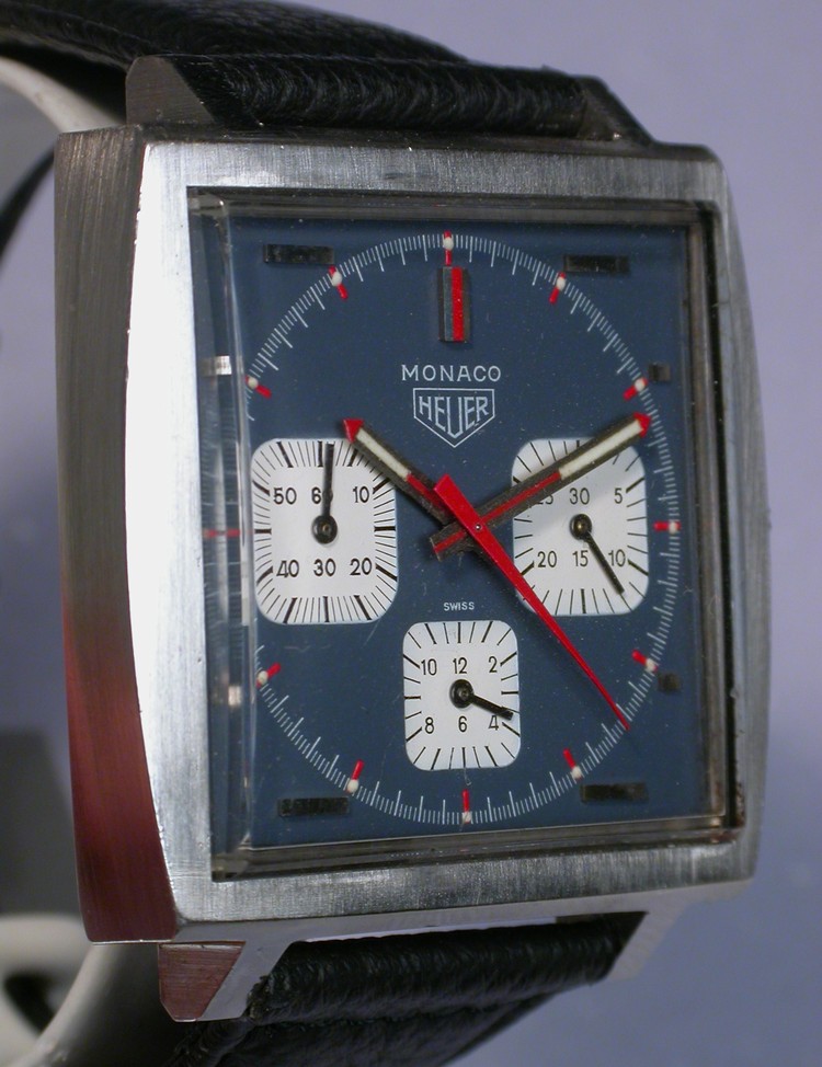 Blue dial with white registers; brushed steel hands with luminous and red inserts, and red triangular tips