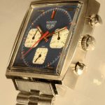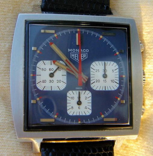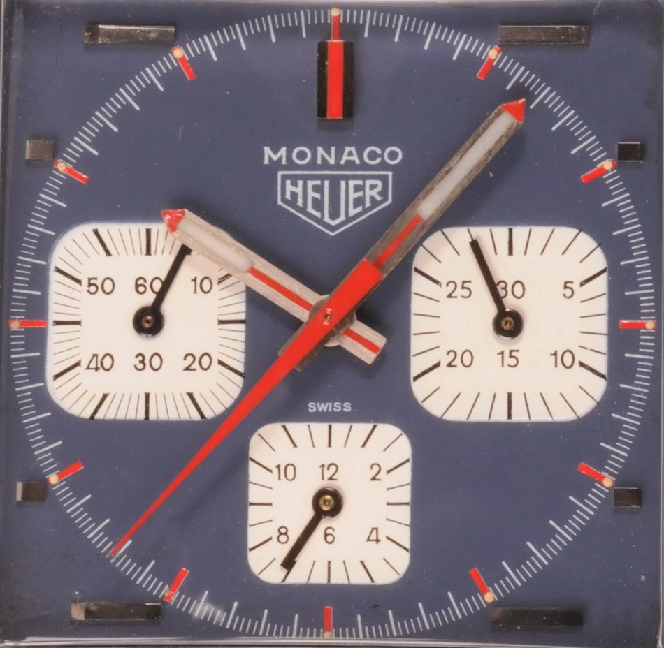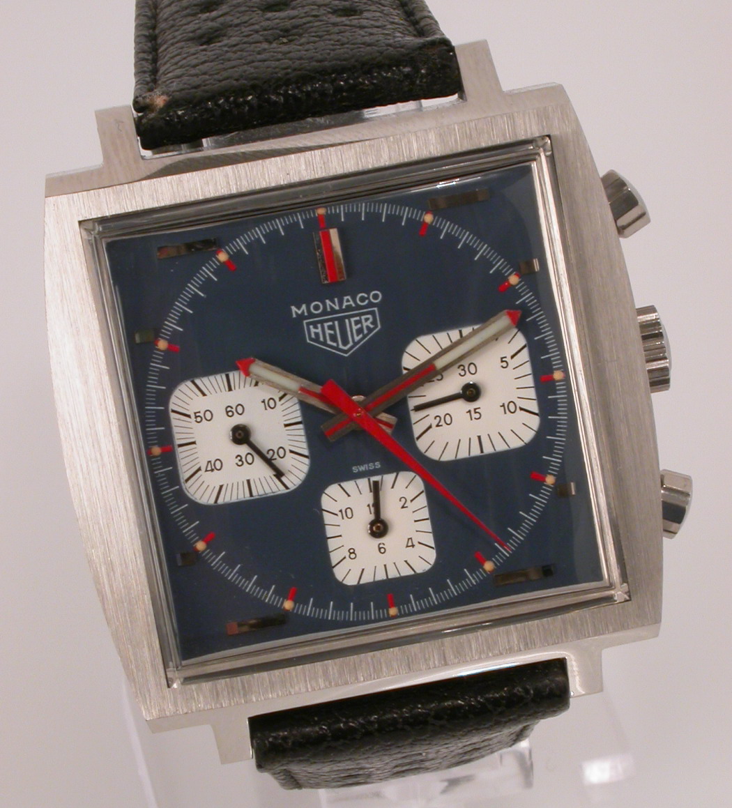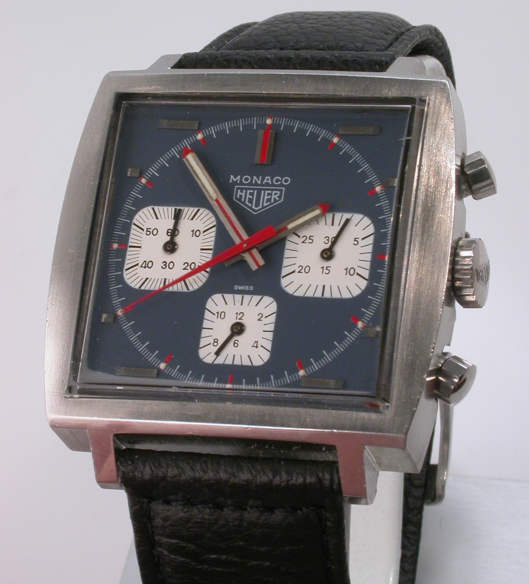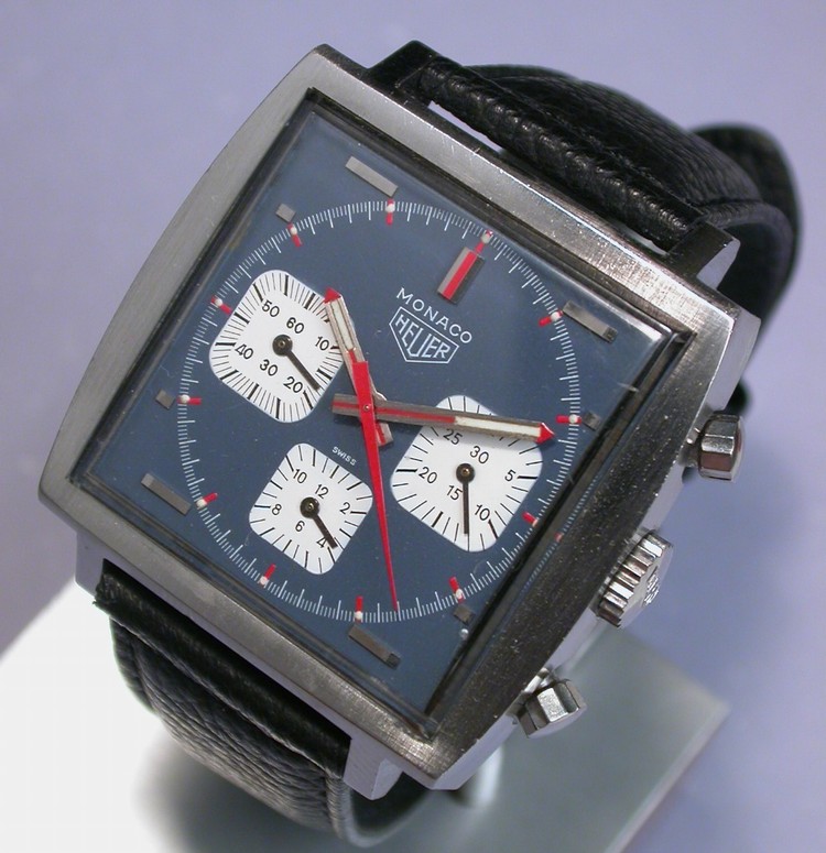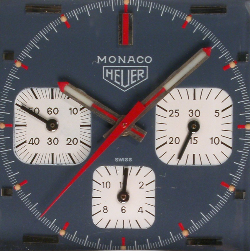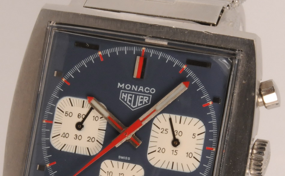 Blue dial with white registers; brushed steel hands with luminous and red inserts, and red triangular tips