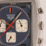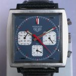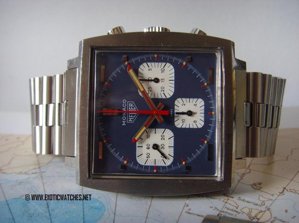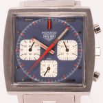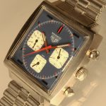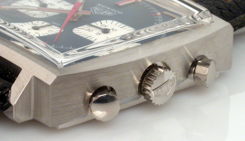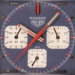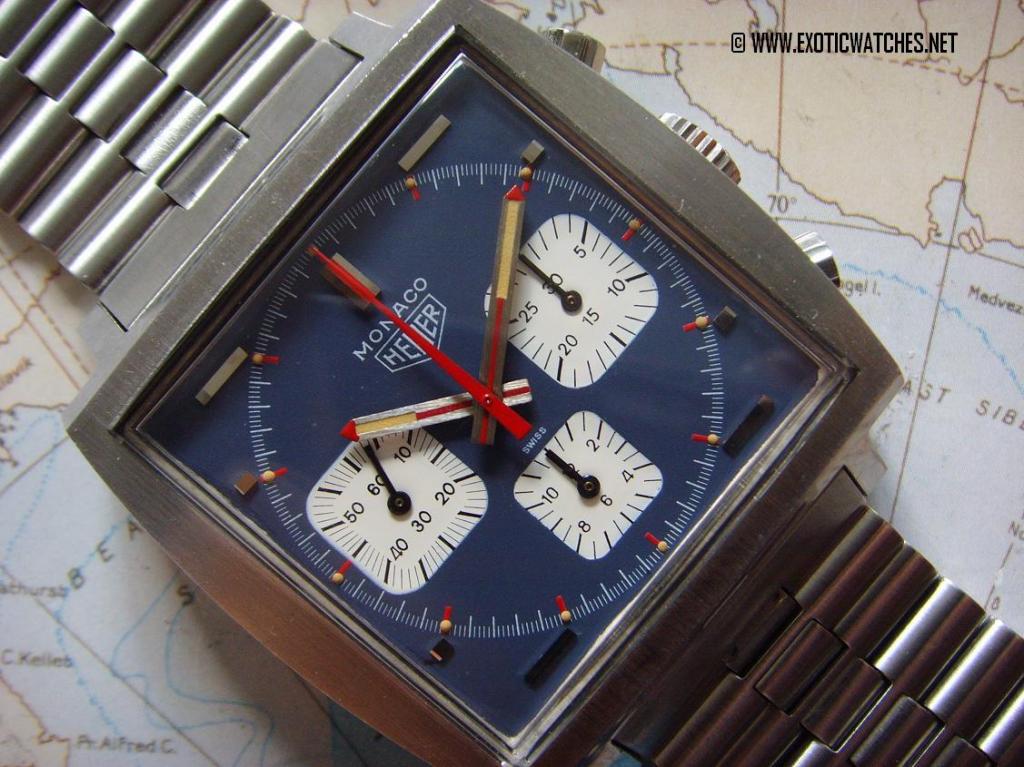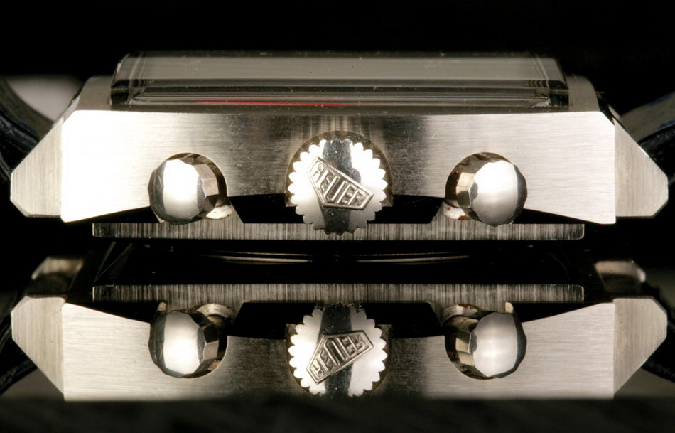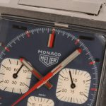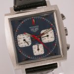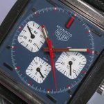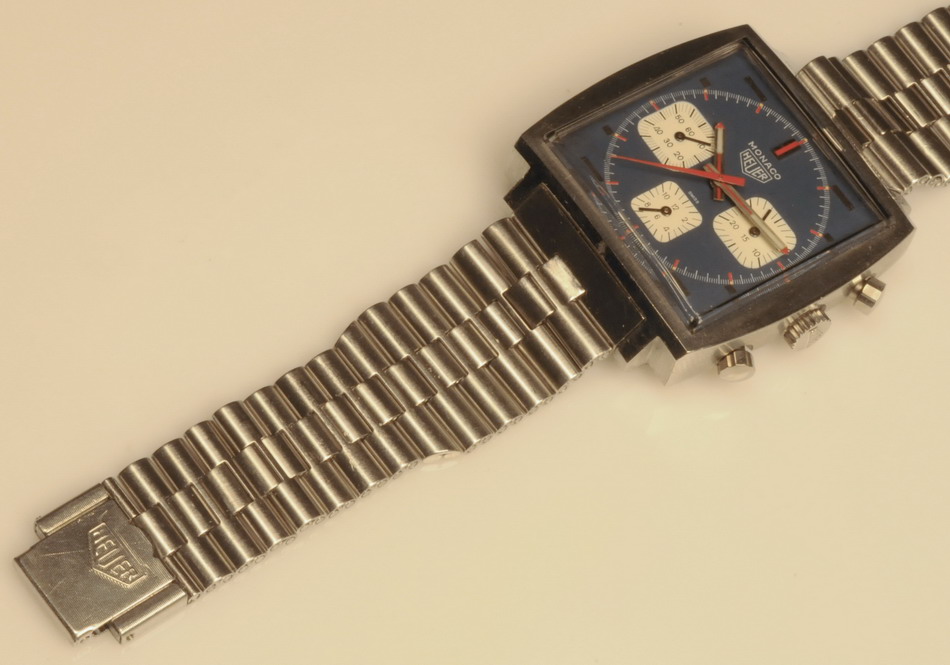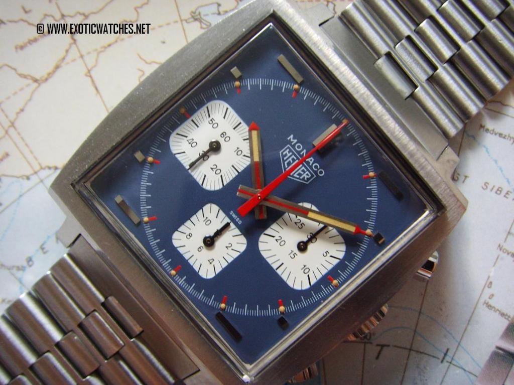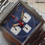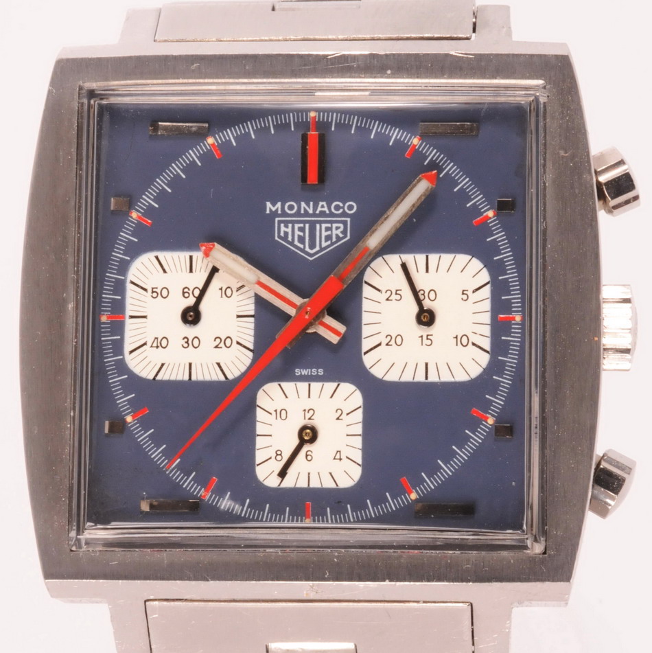 Blue dial with white registers; brushed steel hands with luminous and red inserts, and red triangular tips