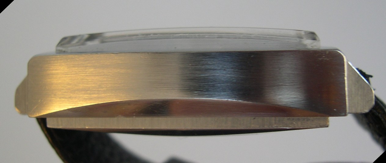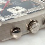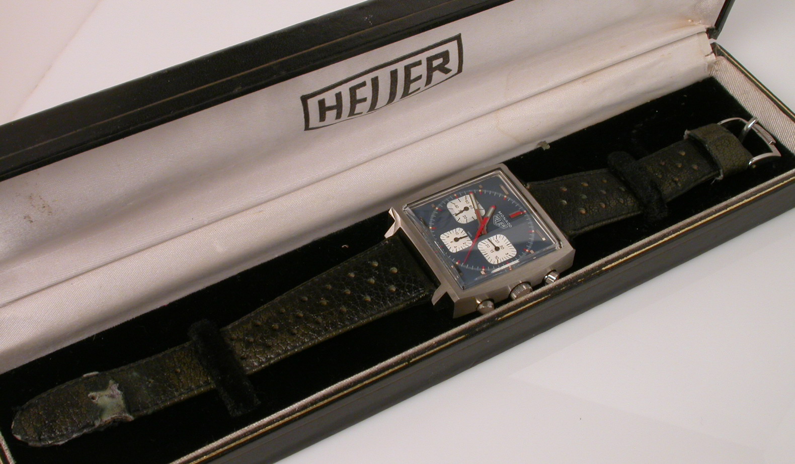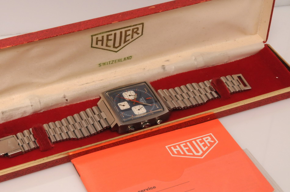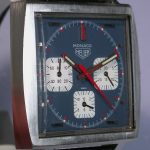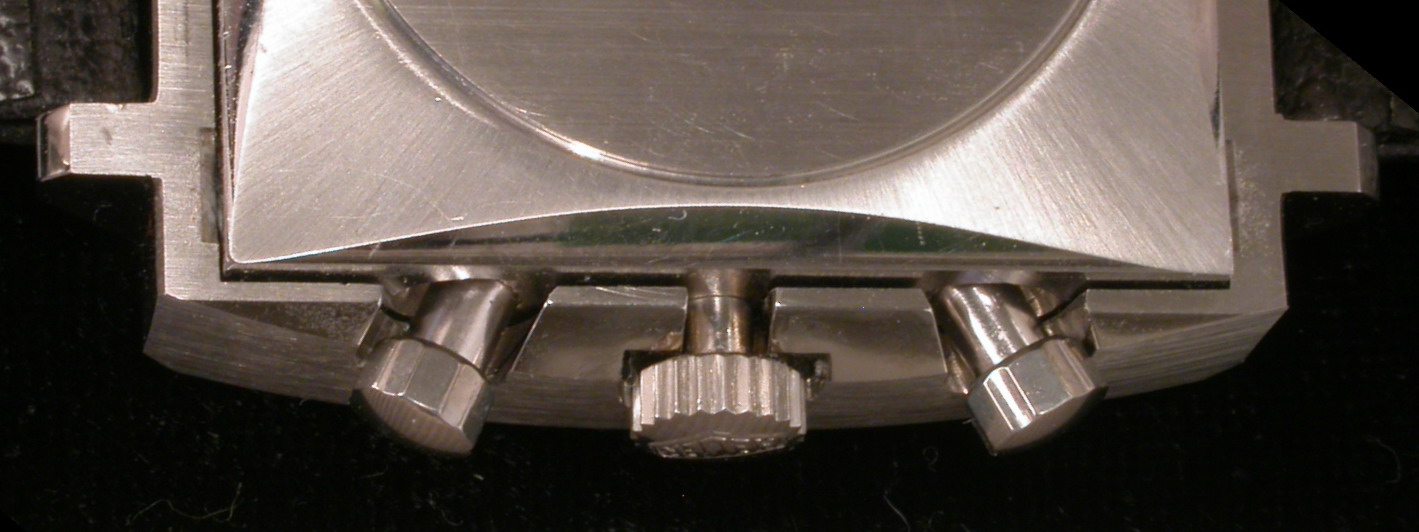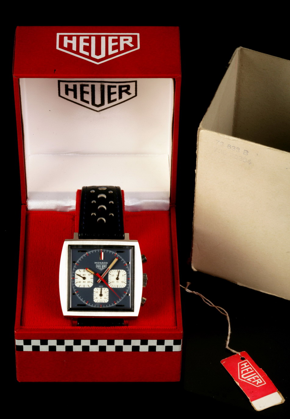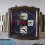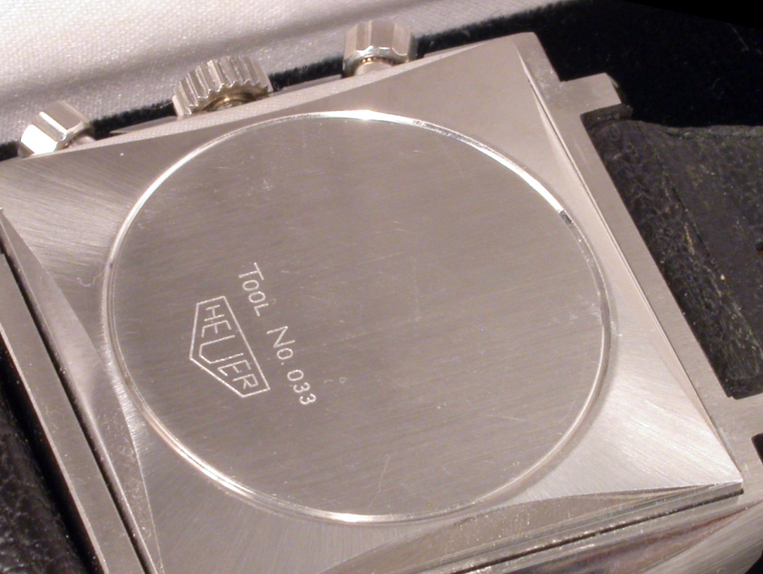 Blue dial with white registers; brushed steel hands with luminous and red inserts, and red triangular tips