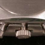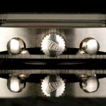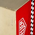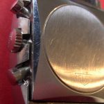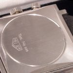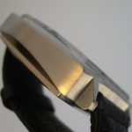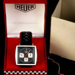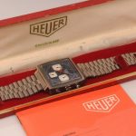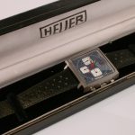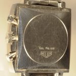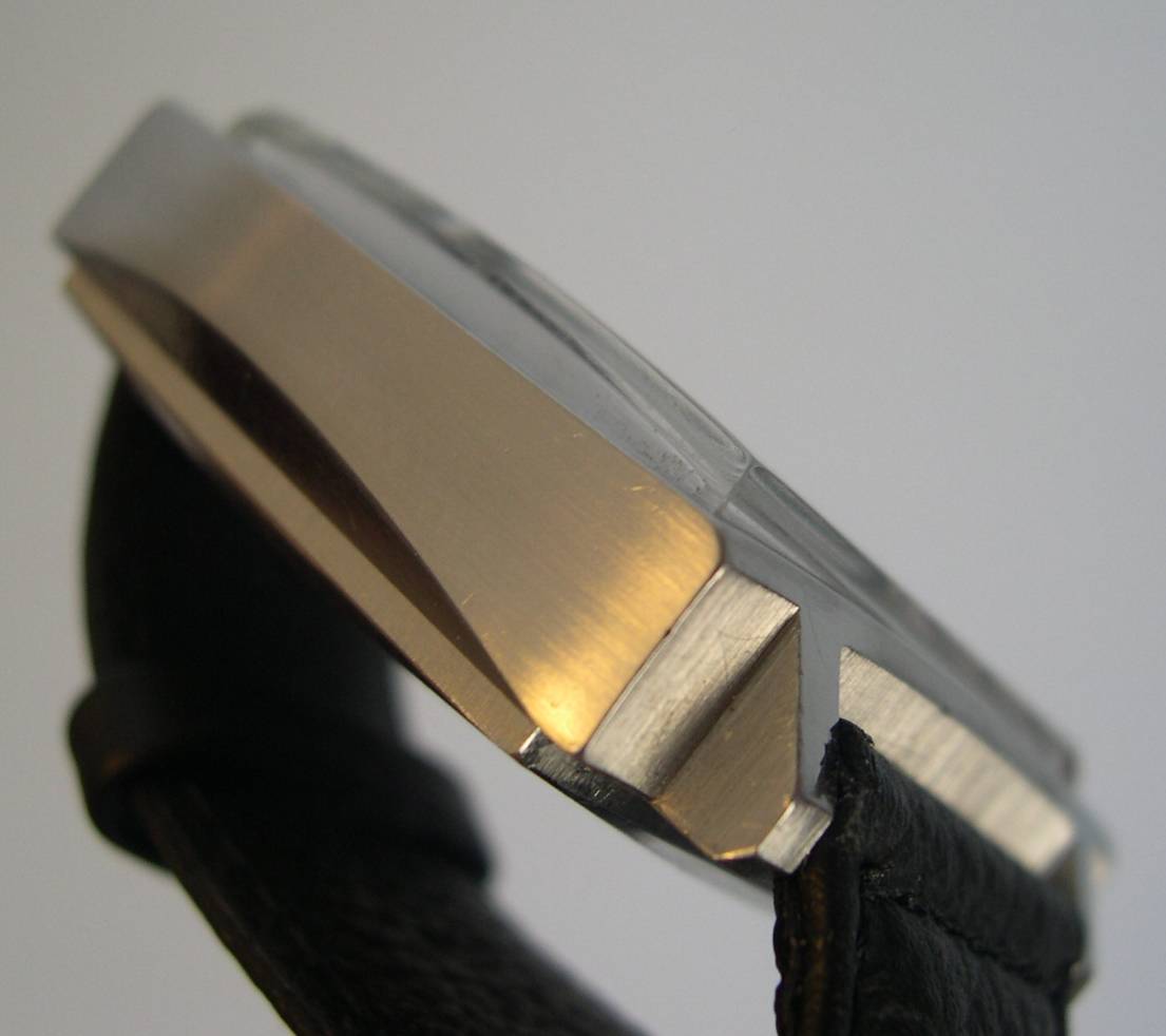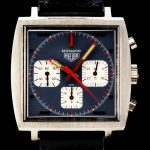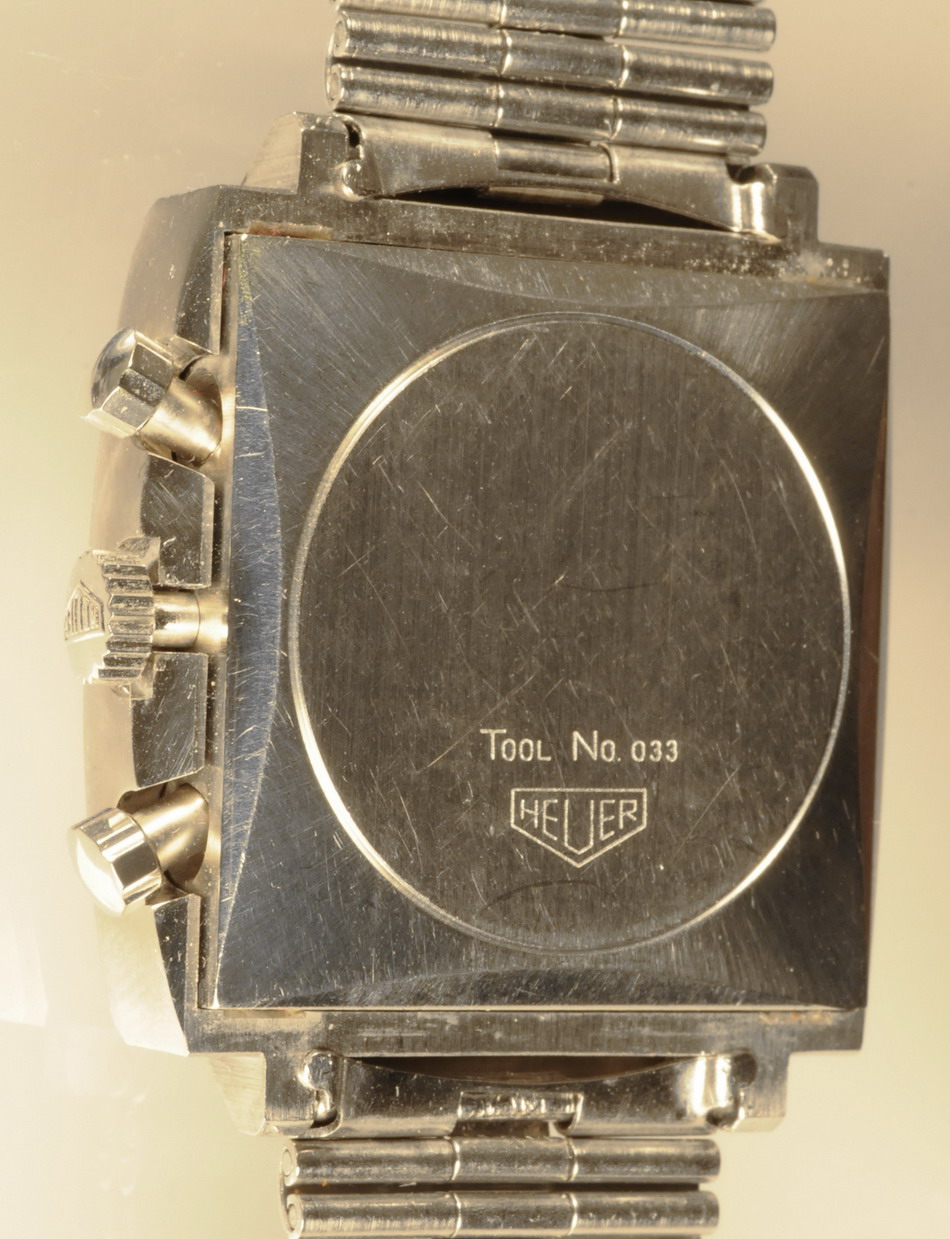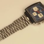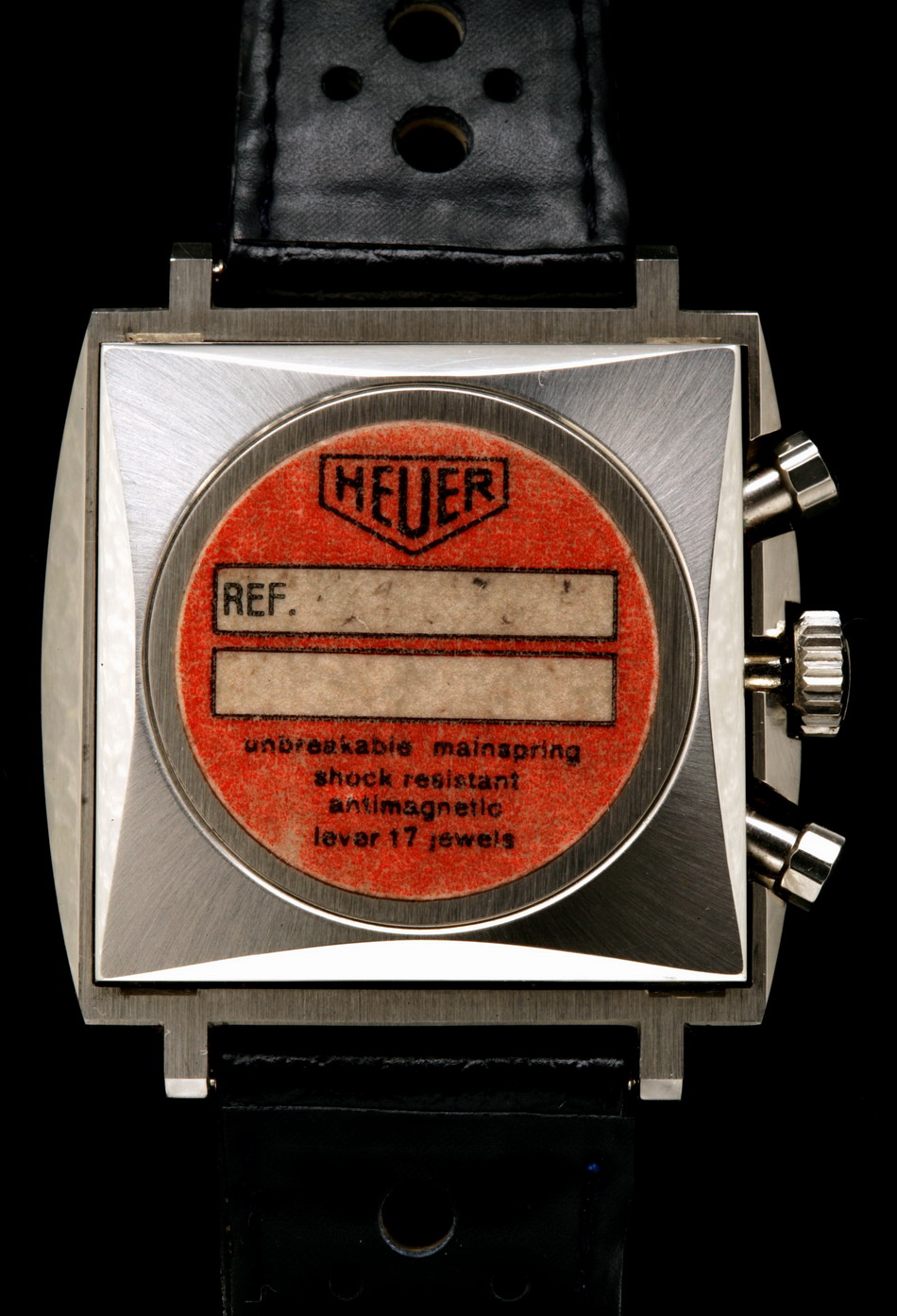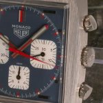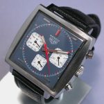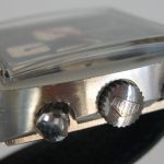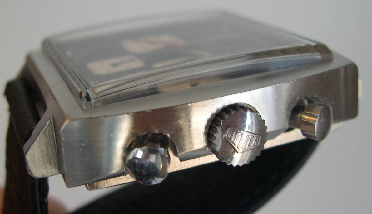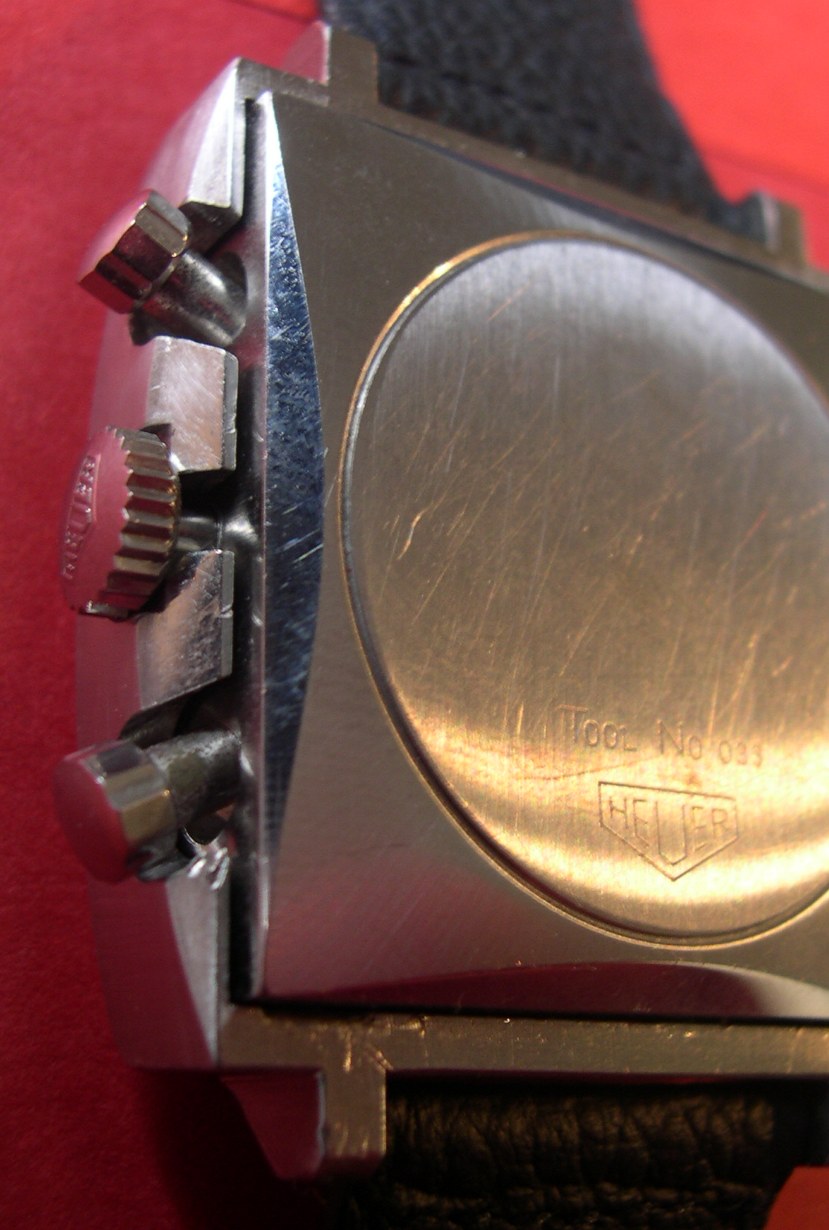 Blue dial with white registers; brushed steel hands with luminous and red inserts, and red triangular tips