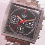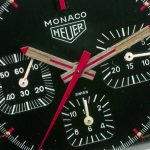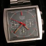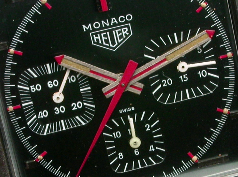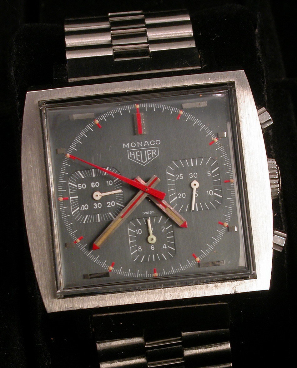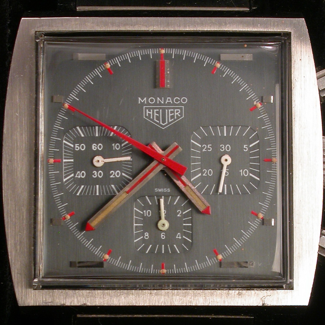 Grey dial with grey registers; brushed steel hands with luminous and red inserts, and red triangular tips
