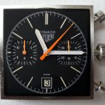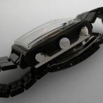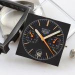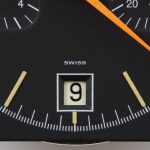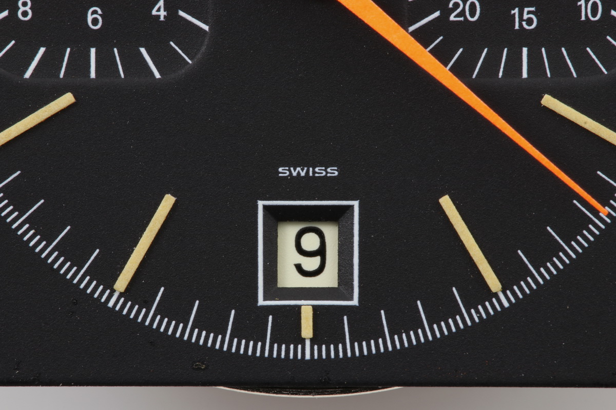 Black dial and regsiters; applied luminous markers; main hands painted white; chronograph needles painted orange