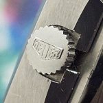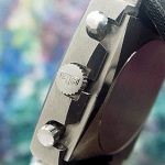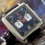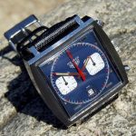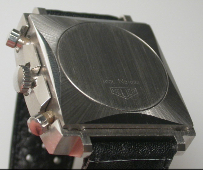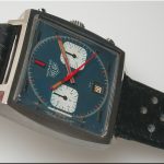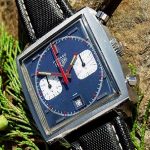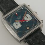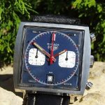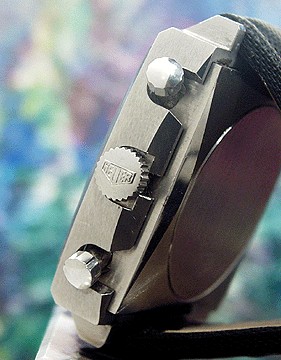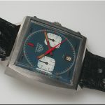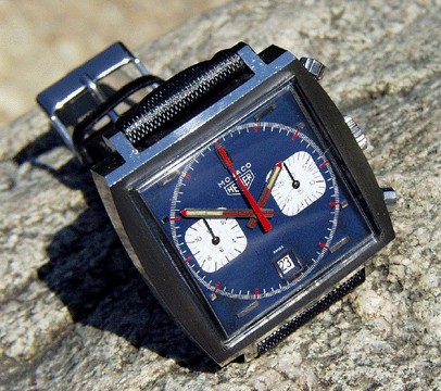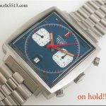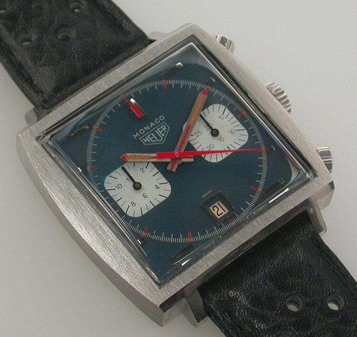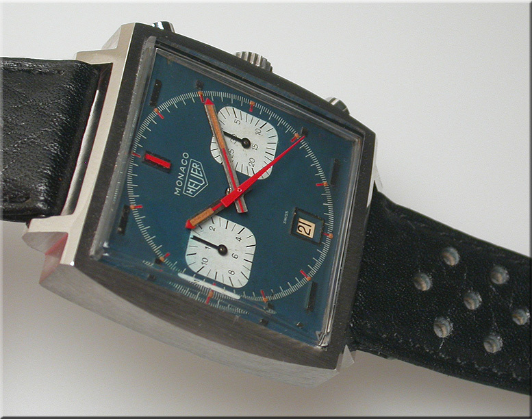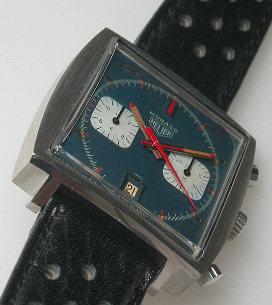 Blue dial with white registers; brushed steel hands with luminous and red inserts, and red triangular tips