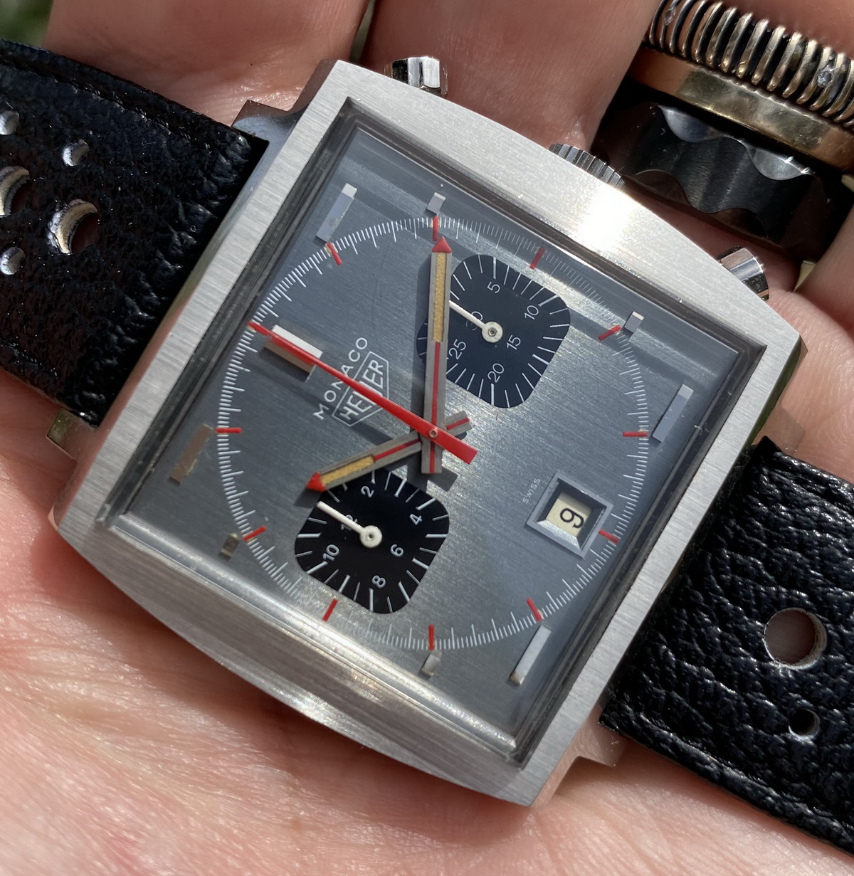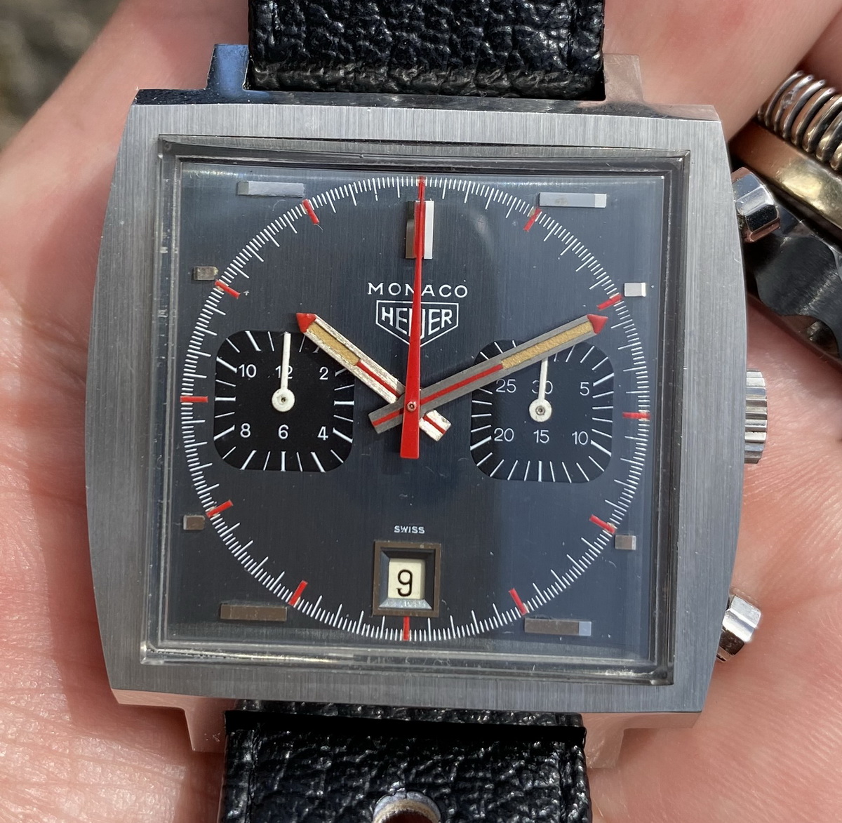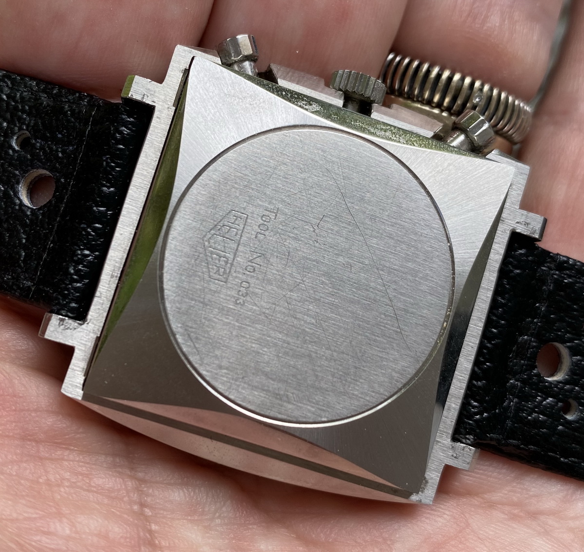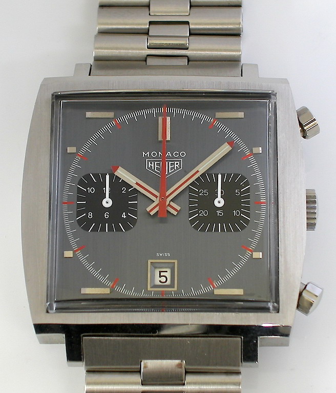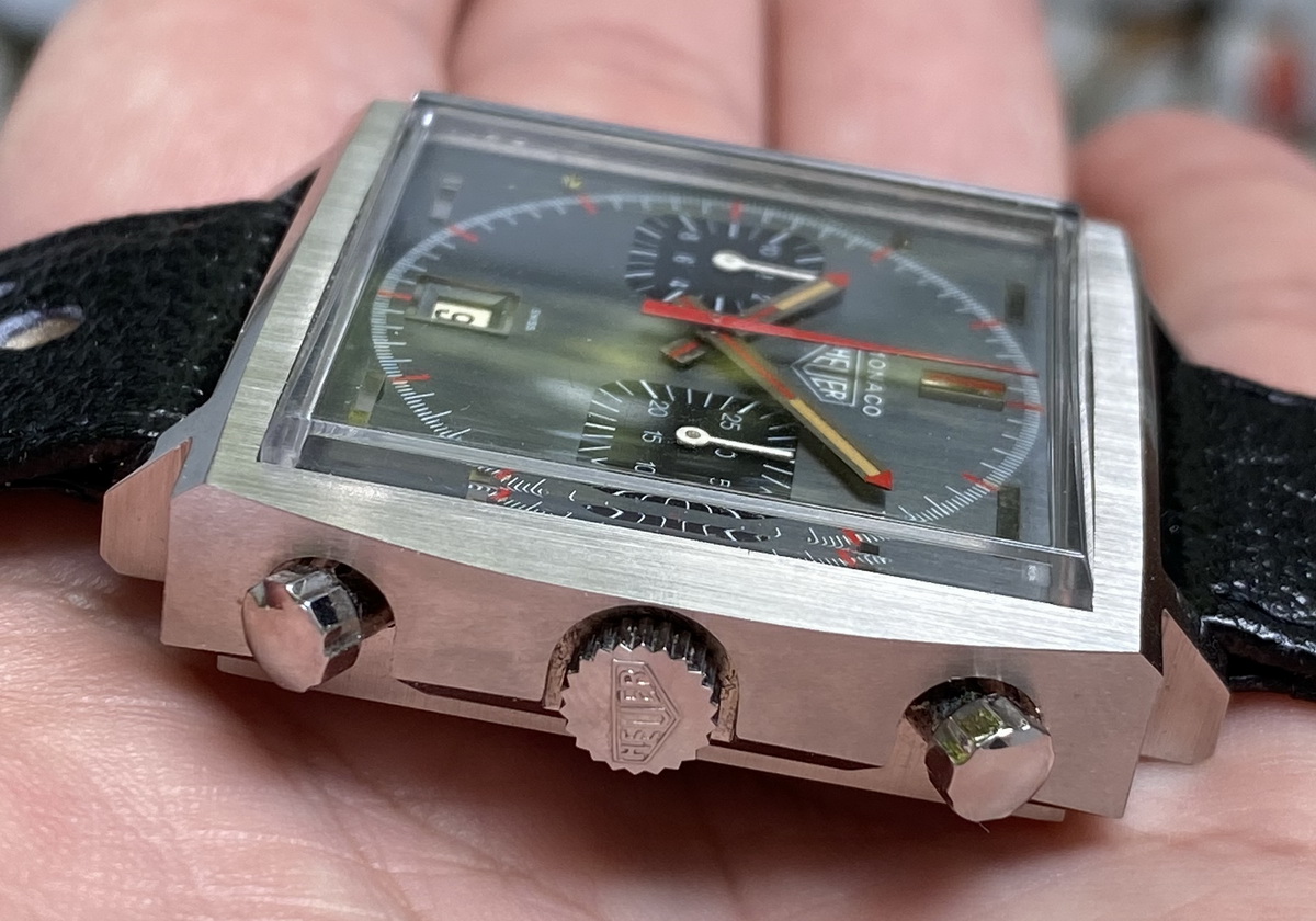 One of the rarest Heuer chronographs. Crown at the 3 o'clock position.