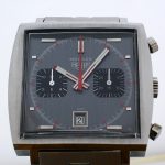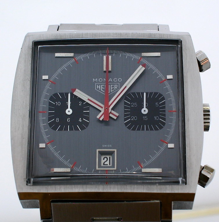 Grey dial with black registers; brushed steel hands with luminous and red inserts, and red triangular tips