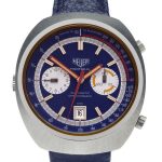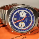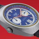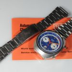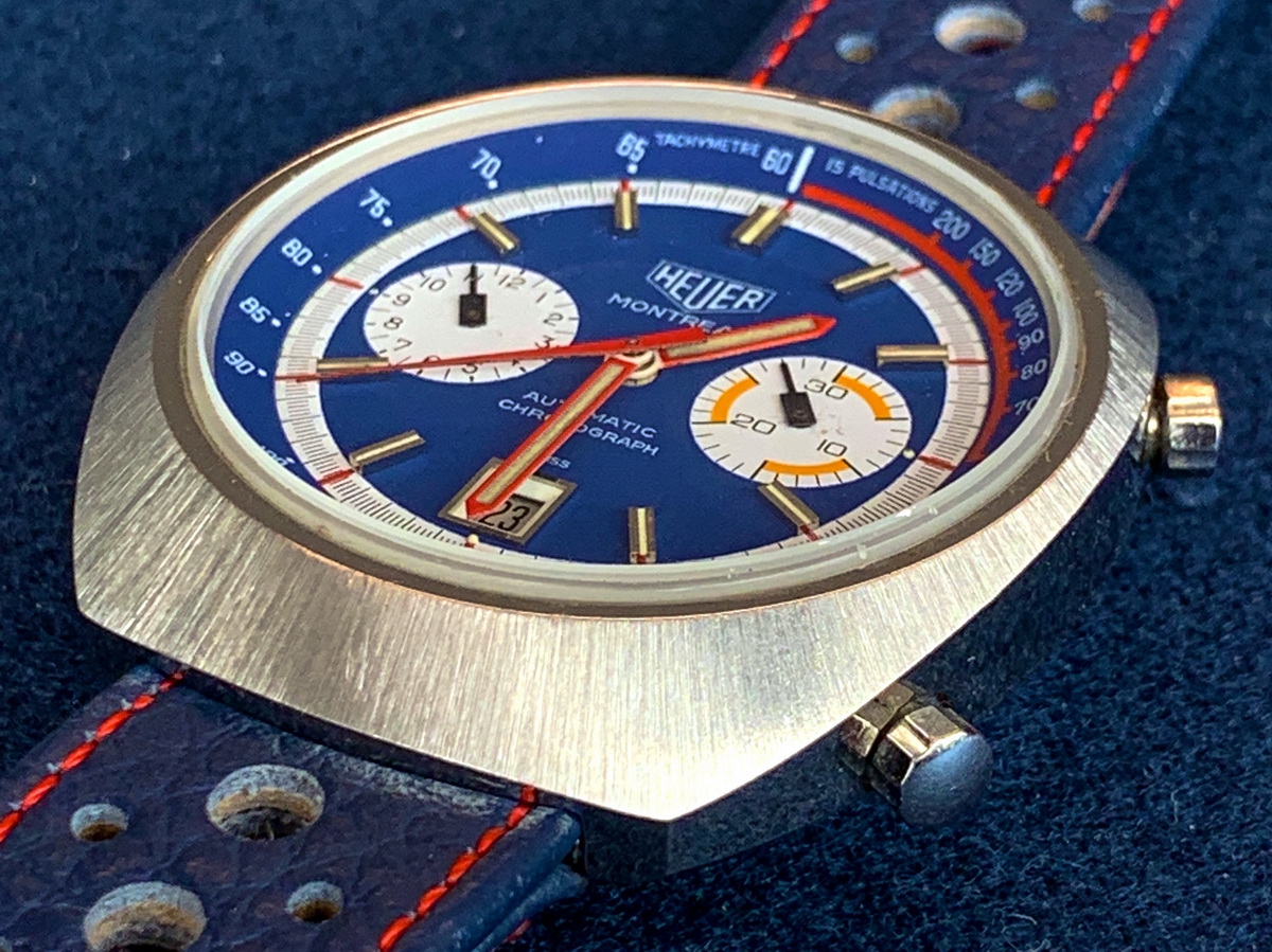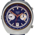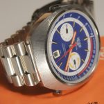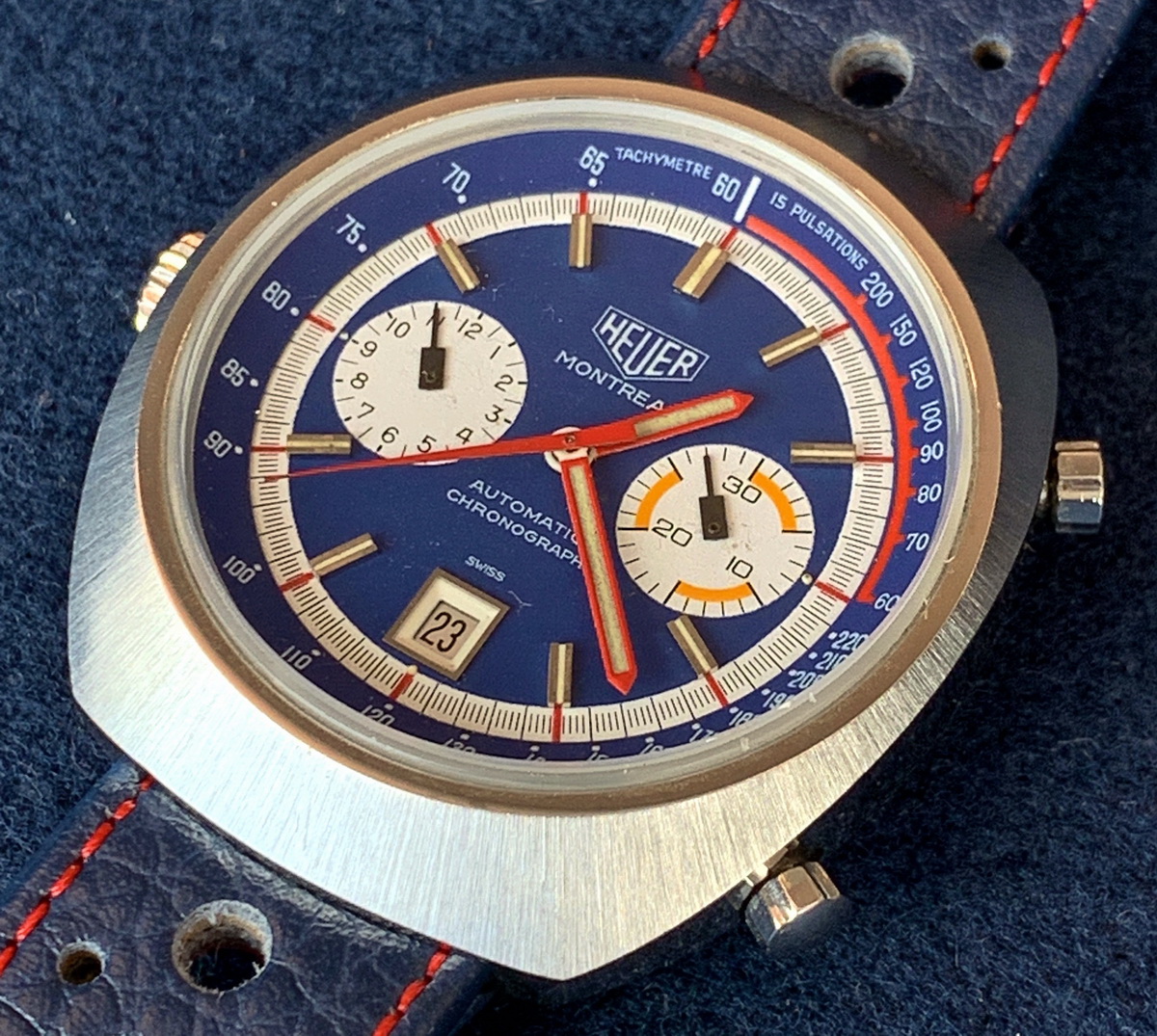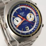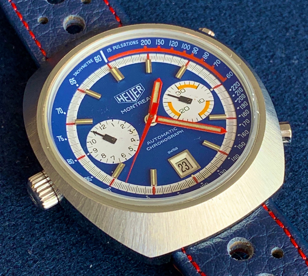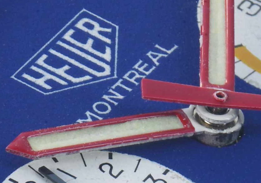 Blue dial, with white registers and applied markers; blue inner bezel; red hands with lume inserts