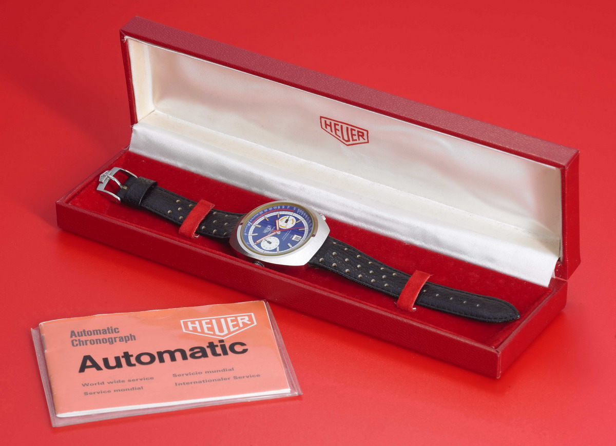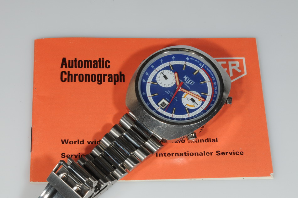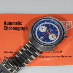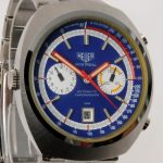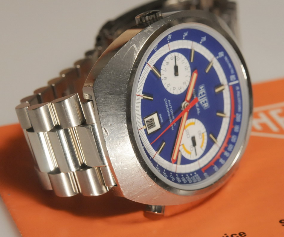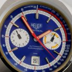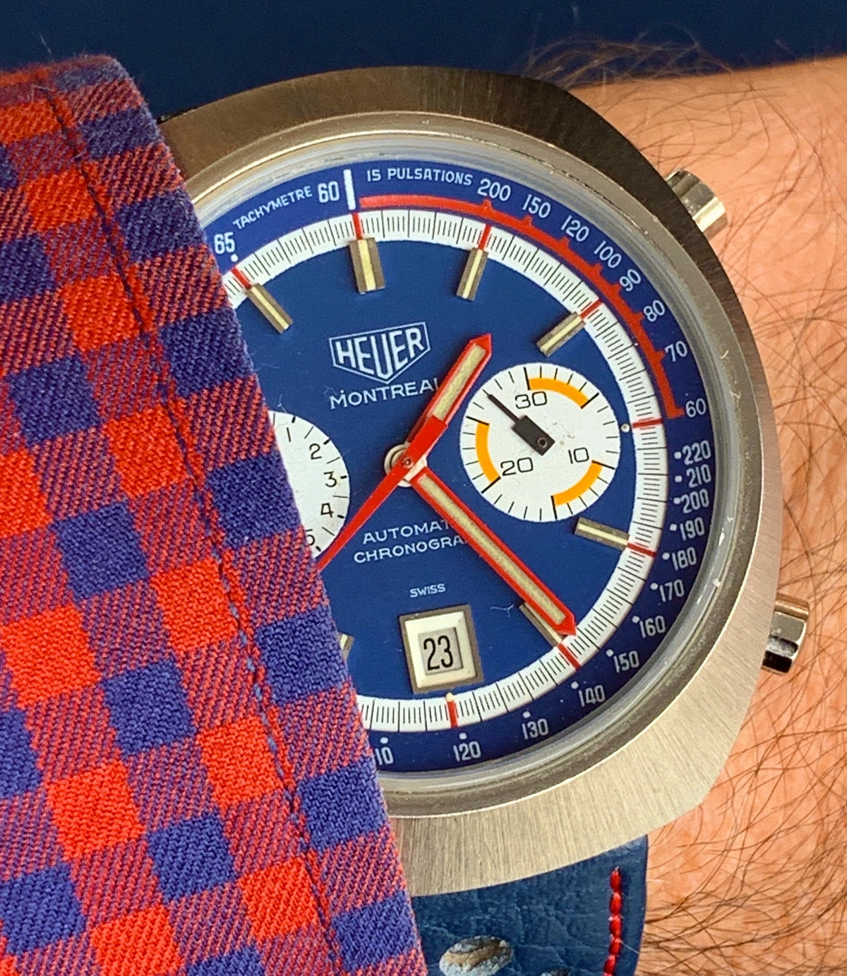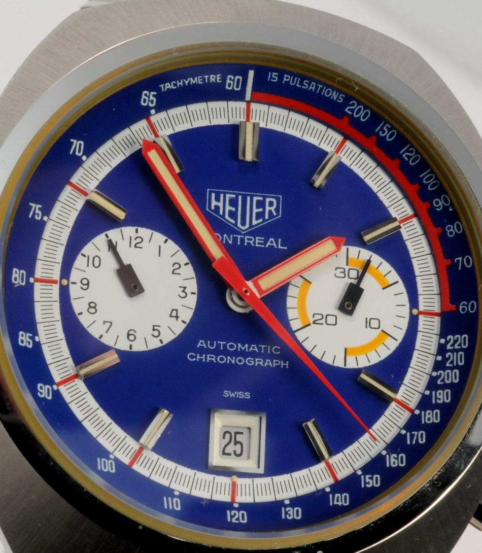 Blue dial, with white registers and applied markers; blue inner bezel; red hands with lume inserts