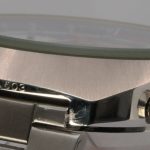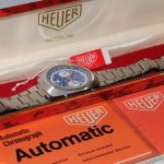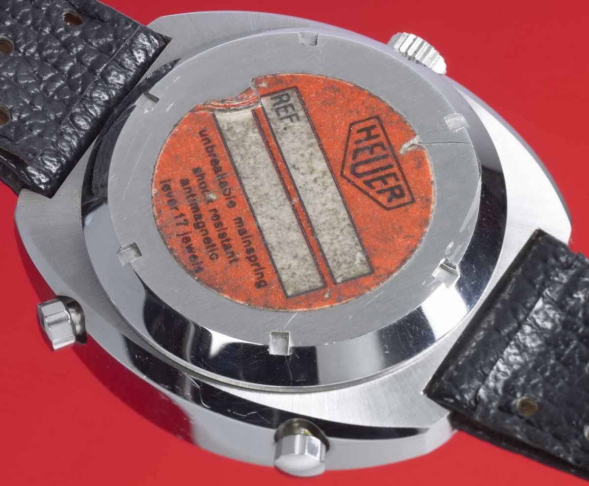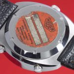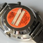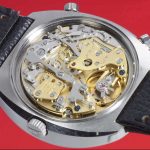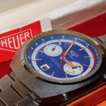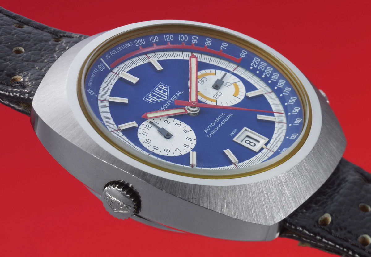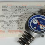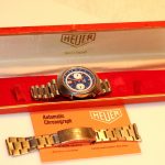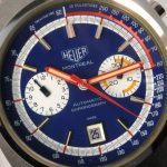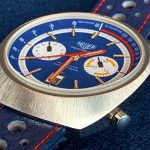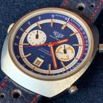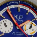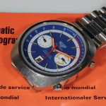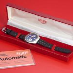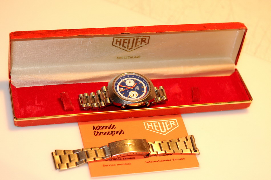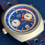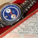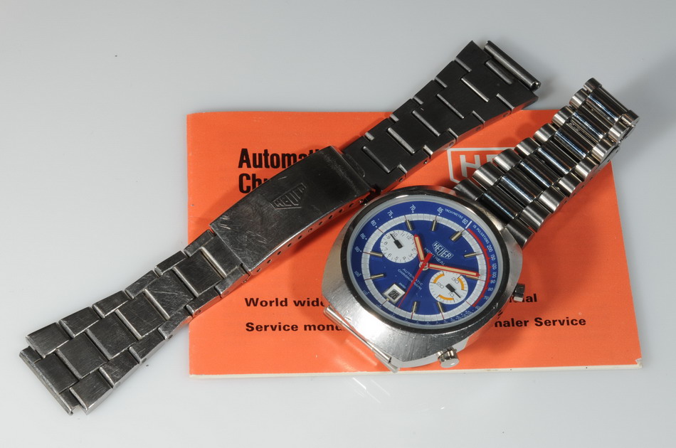Blue dial, with white registers and applied markers; blue inner bezel; red hands with lume inserts