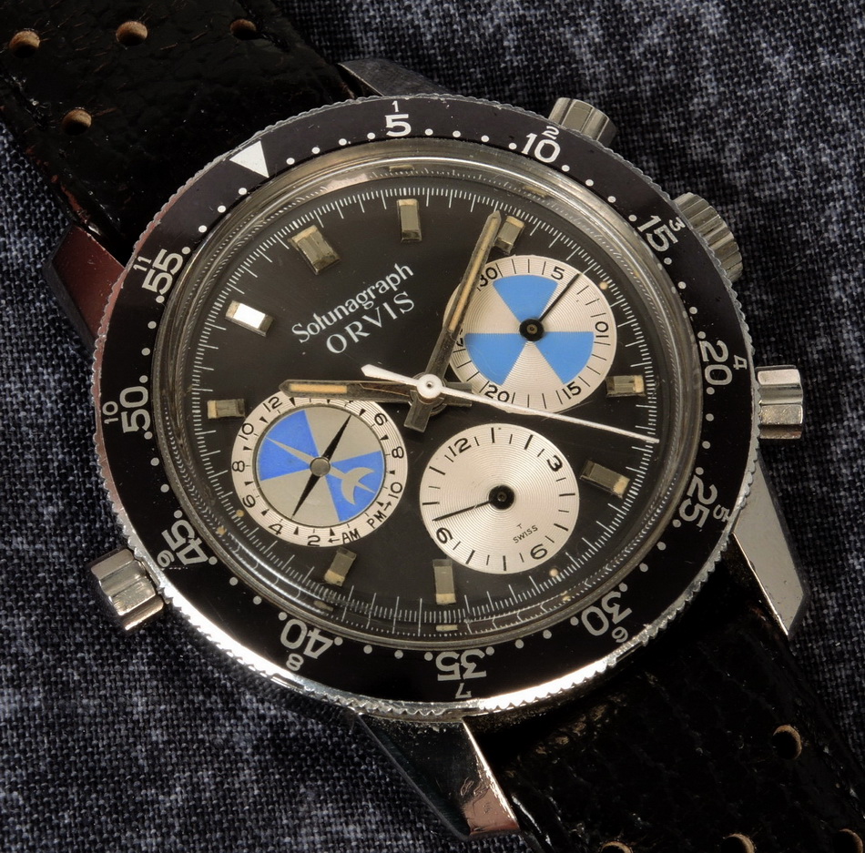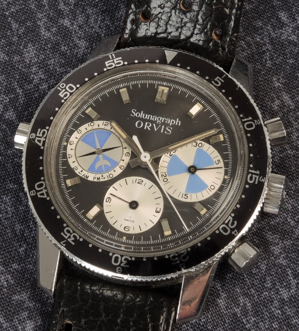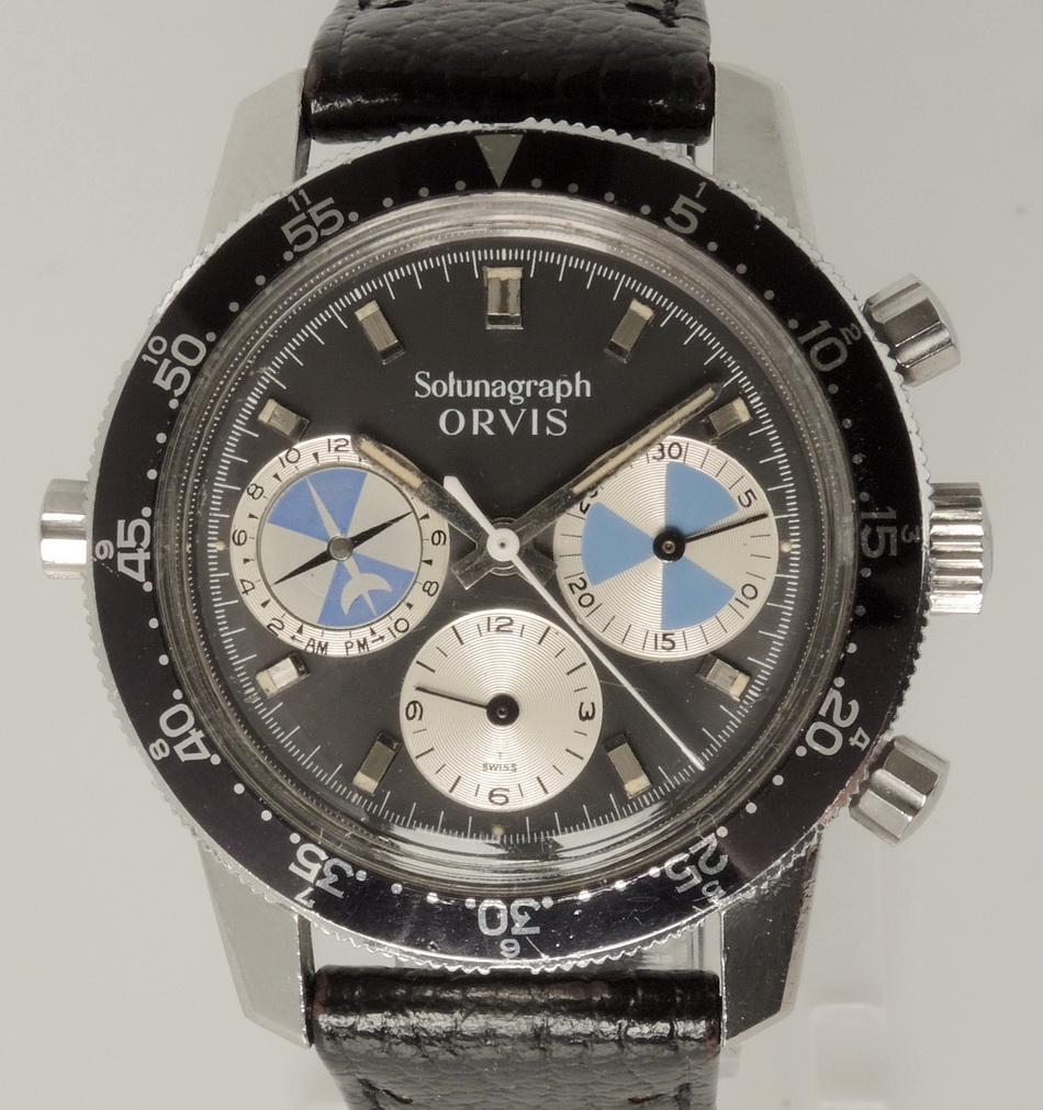 First execution of Orvis Solunagraph uses Autavia 2446C (compressor) case and has polished steel hands; no waves (lines) on tide dial; MH bezel