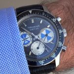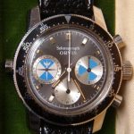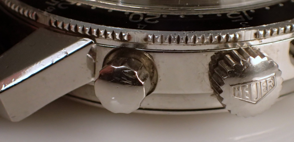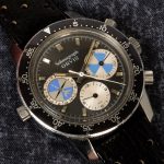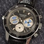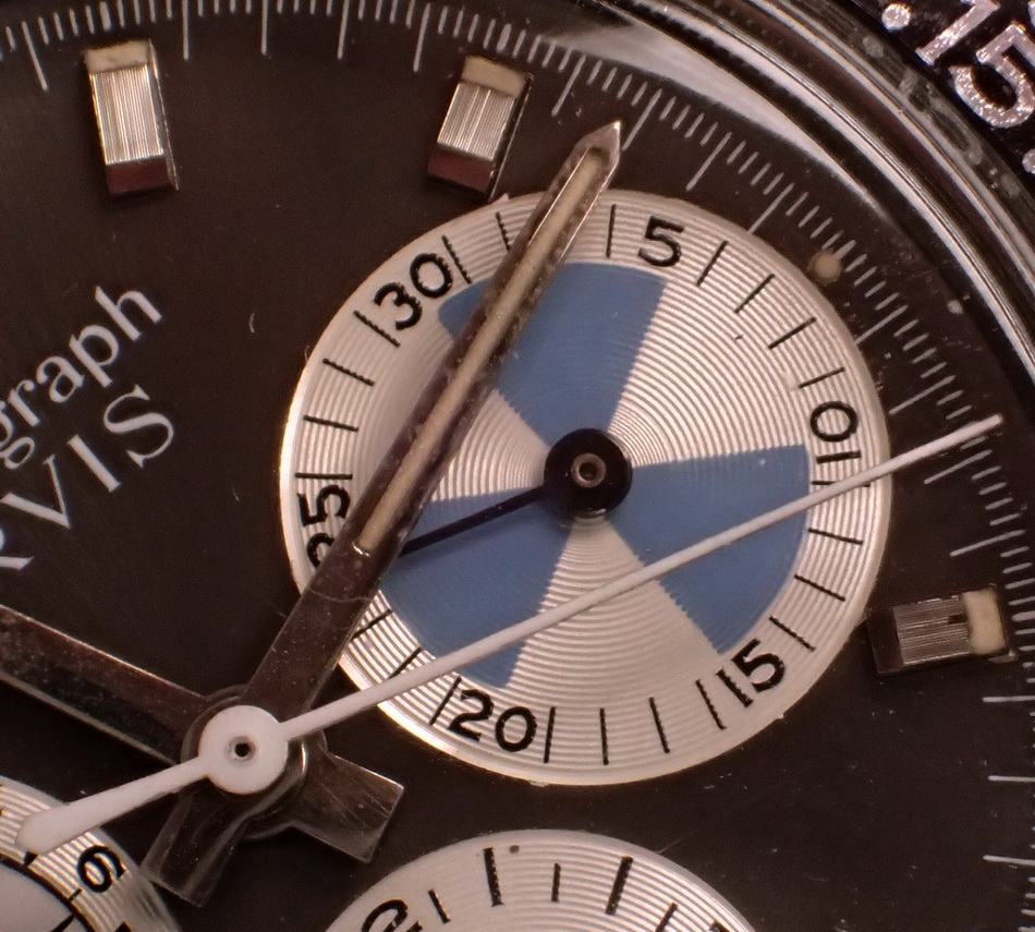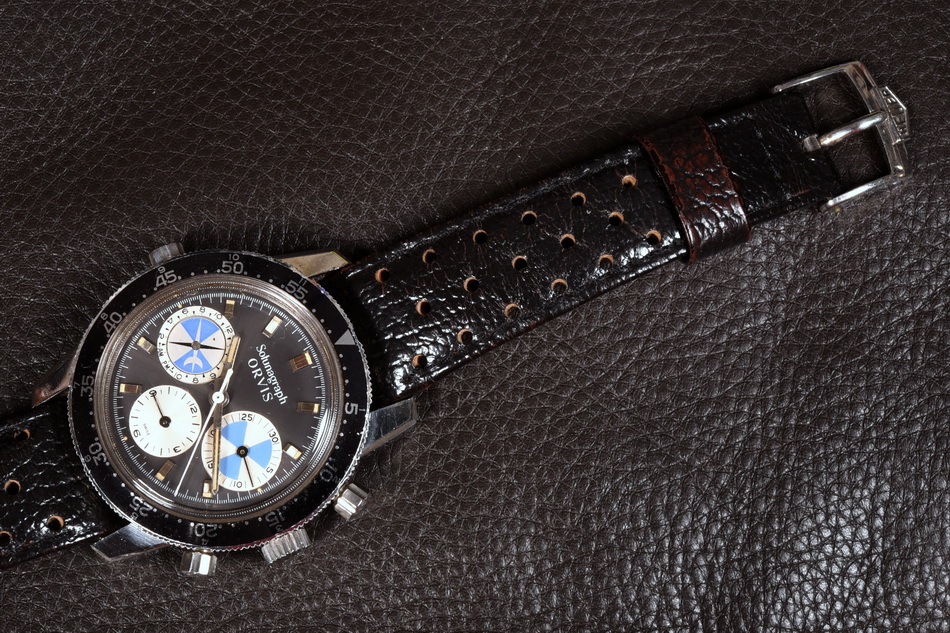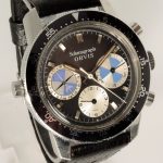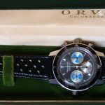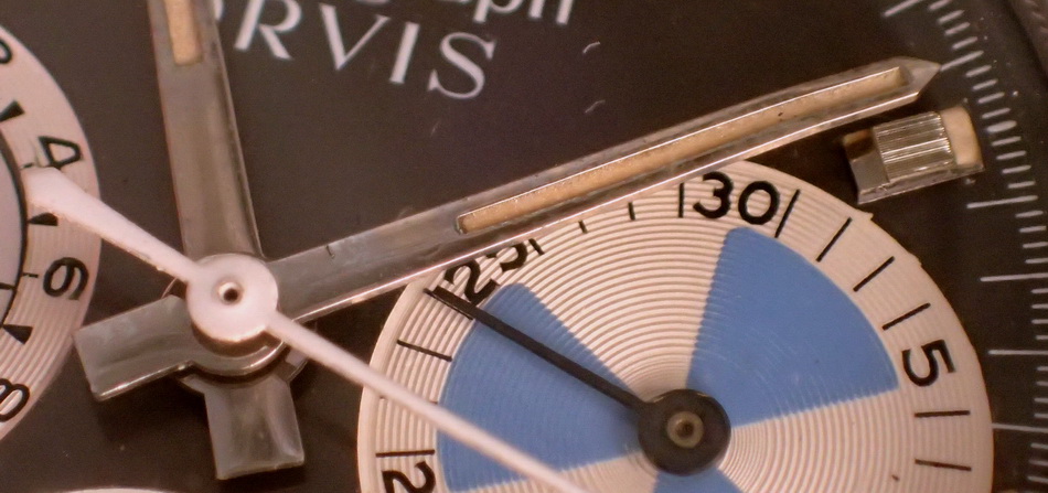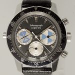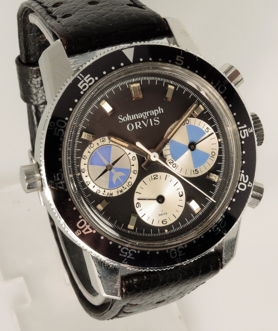 First execution of Orvis Solunagraph uses Autavia 2446C (compressor) case and has polished steel hands; no waves (lines) on tide dial; MH bezel